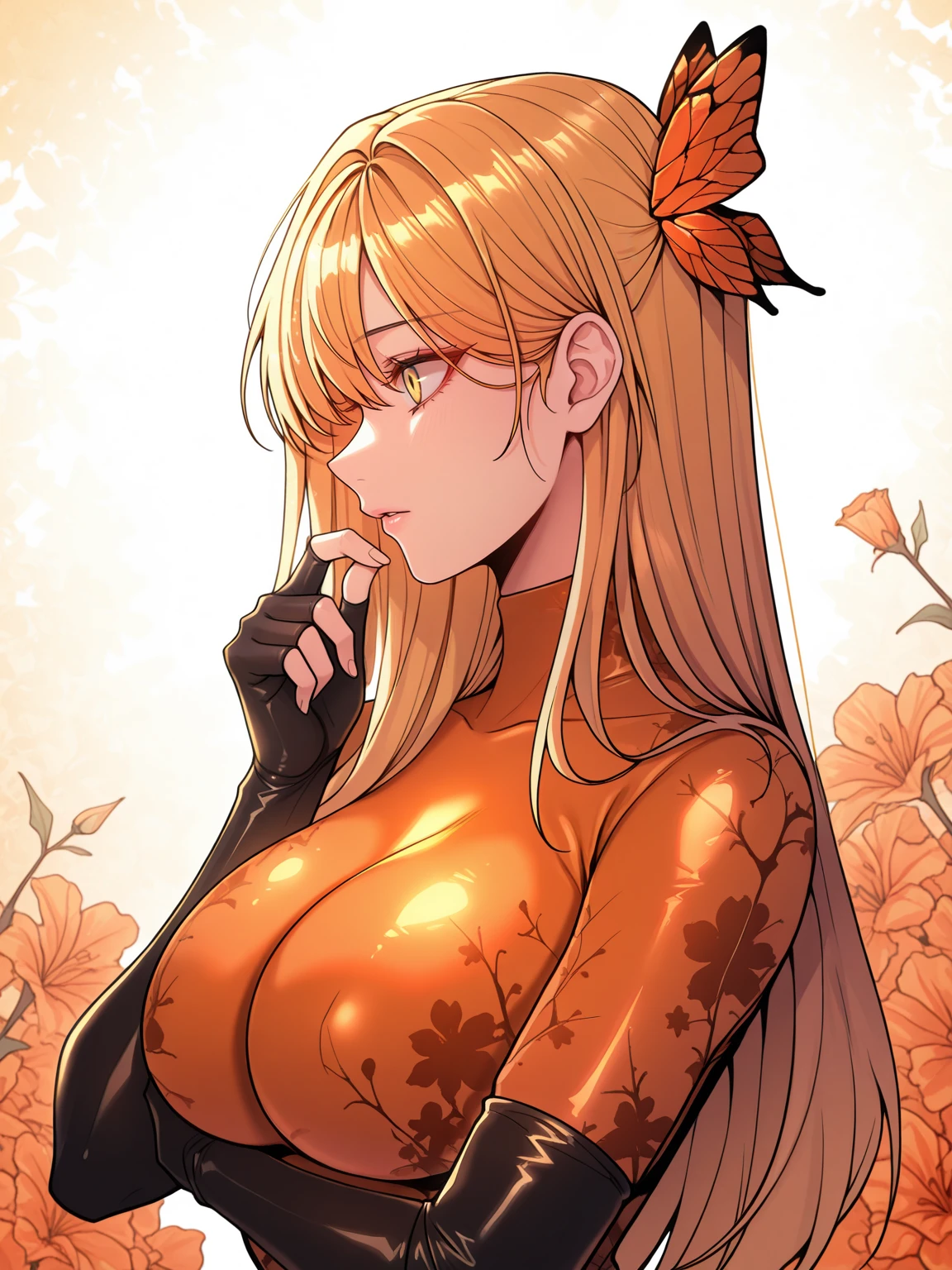 Apperance: hwangdoil, blonde hair, long hair, yellow eyes, butterfly hair ornament, large breasts