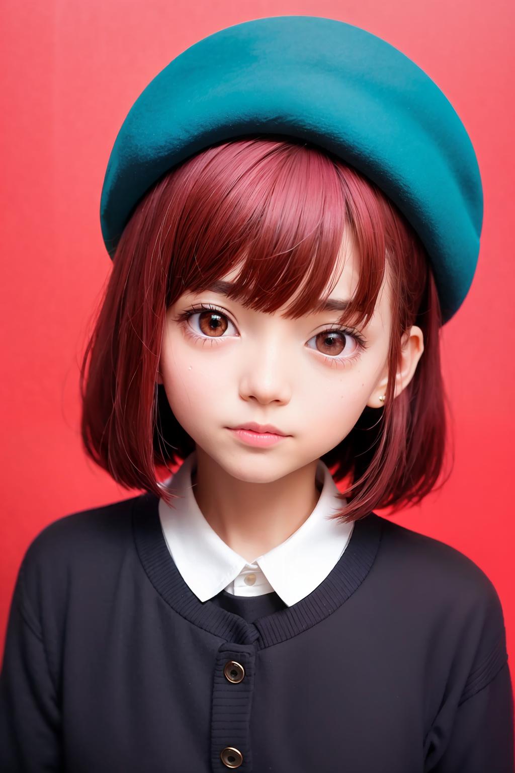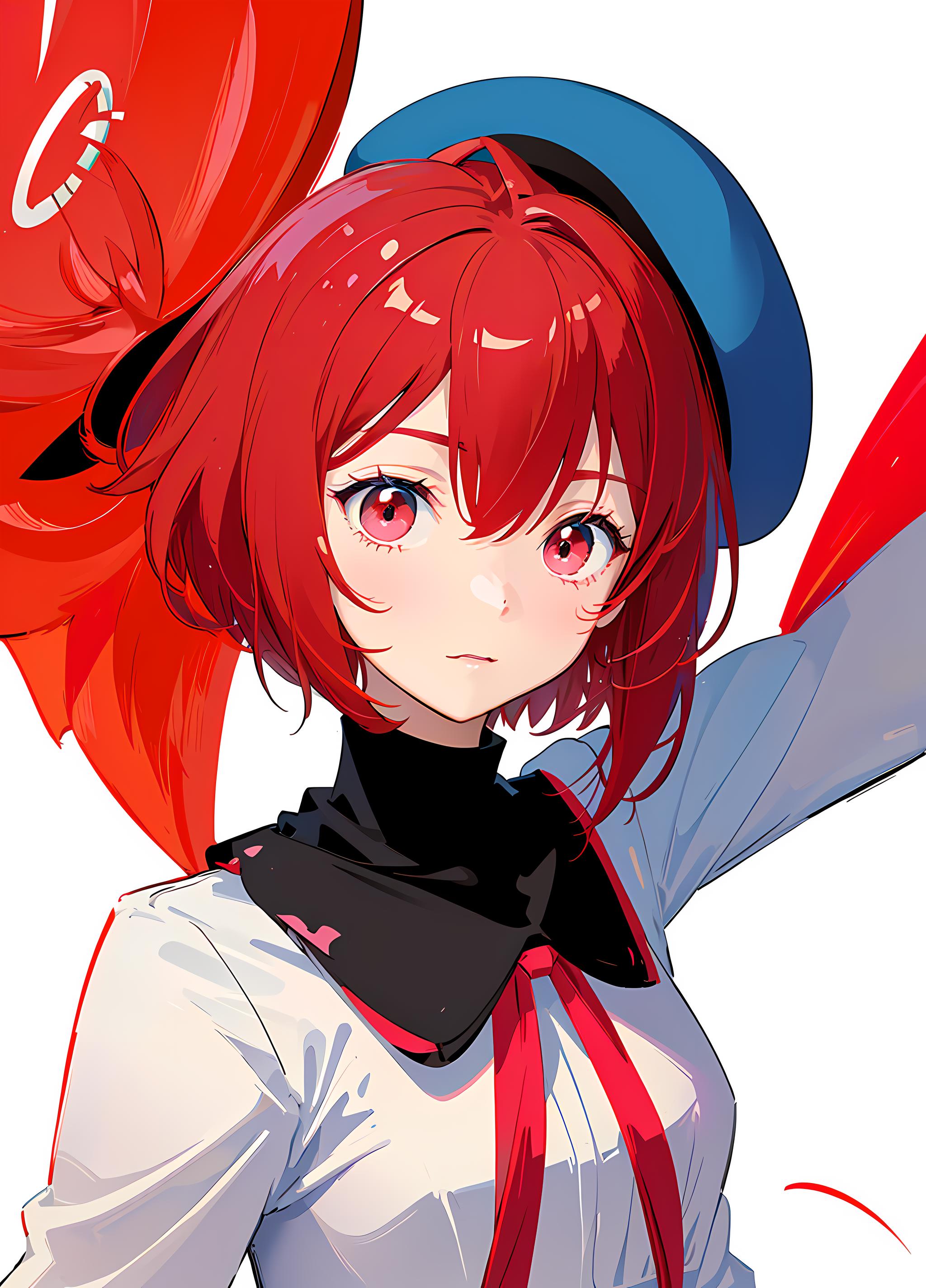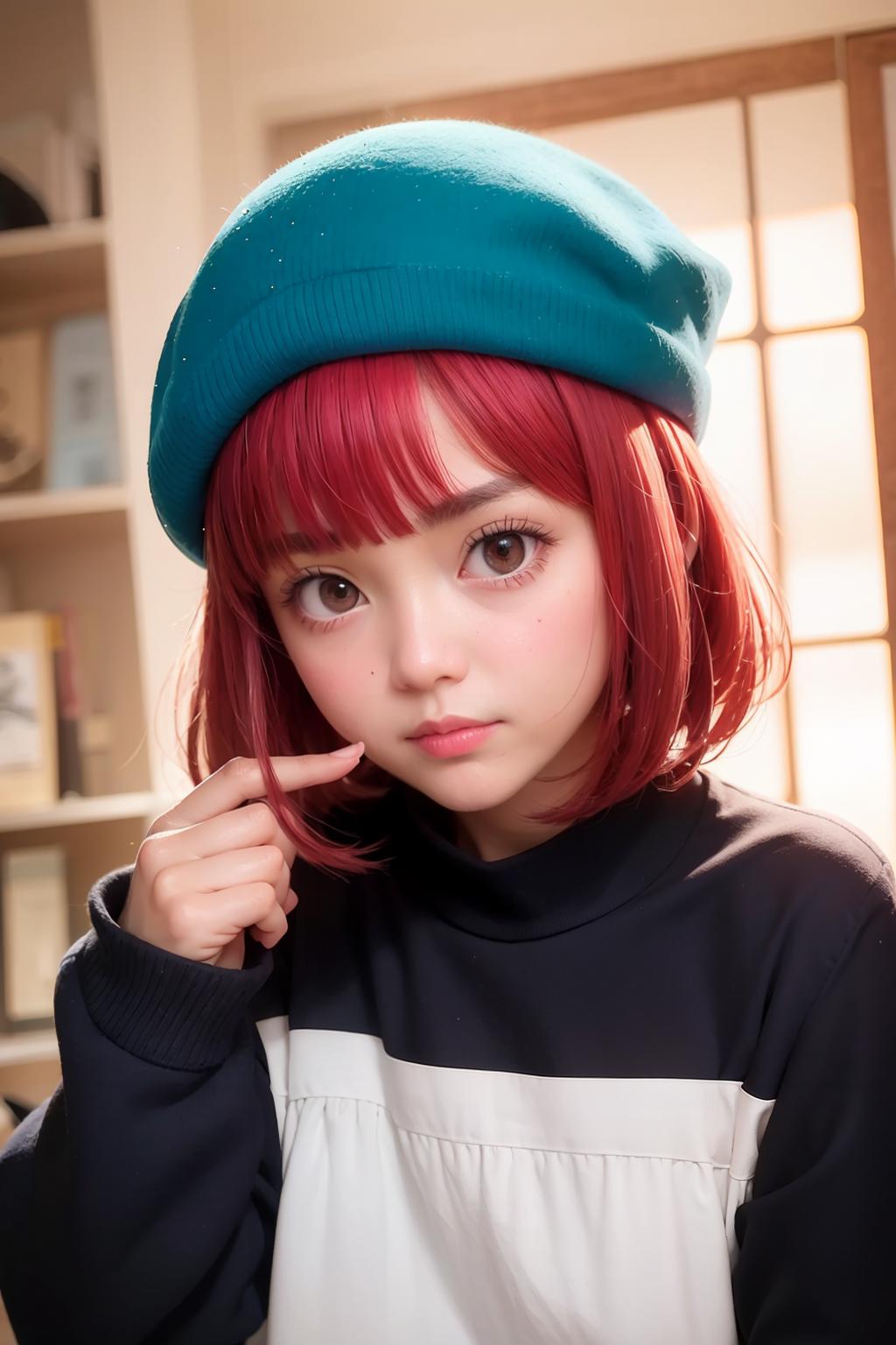 arima kana, big round eyes, vibrant red hair, innocent face, wearing a small blue beret on the side of her head, dark pink eyes, curious face