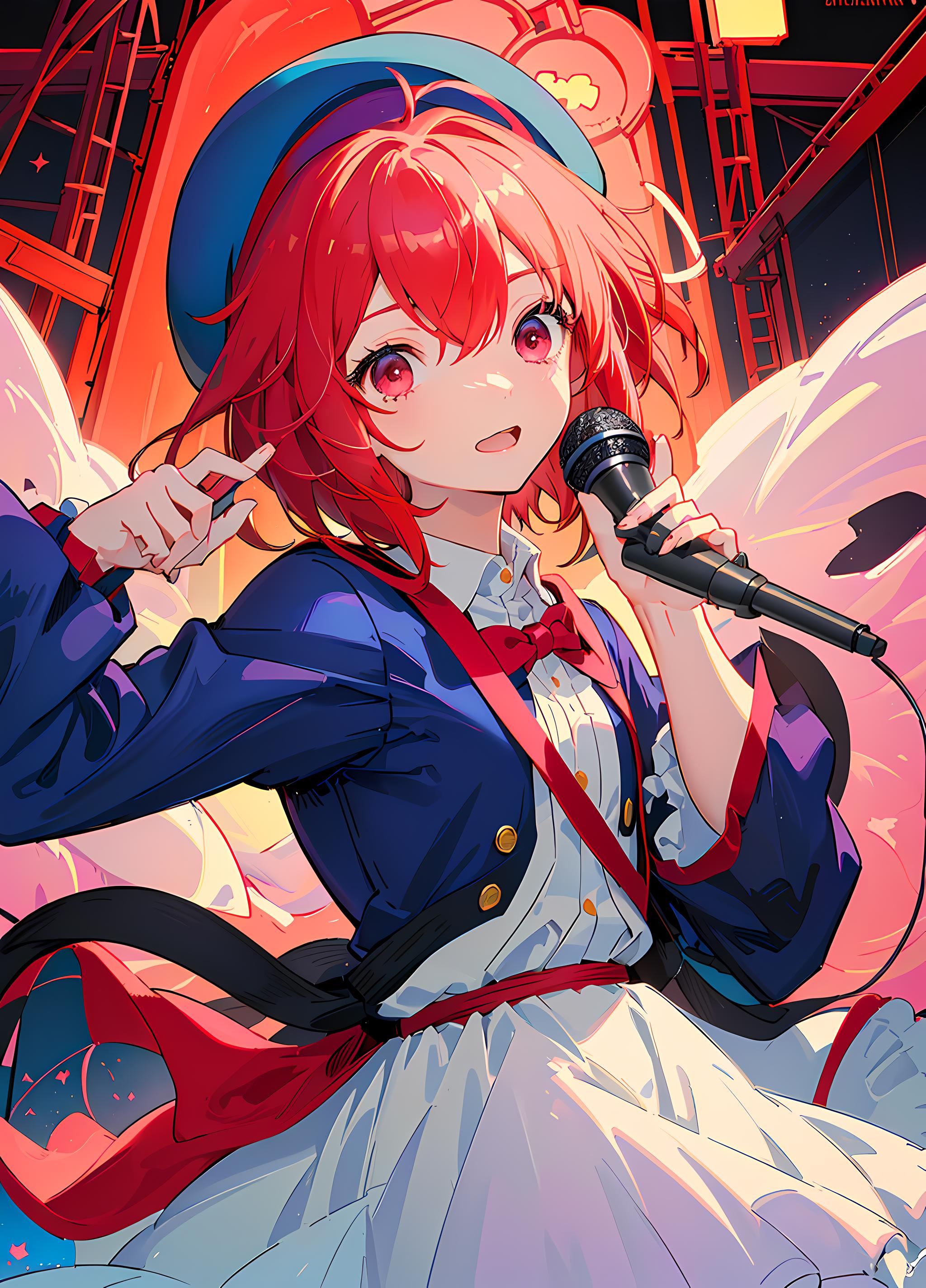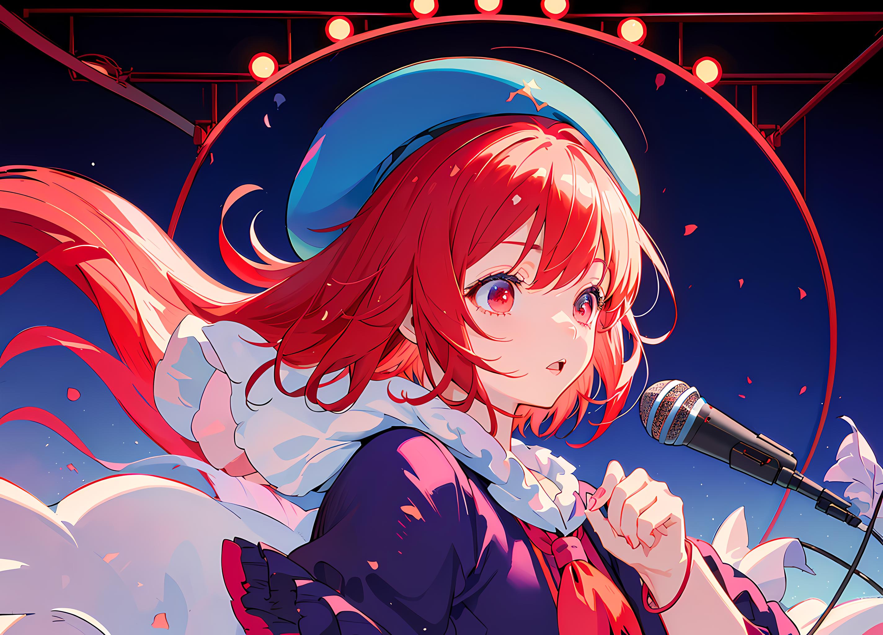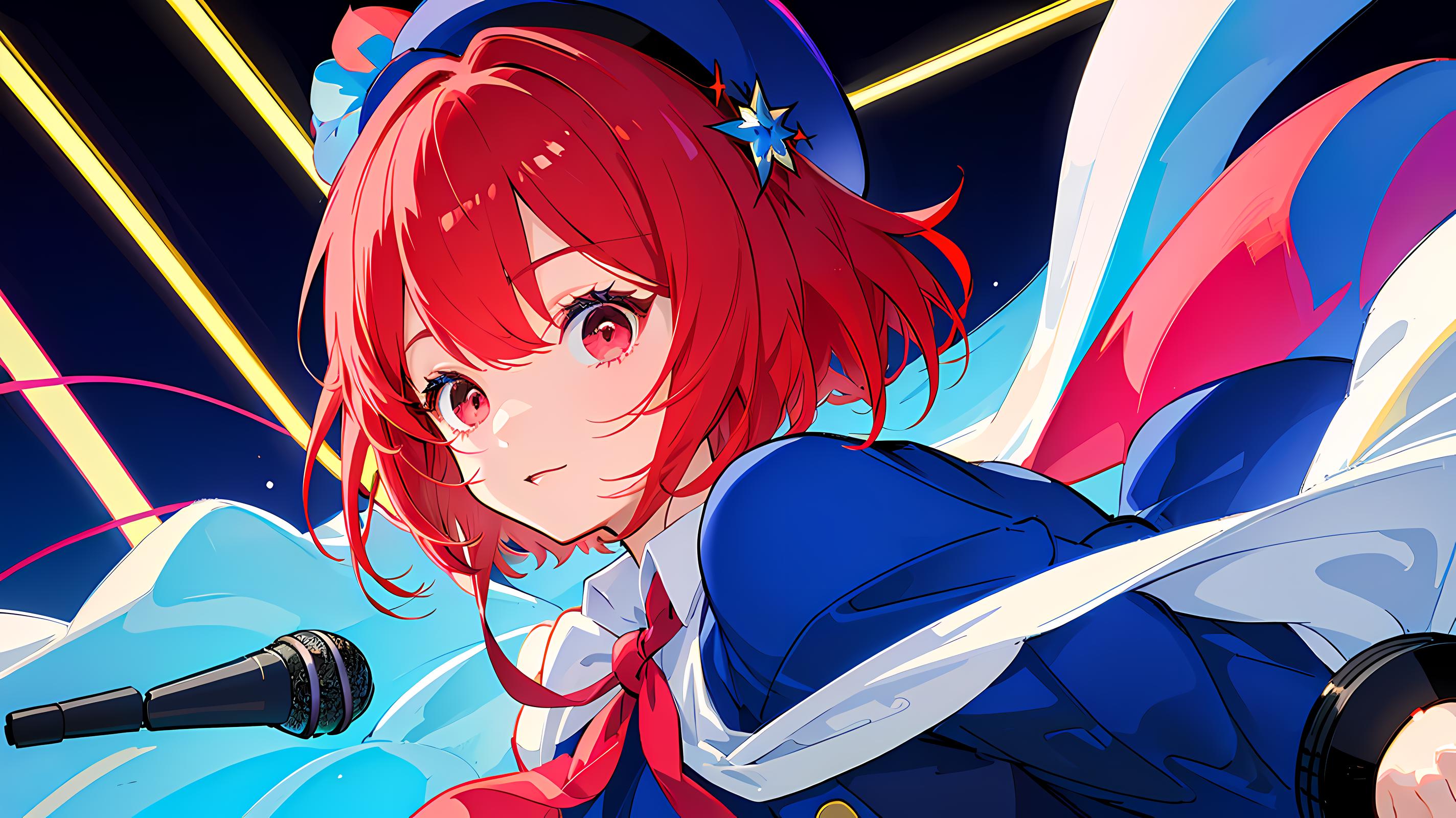 arima kana, big round eyes, vibrant red hair, innocent face, wearing a small blue beret on the side of her head, dark pink eyes, curious face