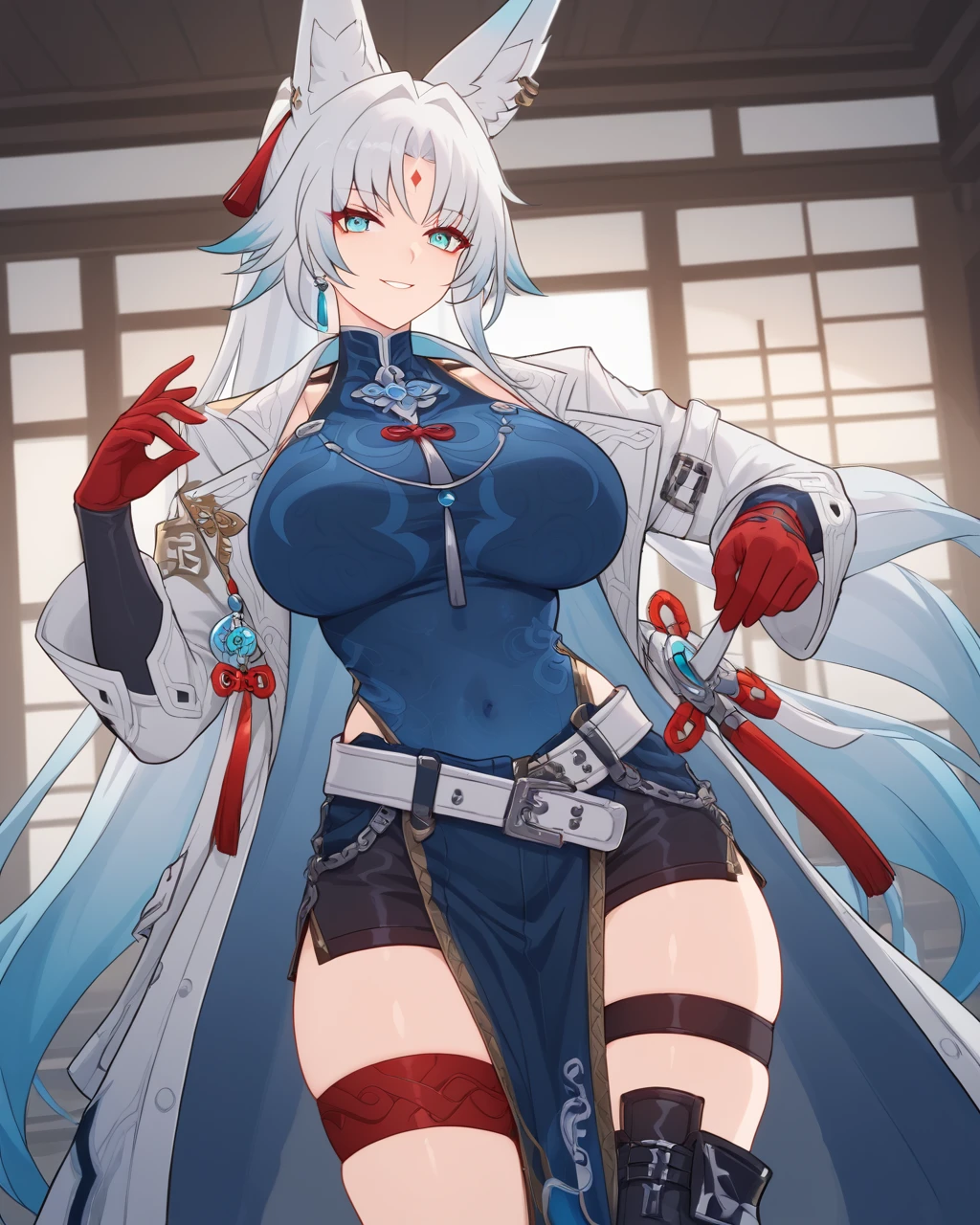 For best result (clothes): belt,black footwear,knee boots,white coat,open clothes,long sleeves,thigh strap,blue dress,red cross,red gloves,chinese clothes,