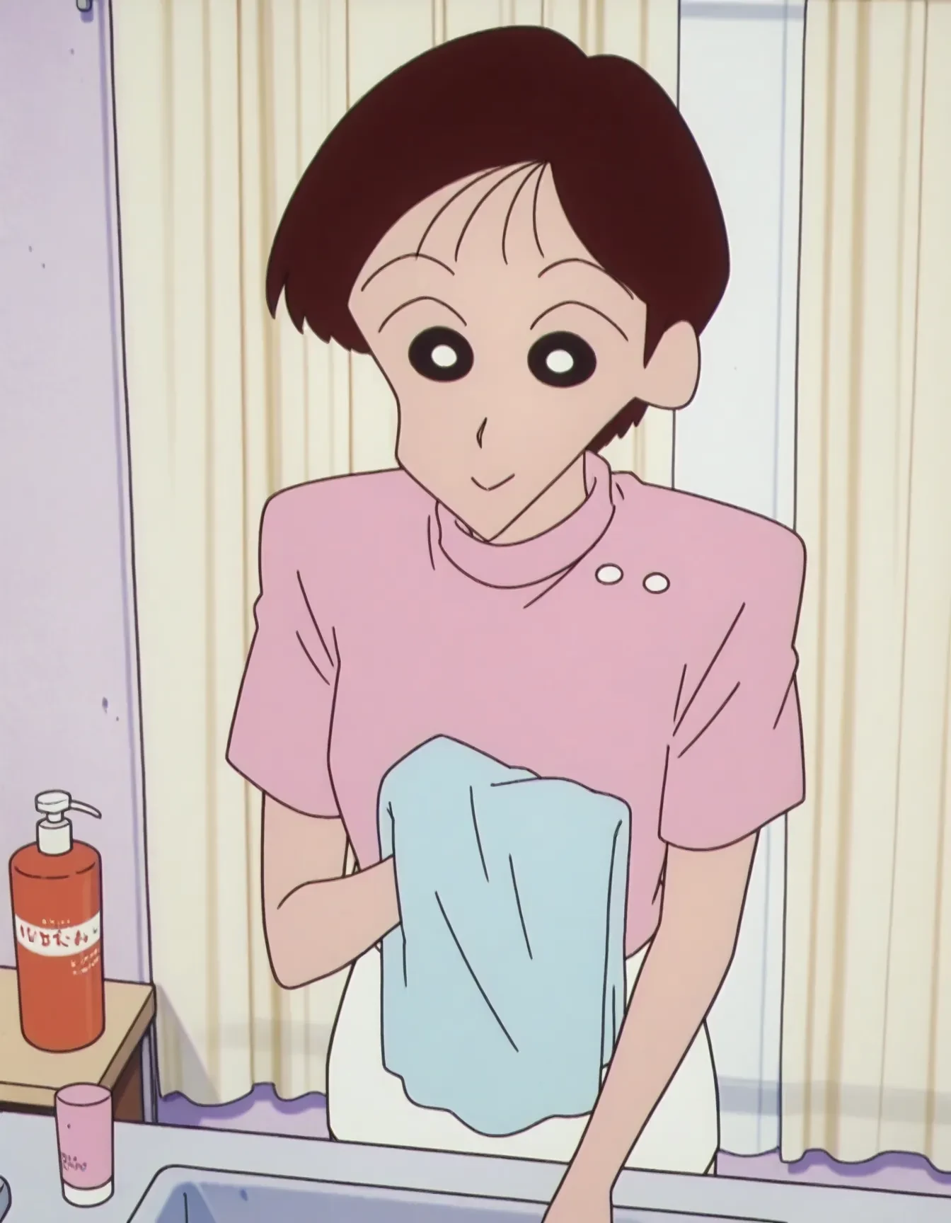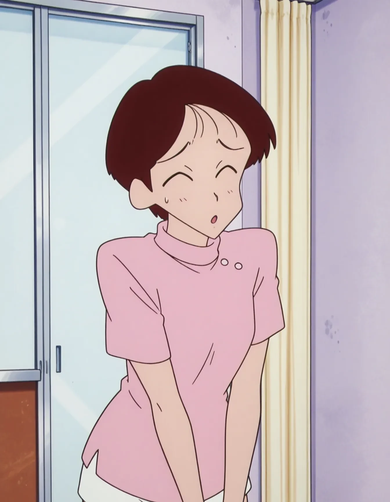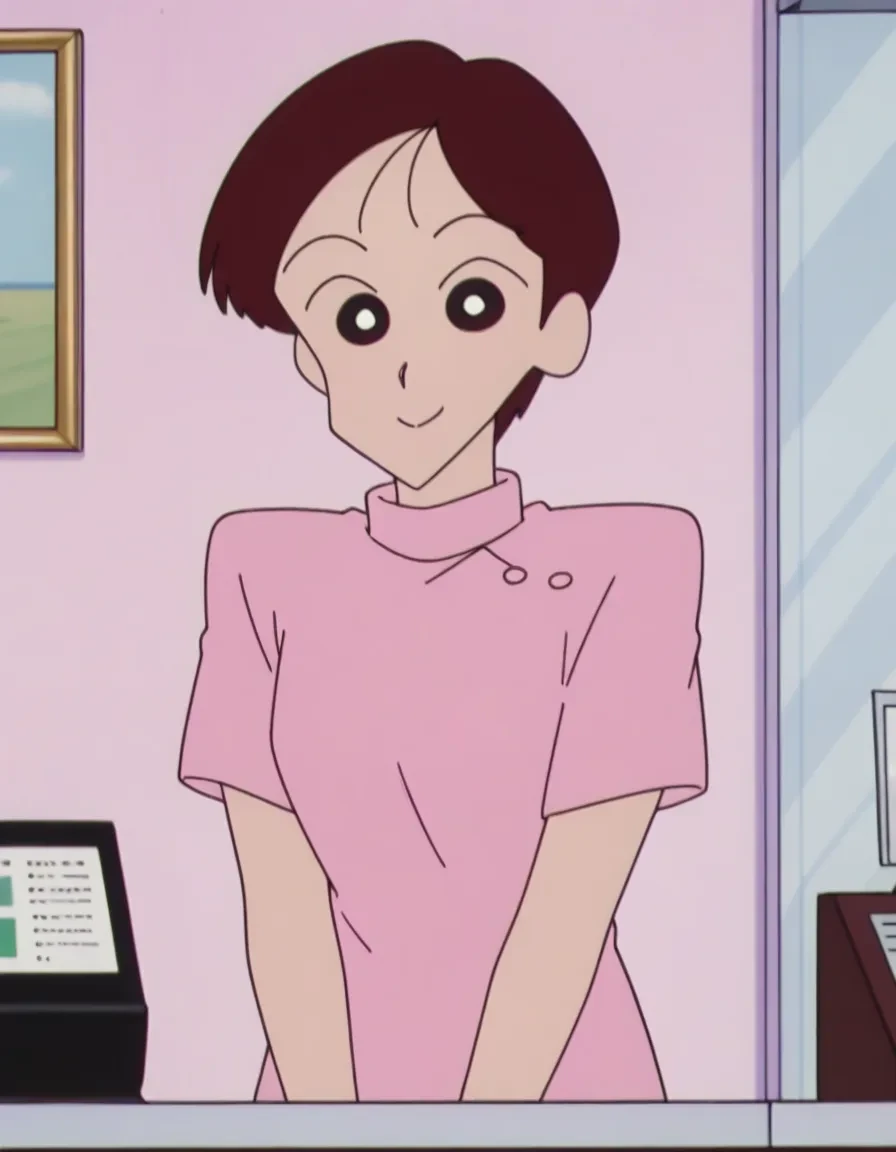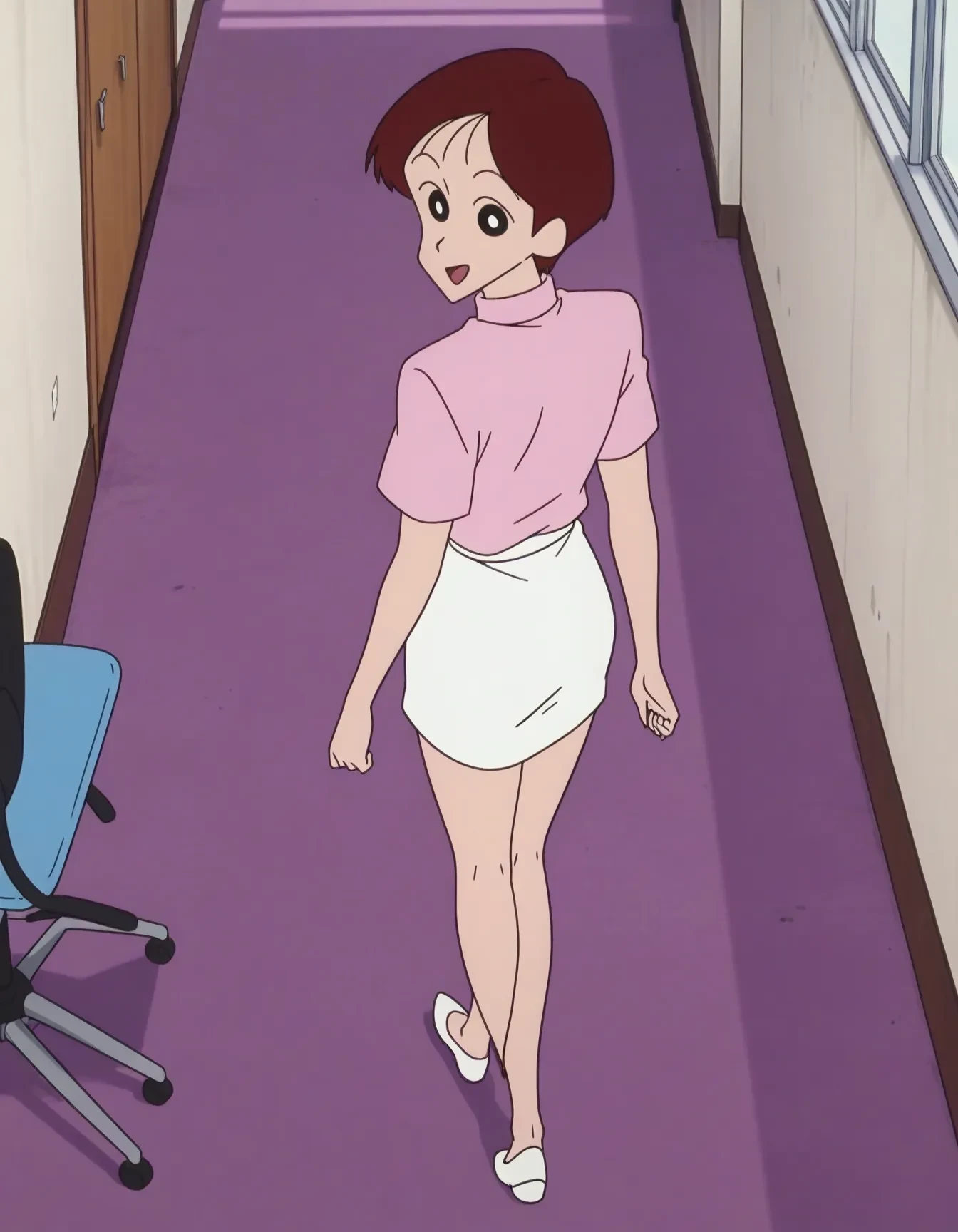 bpp,black hair,red hair,very short hair,parted bangs,black eyes,bright pupils,no sclera,uniform,pink shirt,turtleneck,short sleeves,white miniskirt,pencil skirt,white pumps,