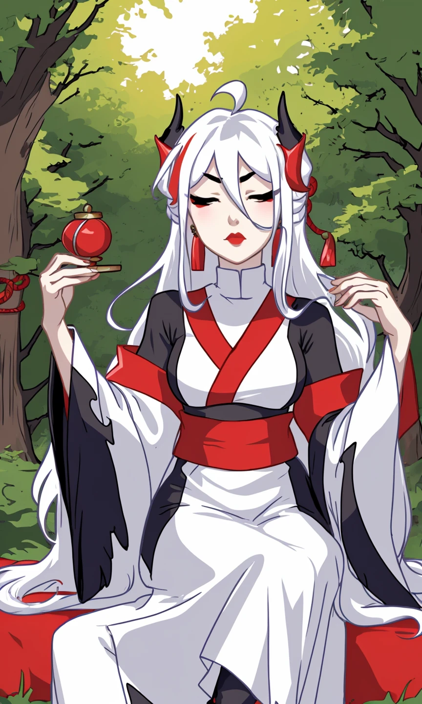 Recommended Tags: Tsuru_(Darmchirk), hair ornament, closed eyes, jewelry, ahoge, multicolored hair, horns, japanese clothes,
