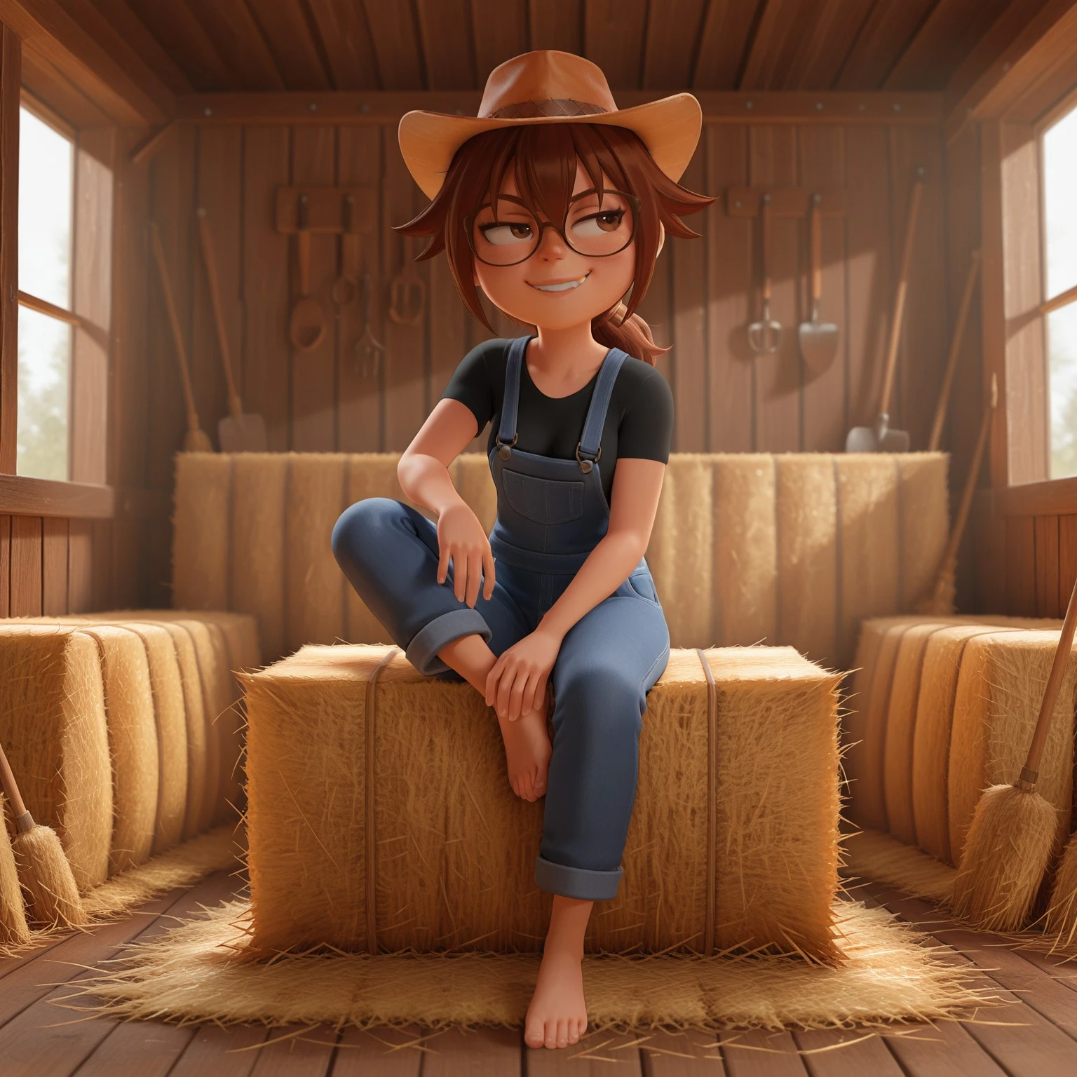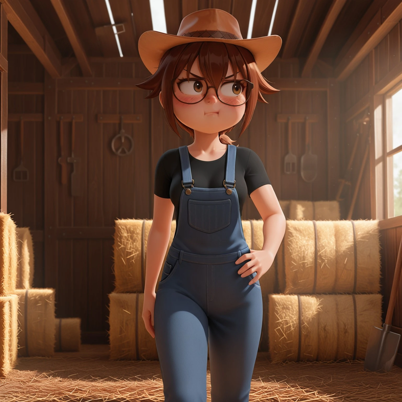 daisy_oc, brown hair, brown eyes, glasses, ponytail, hat, black shirt, overalls
