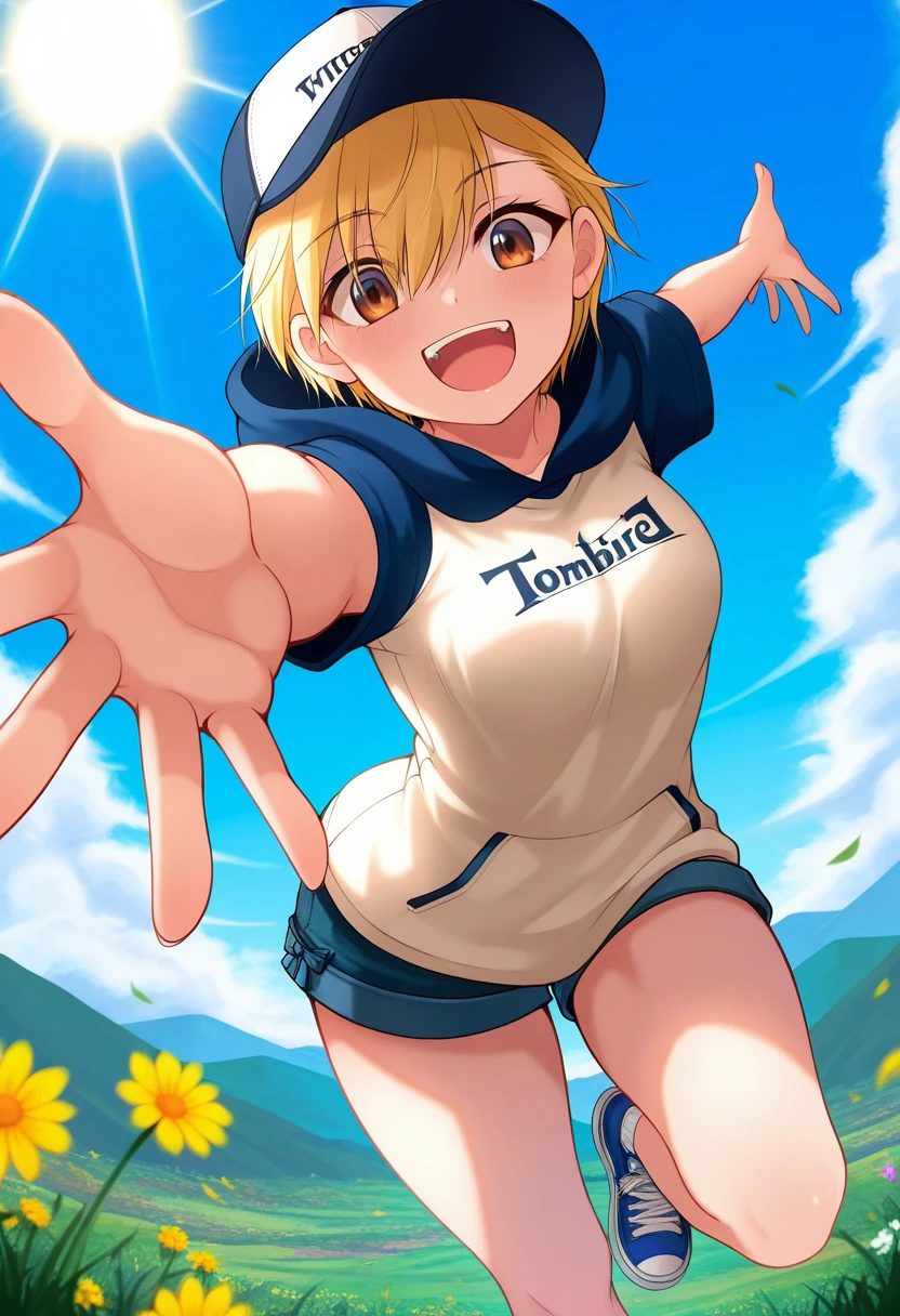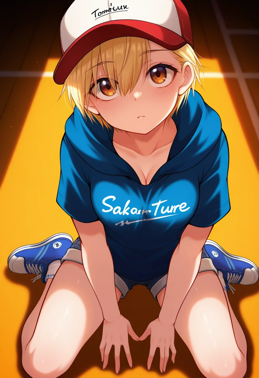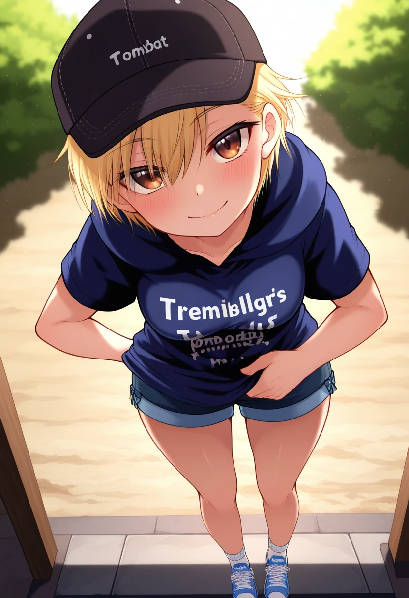 baseball cap, hood, hoodie, hood down, clothes writing, shirt, short sleeves, shorts, short shorts, socks, sneakers,