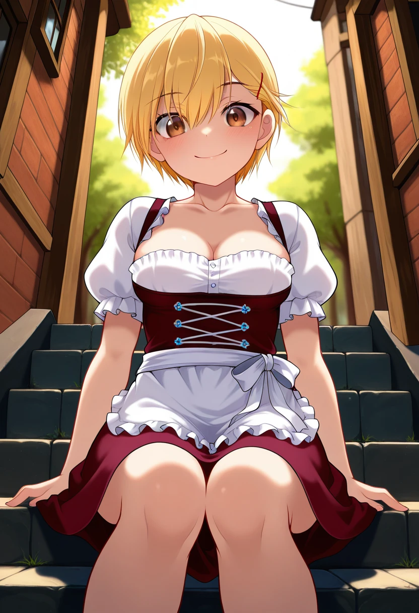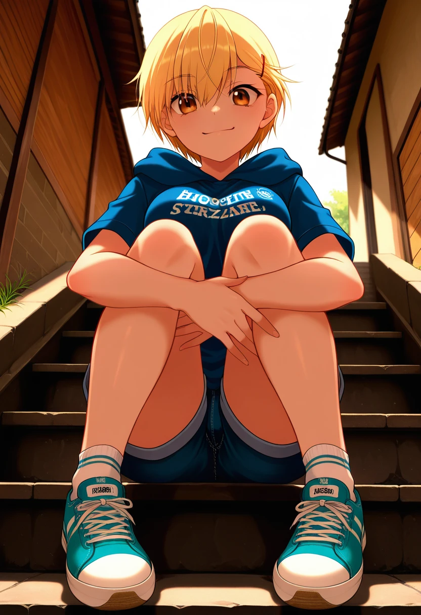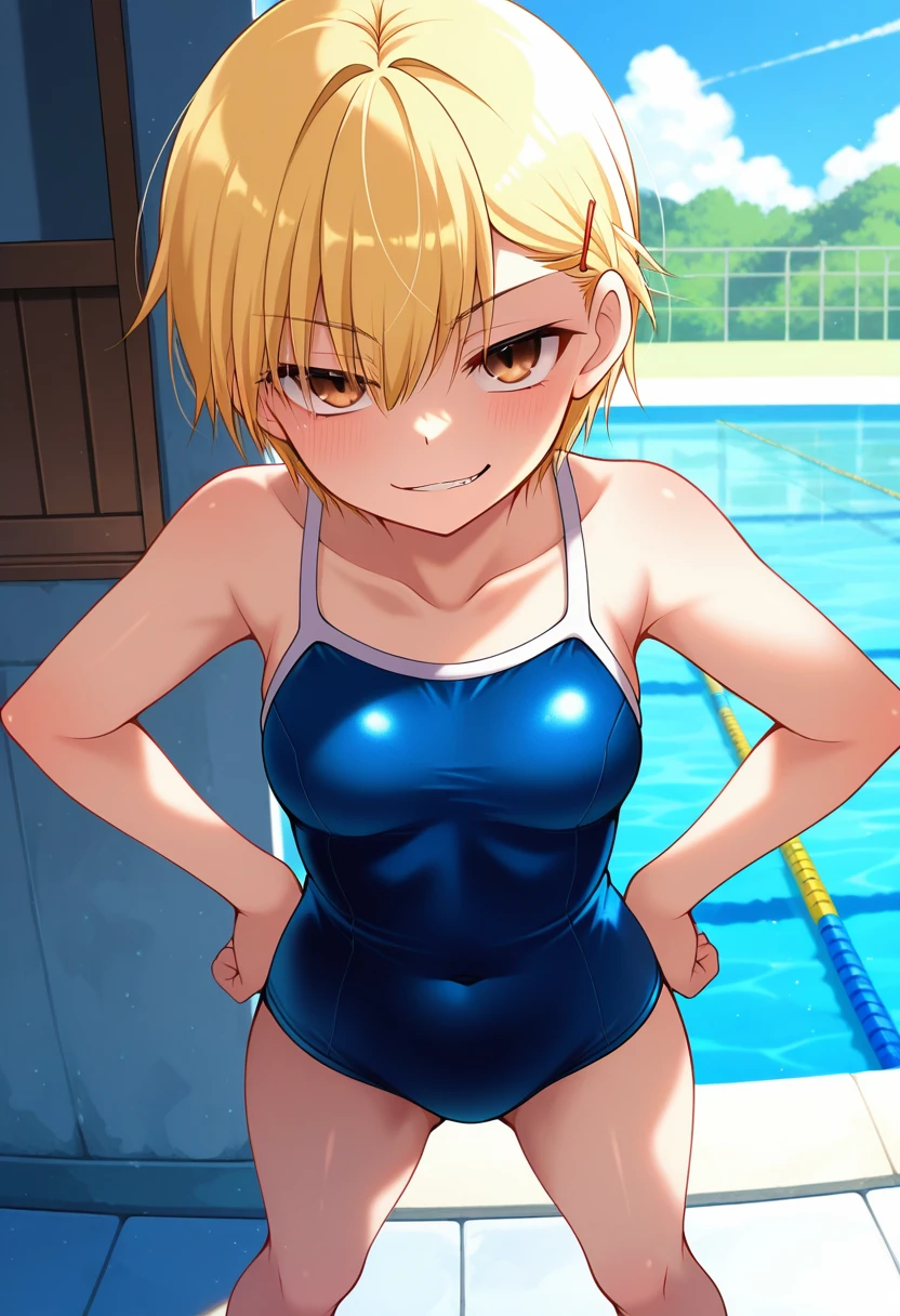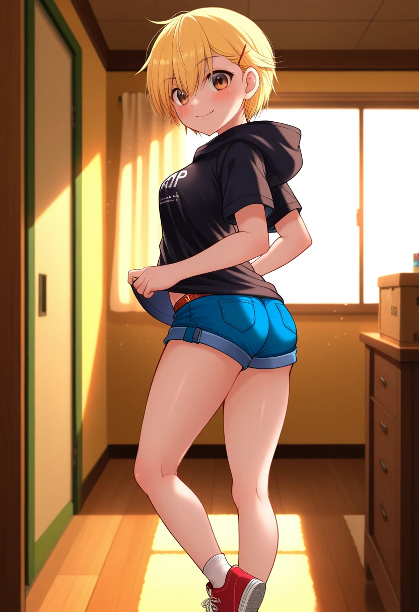 ayakaww, tomboy, brown eyes, blonde hair, short hair, asymmetrical bangs, hair between eyes, hairclip, flat chest,