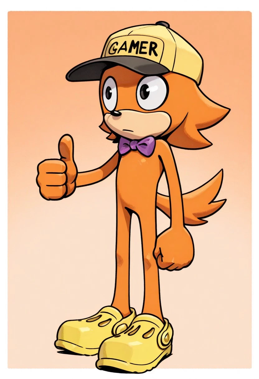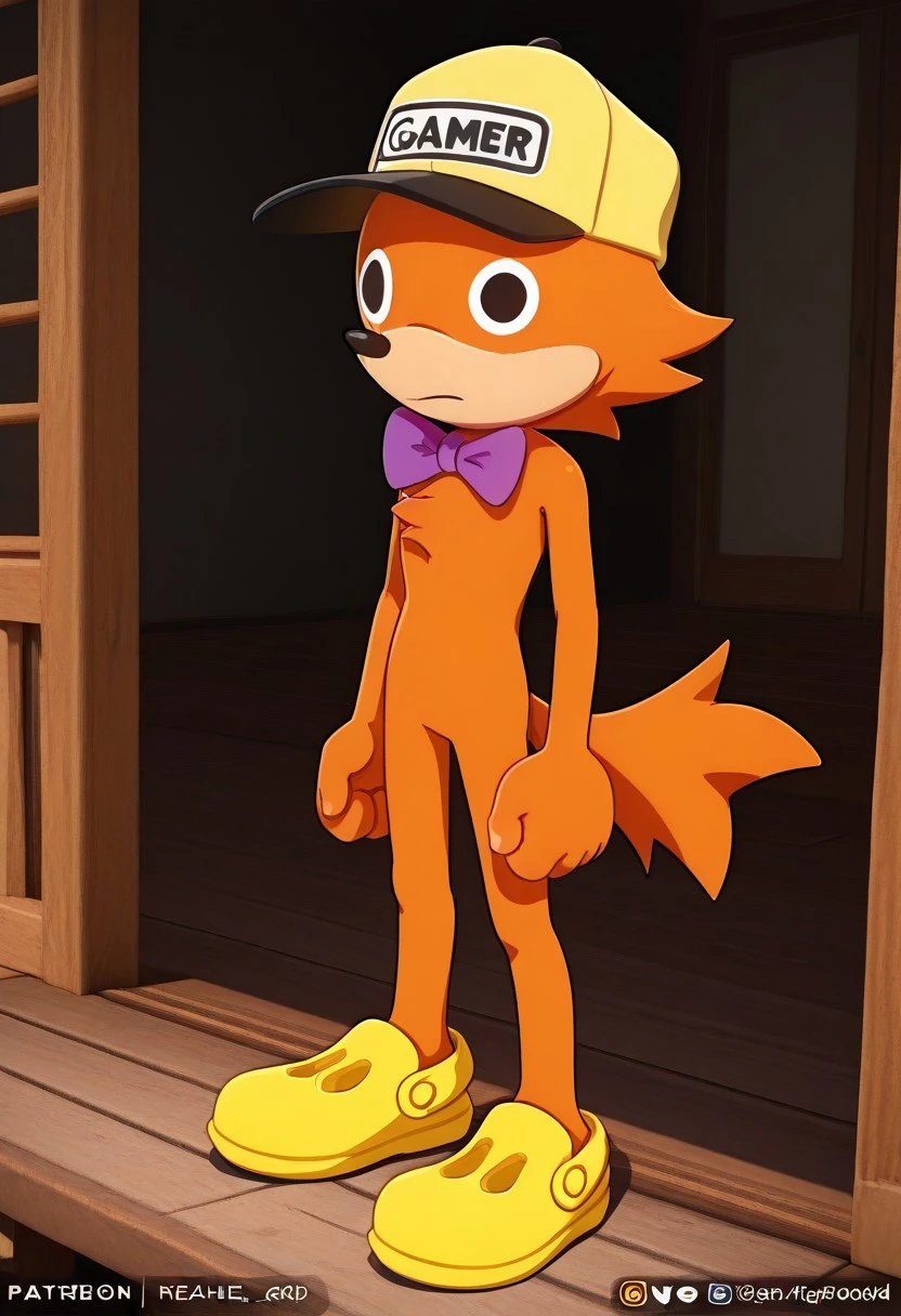 Ian Jr, furry, orange fur, peach muzzle, black eyes, orange tail, yellow hat with the word "gamer" written on it, purple bow tie, yellow crocs