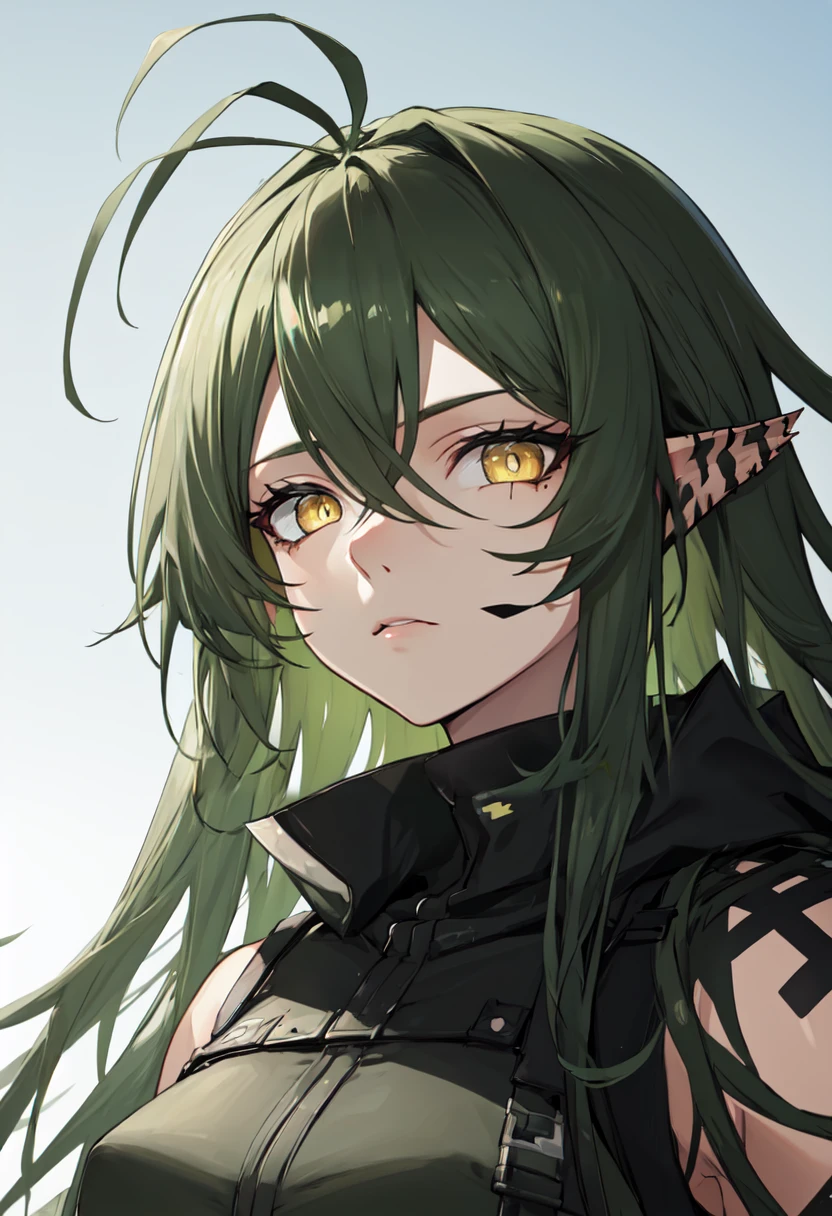 - The pruned character tags are green hair, long hair, pointy ears, yellow eyes, breasts, crocodilian tail, hair between eyes, tail, antenna hair, ponytail, medium breasts. You can add them into prompts when core features (e.g. hair color) of character is not so stable.