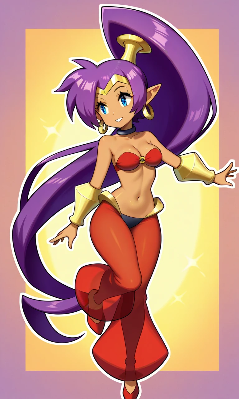 Shantae - shantae, purple hair, blue eyes, pointy ears, very long hair, jewelry, gold tiara, gold bracers, hoop earrings, dark-skinned female, ponytail, navel, harem pants, o-ring