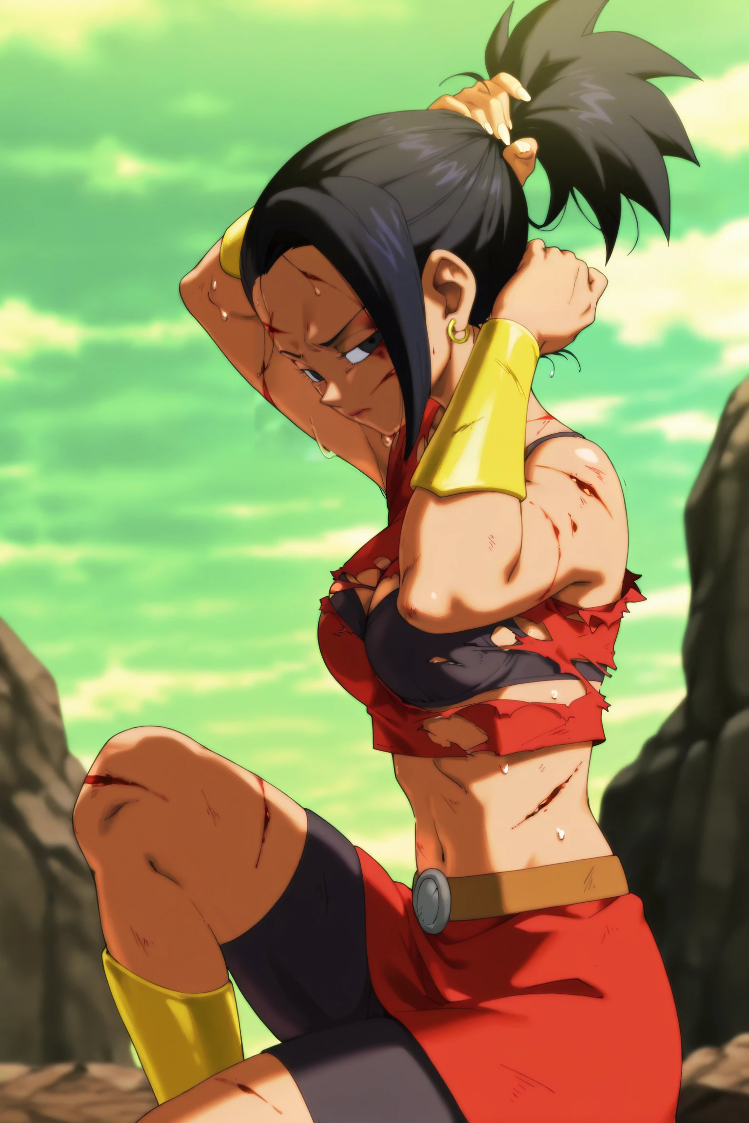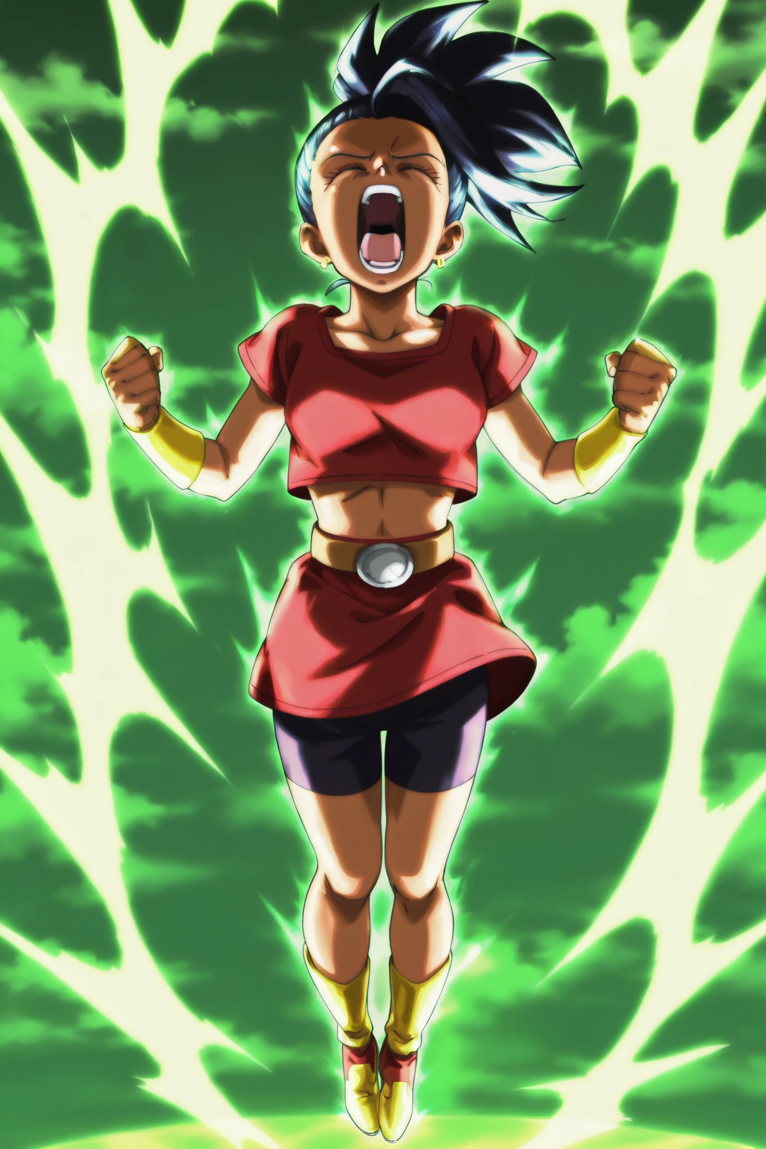 broly armor, black tube top, hoop earrings, midriff, vambraces, green sash, bare legs, saiyan boots,