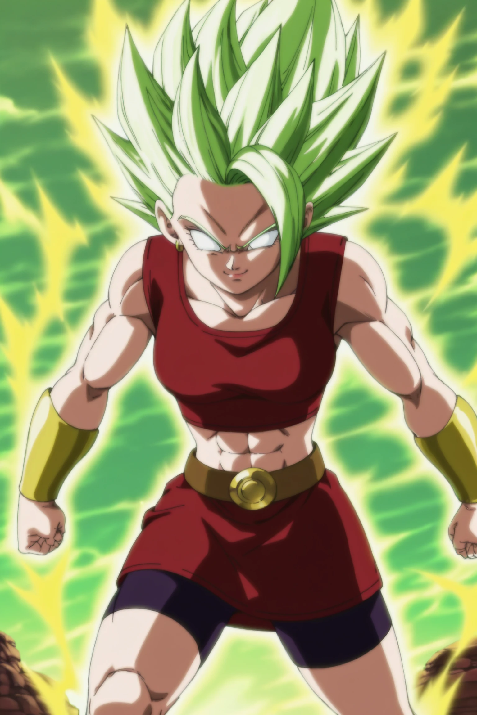 kale, super saiyan, manga beserk form, skinny, green hair, spiked hair, blank eyes,