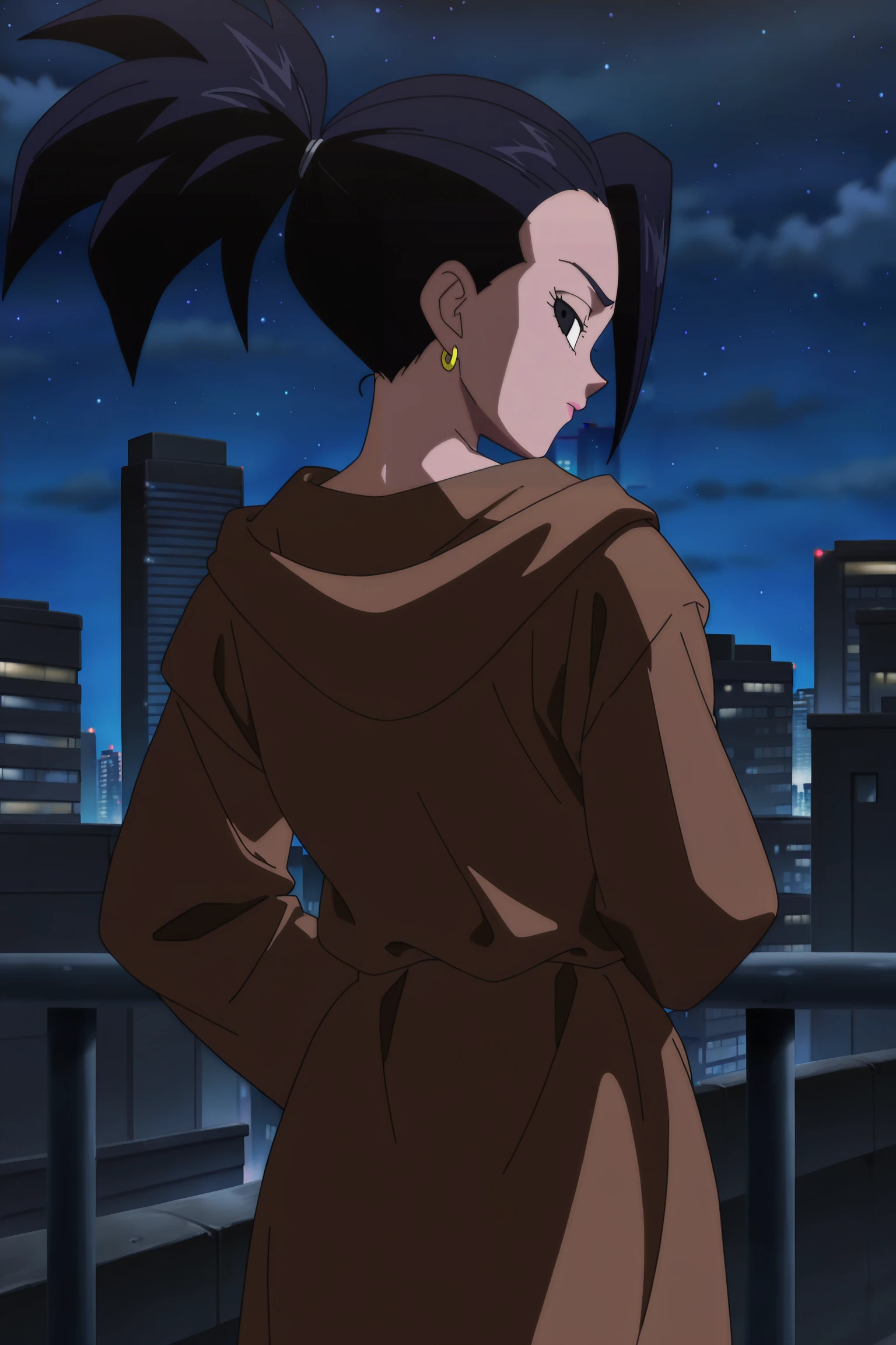 kale, ponytail, black hair, black eyes,
