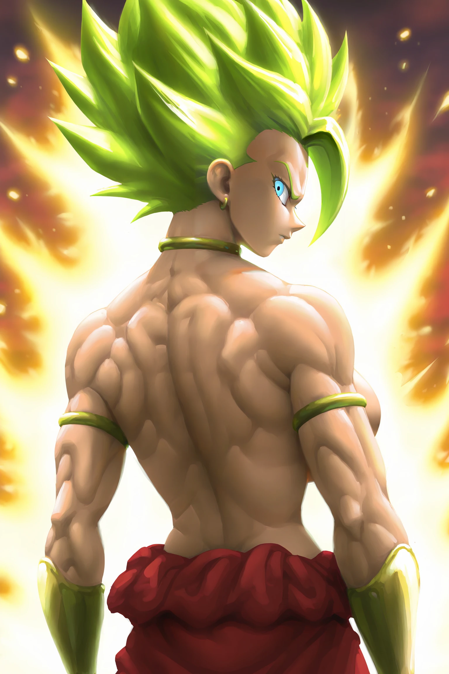kale, super saiyan 2, green hair, spiked hair, blue eyes, muscular,