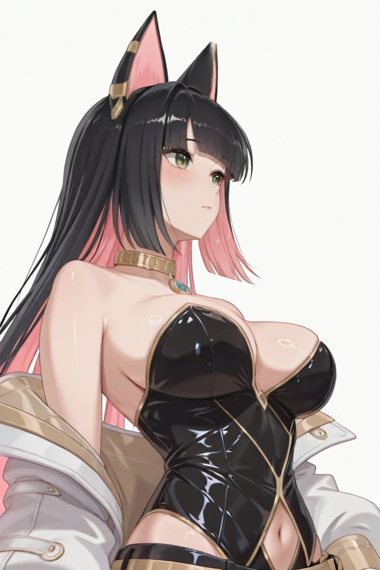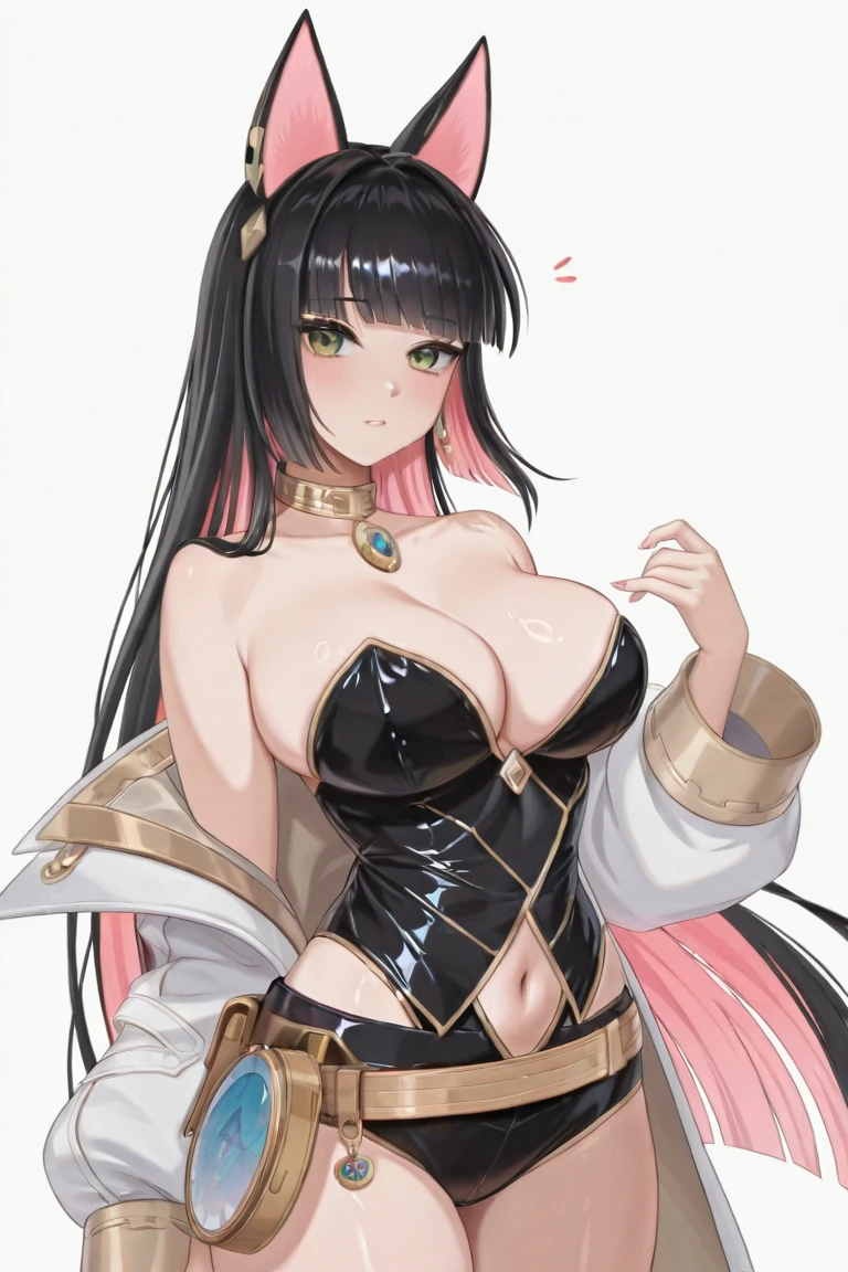 RTMGCZN, 1girl, solo, animal ears, black hair, pink hair, inner color, multicolored hair, long hair,crosshair pupils,green eyes, , strapless, collarbone, jewelry, black leotard, cleavage, navel, teal gemstone, belt, gold trim, thigh strap, legs, white boots, waist pouch, white jacket, off shoulder, open jacket,