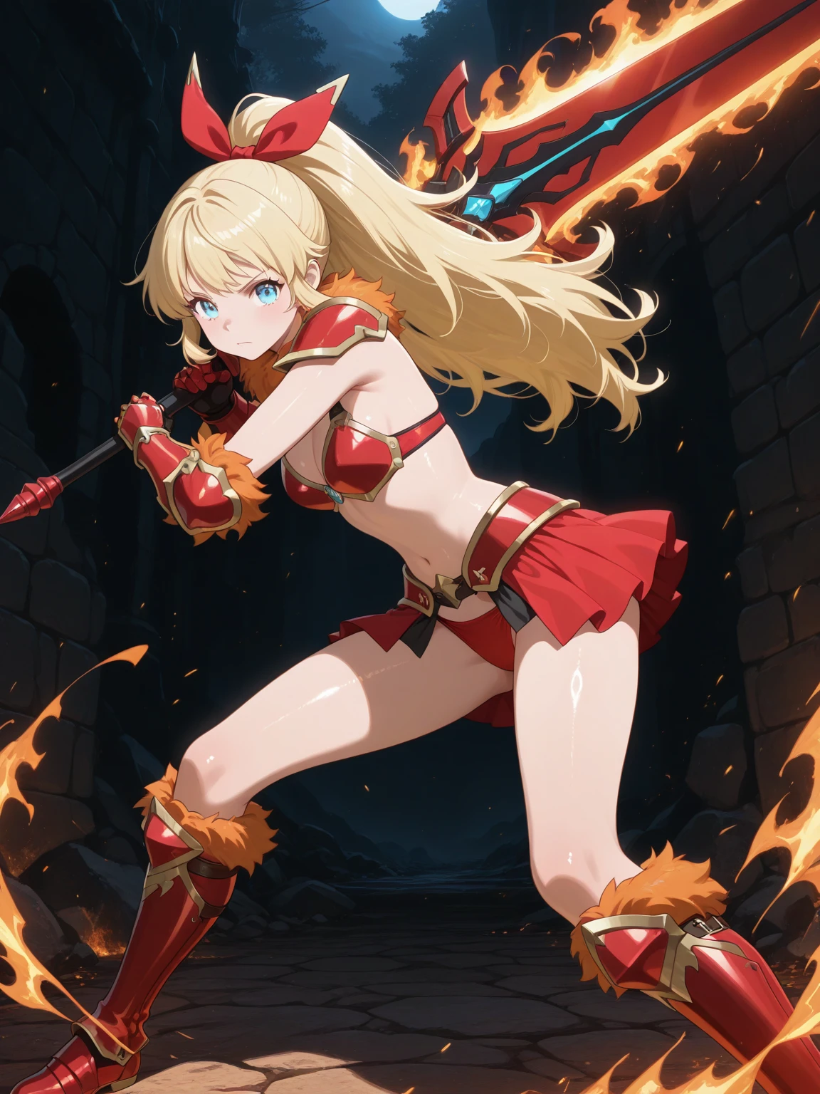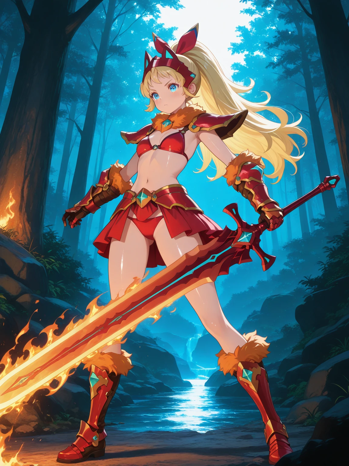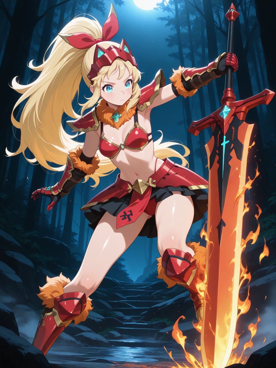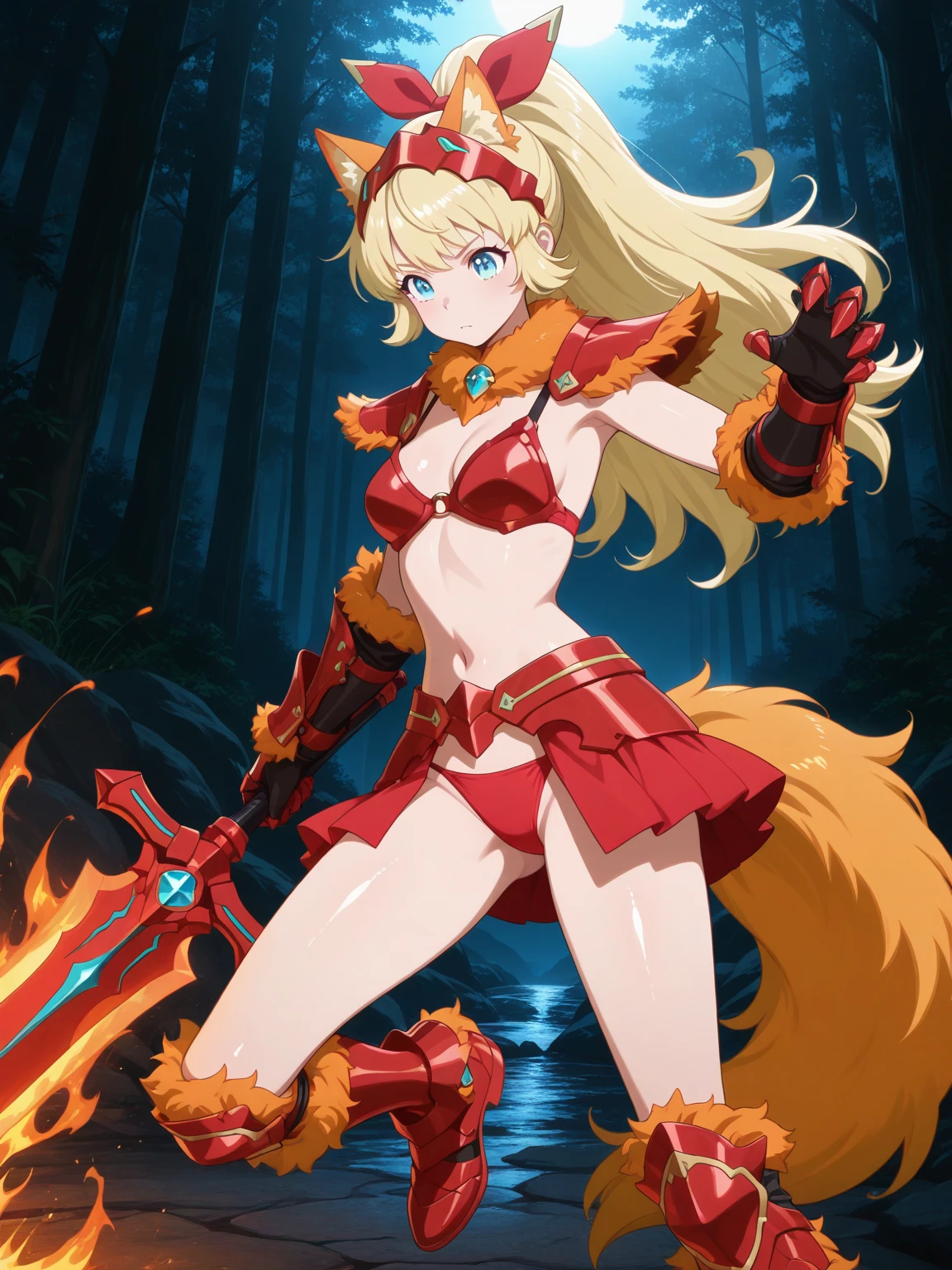 Transformed: (ChloeTransform, blue eyes, blonde hair, long hair, ponytail, hair bow), red bikini armor, orange fur-trimmed armor, skirt, gauntlets, headgear, boots,
