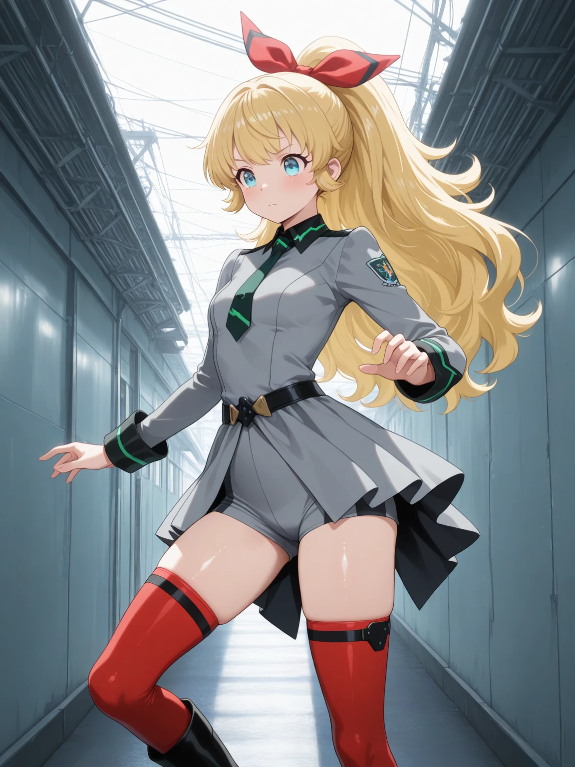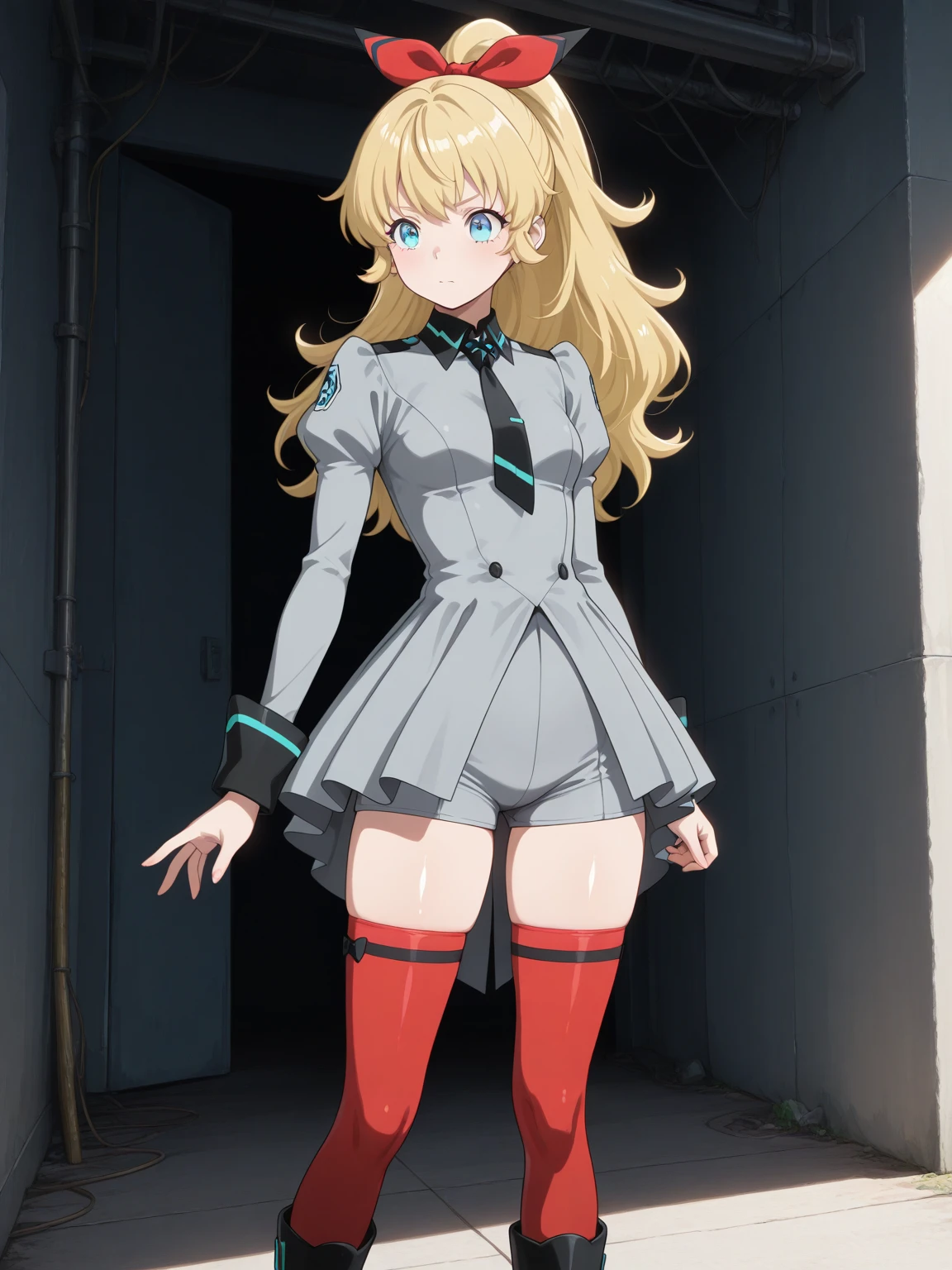 Uniform: (ChloeUniform, blue eyes, blonde hair, long hair, ponytail, hair bow), (gray dress, showgirl skirt, short skirt, long sleeves, necktie), gray shorts, (red thighhighs), black boots,