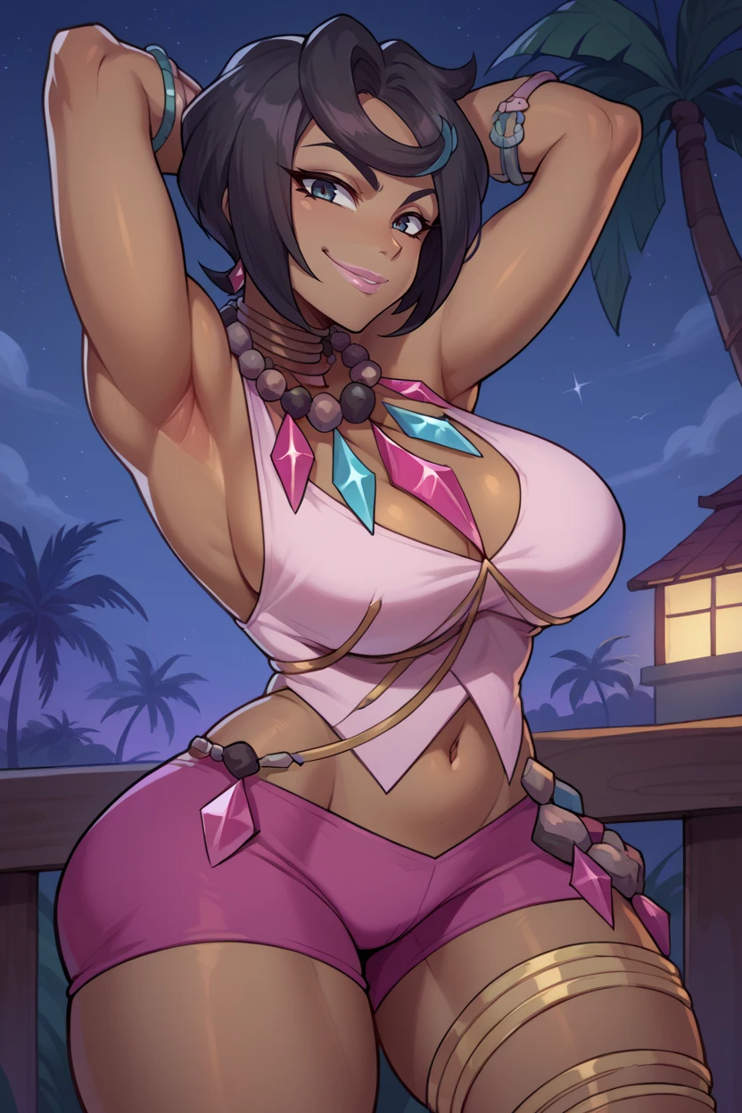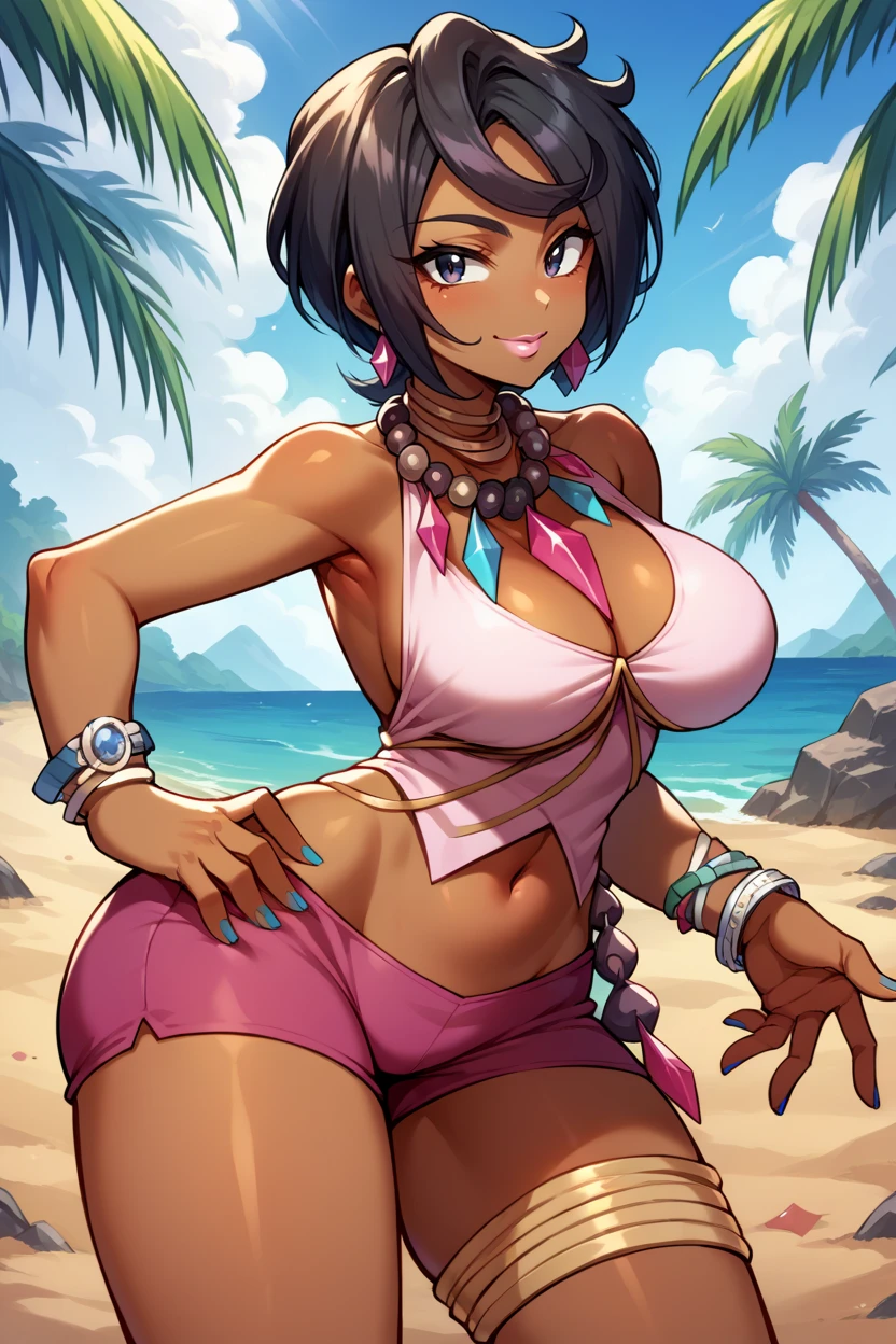 Add "lipstick, necklace, bracelet, neck ring, cleavage, pink shirt, sleeveless, beads, midriff, pink short shorts, thigh strap, blue nails" for her typical look.