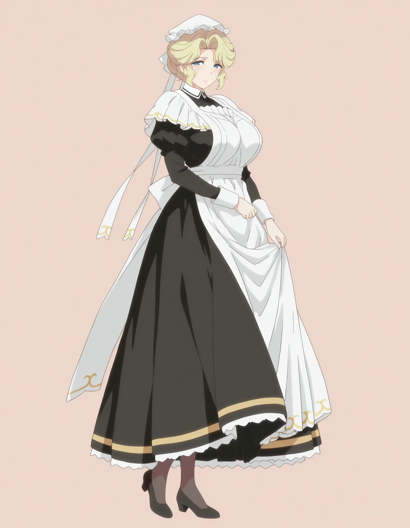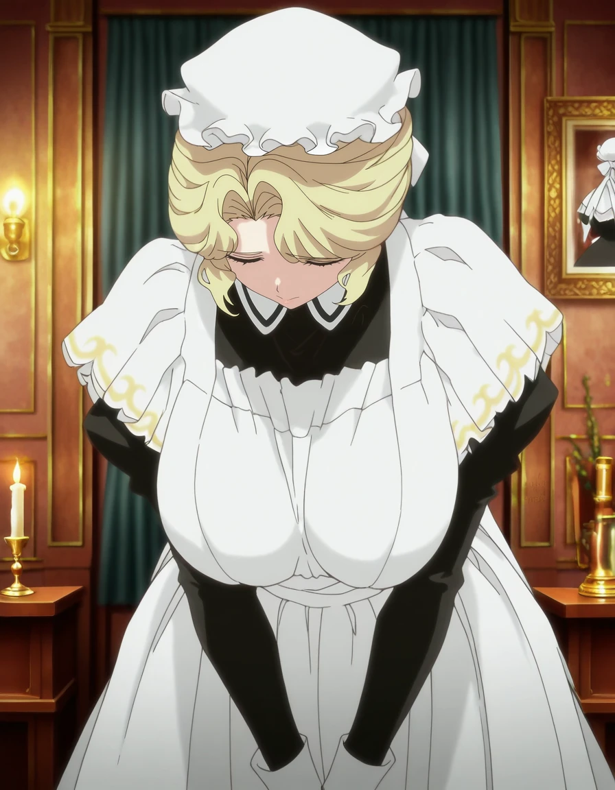 mai_mariav,,anime_coloring,mature_female,large_breasts,maid,apron,blonde_hair,blue_eyes,mob_cap,black_dress,long_sleeves,maid_apron,white_apron,short_hair,black_legwearRecommend preferred Strength: 1~1.5.