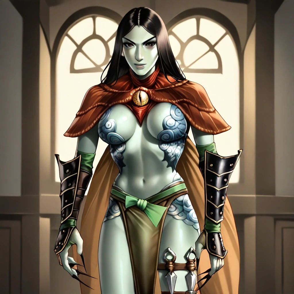 capelet, cape, eyeball brooch, revealing clothes, gauntlets, long fingernails, loincloth, thigh strap, kunai, greaves,