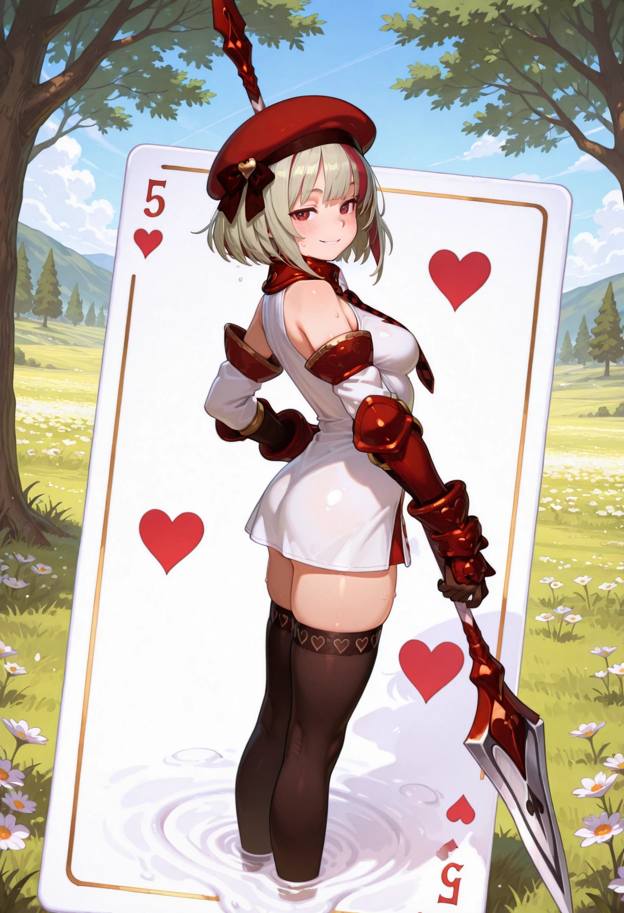 trumpart, legs_submerged, coming out of card, oversized playing card, five of hearts, heart suit👤 Character Appearance: