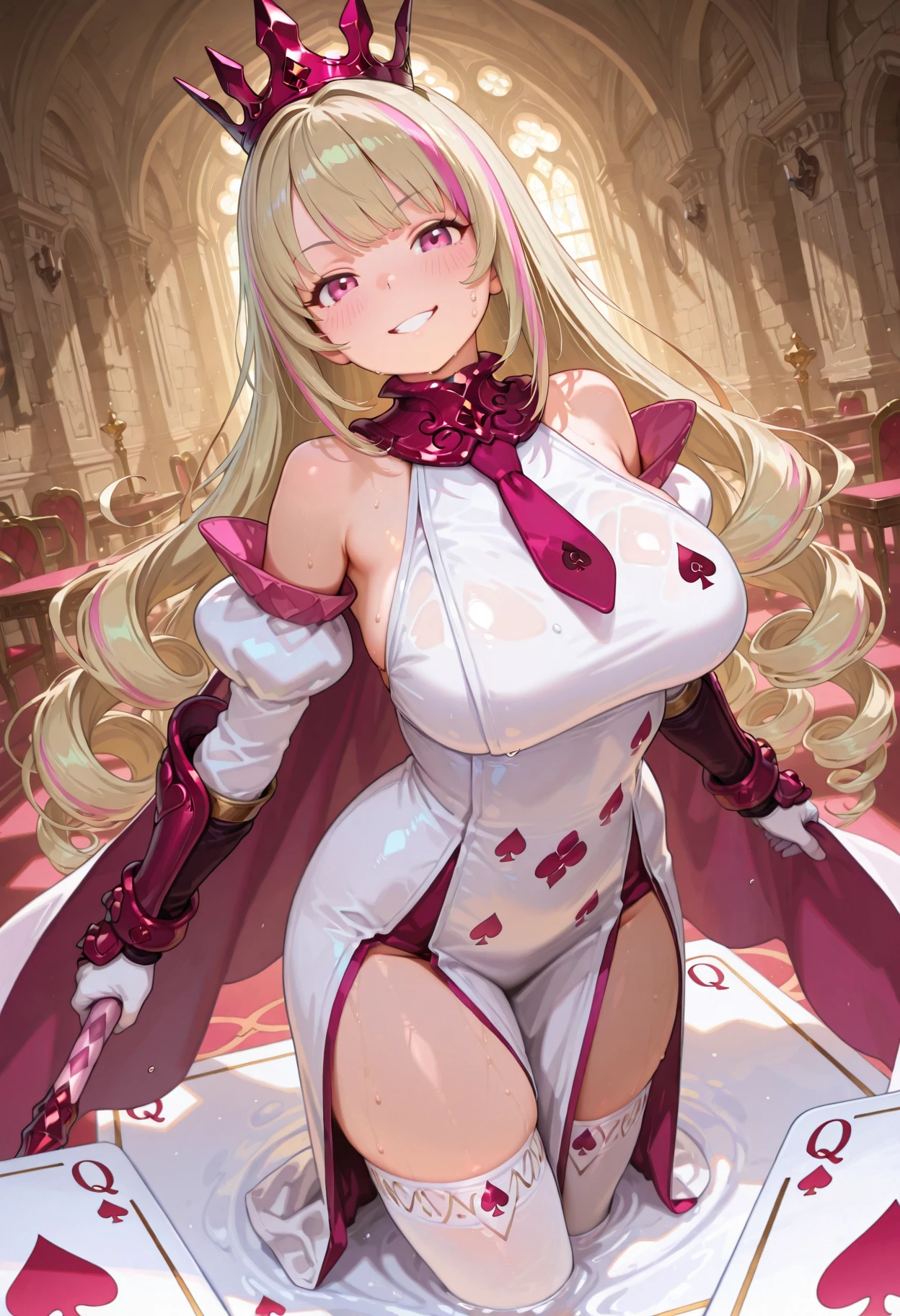 trumpartmge, blonde, short hair, streaked hair, two-tone hair, red highlights, bangs, red eyes🃏 Card-themed Attire: