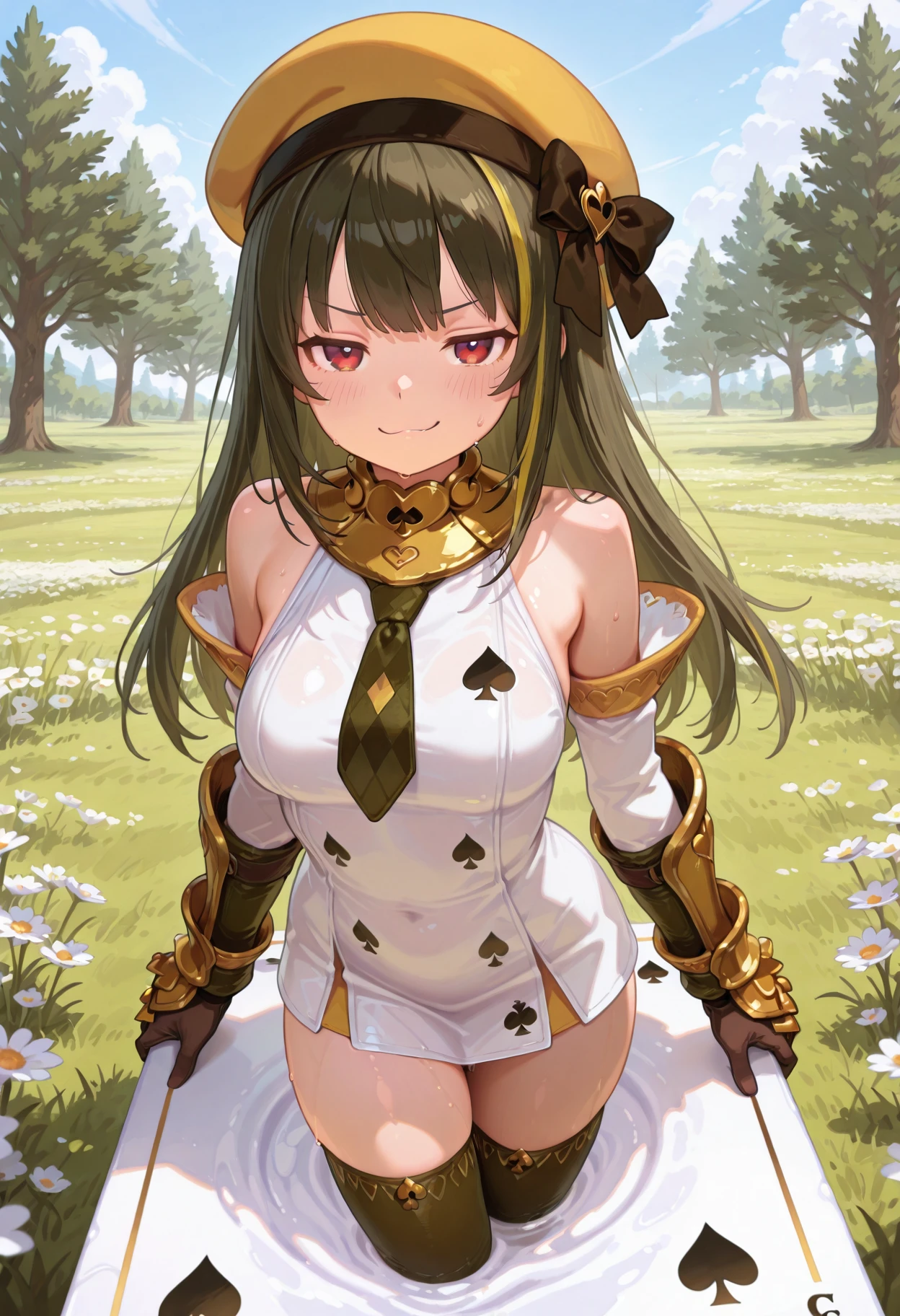 red and white, short dress, sleeveless dress, detached sleeves, black thighhighs, brown gloves, red gauntlets, red collar, checkered necktie, red beret, hat bow, bare shoulders⚔️ Equipment: