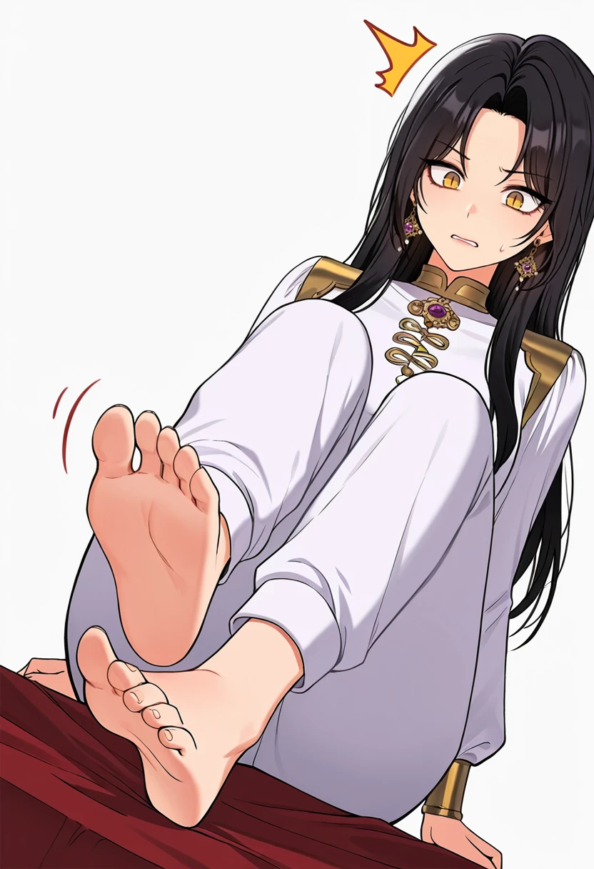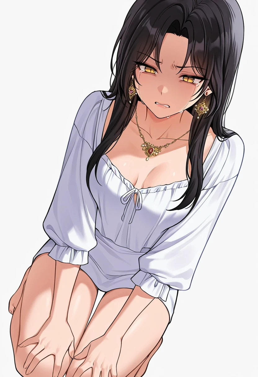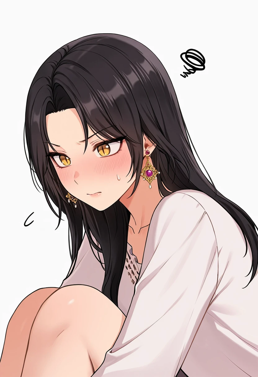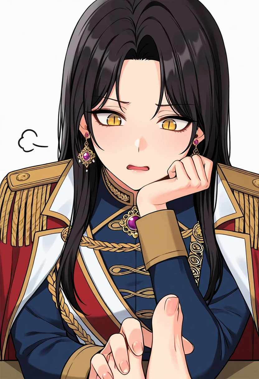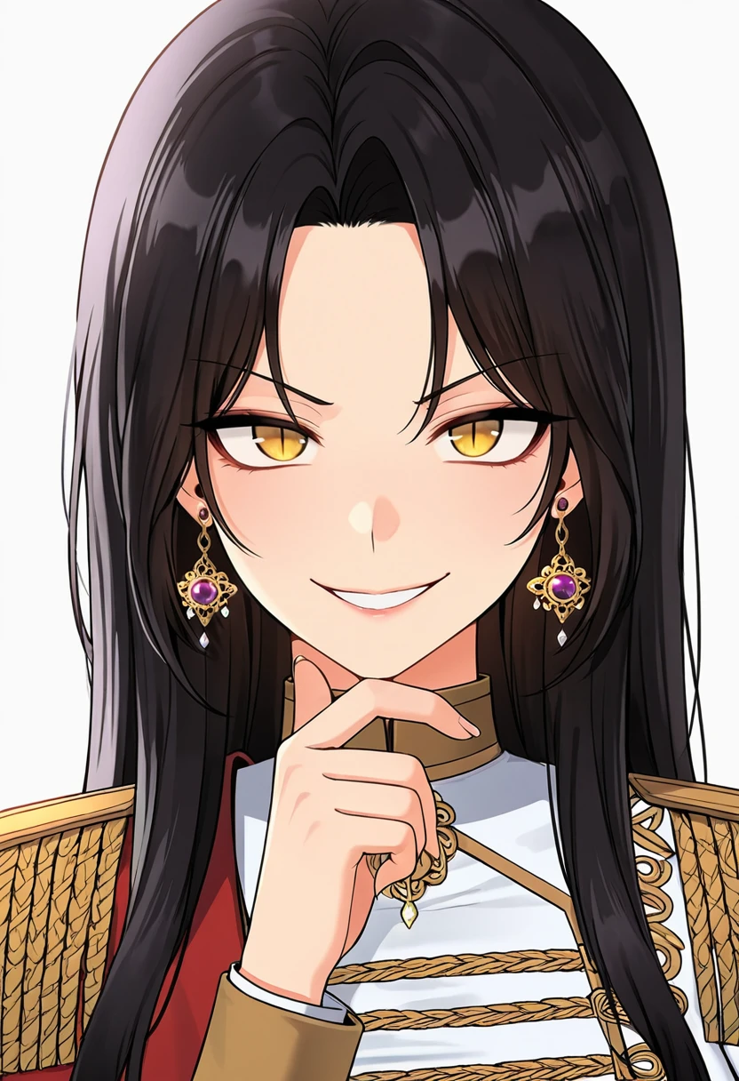 esteban_cnr,1girl, black hair, long hair, yellow eyes, slit pupils, jewelry, earrings, parted bangs,👗Default Outfit