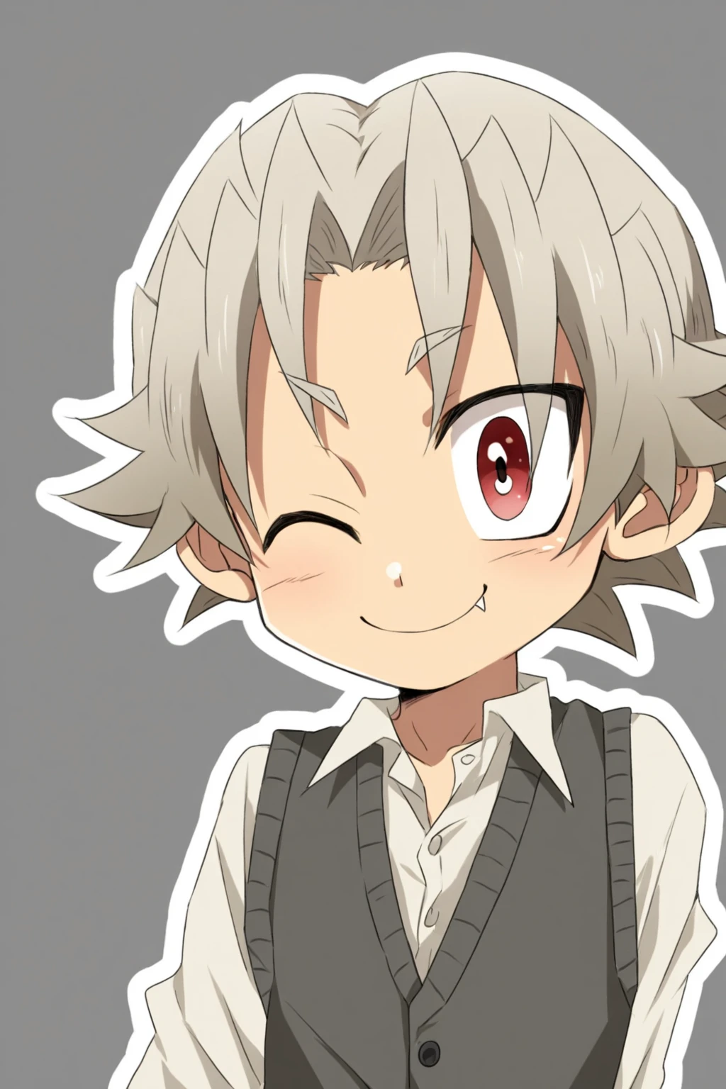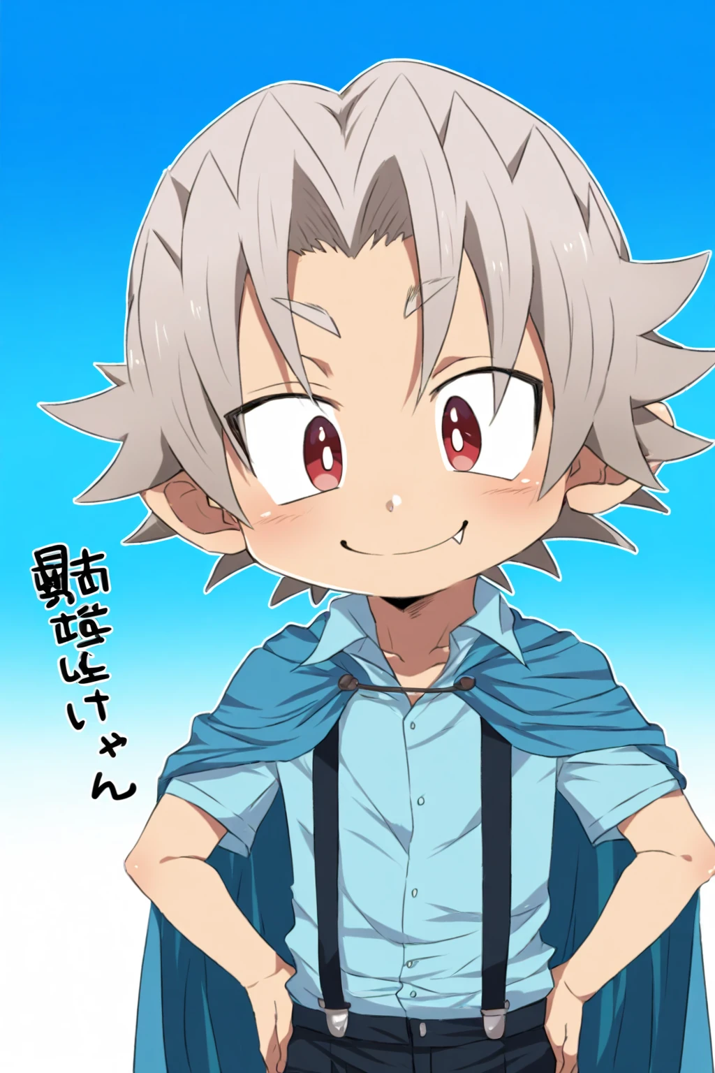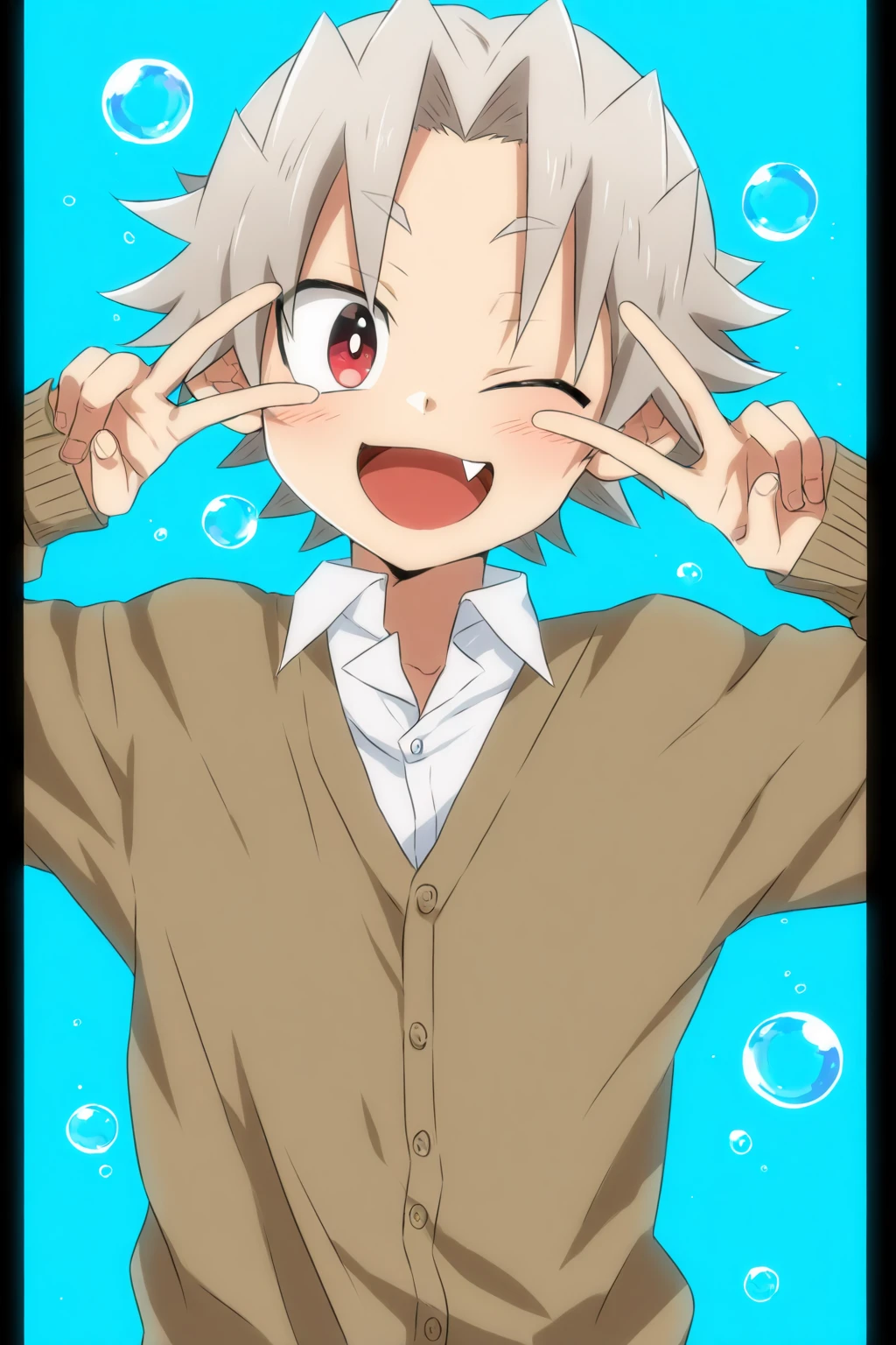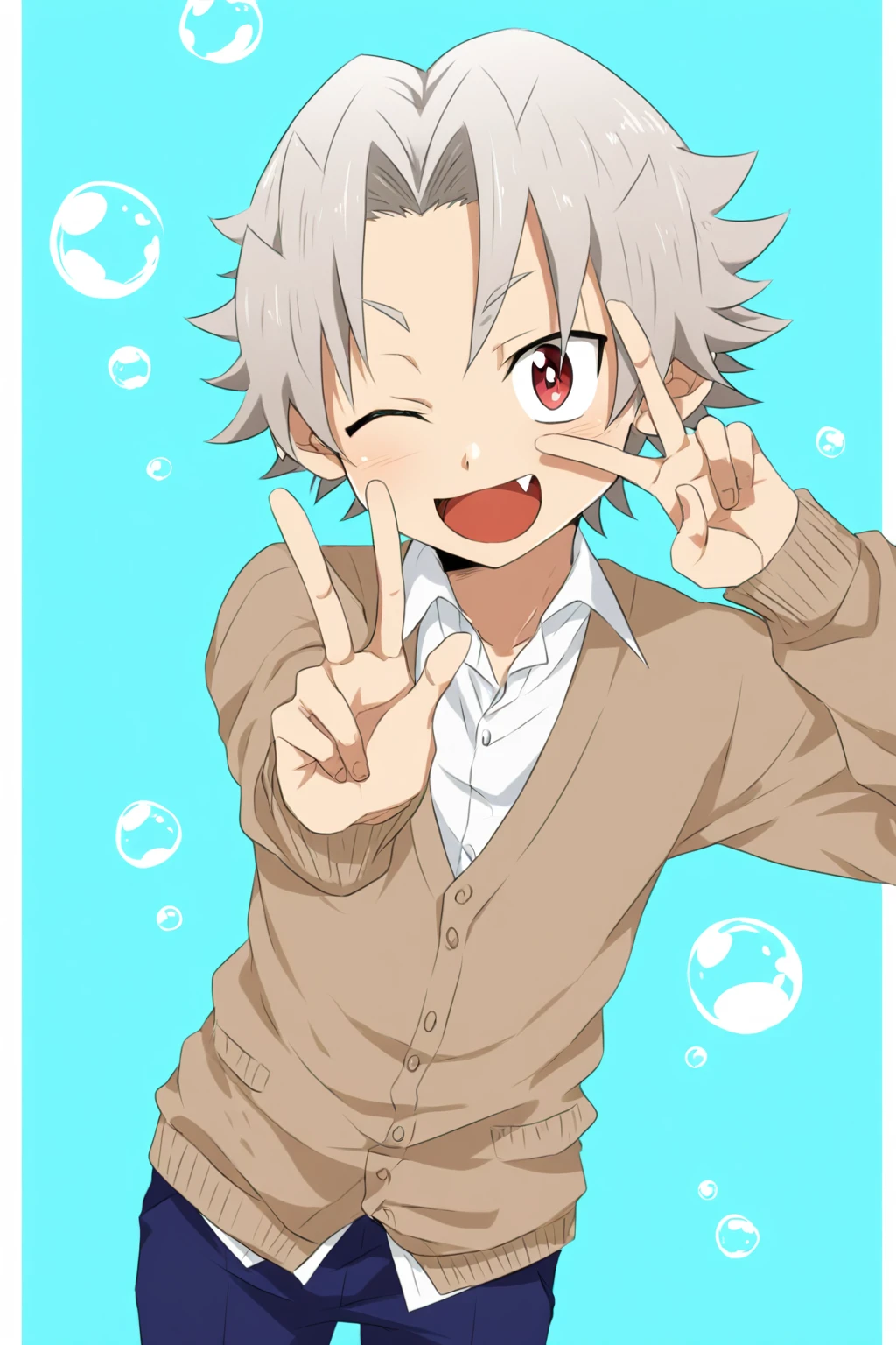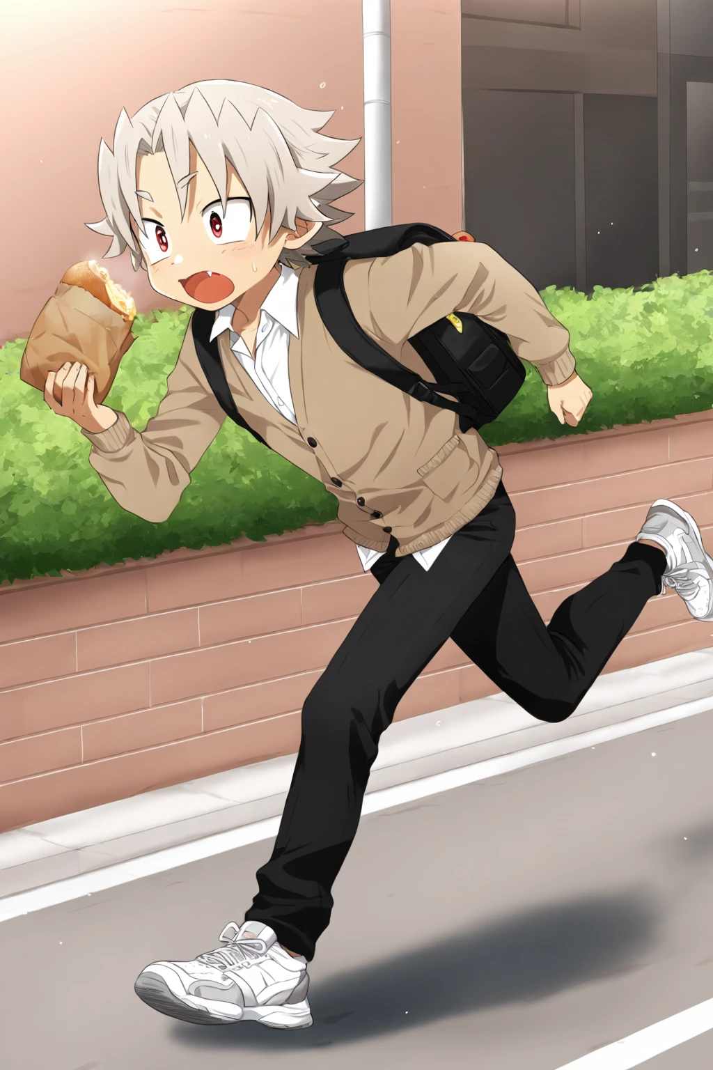 maoshantailang,1boy,spike hair,red eyes,silver hair,fang,backpack, bag, black pants, cardigan, pants,shirt, shoes, sneakers,