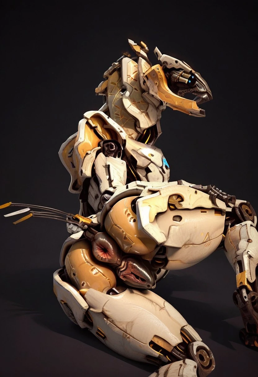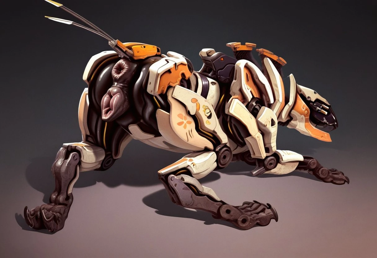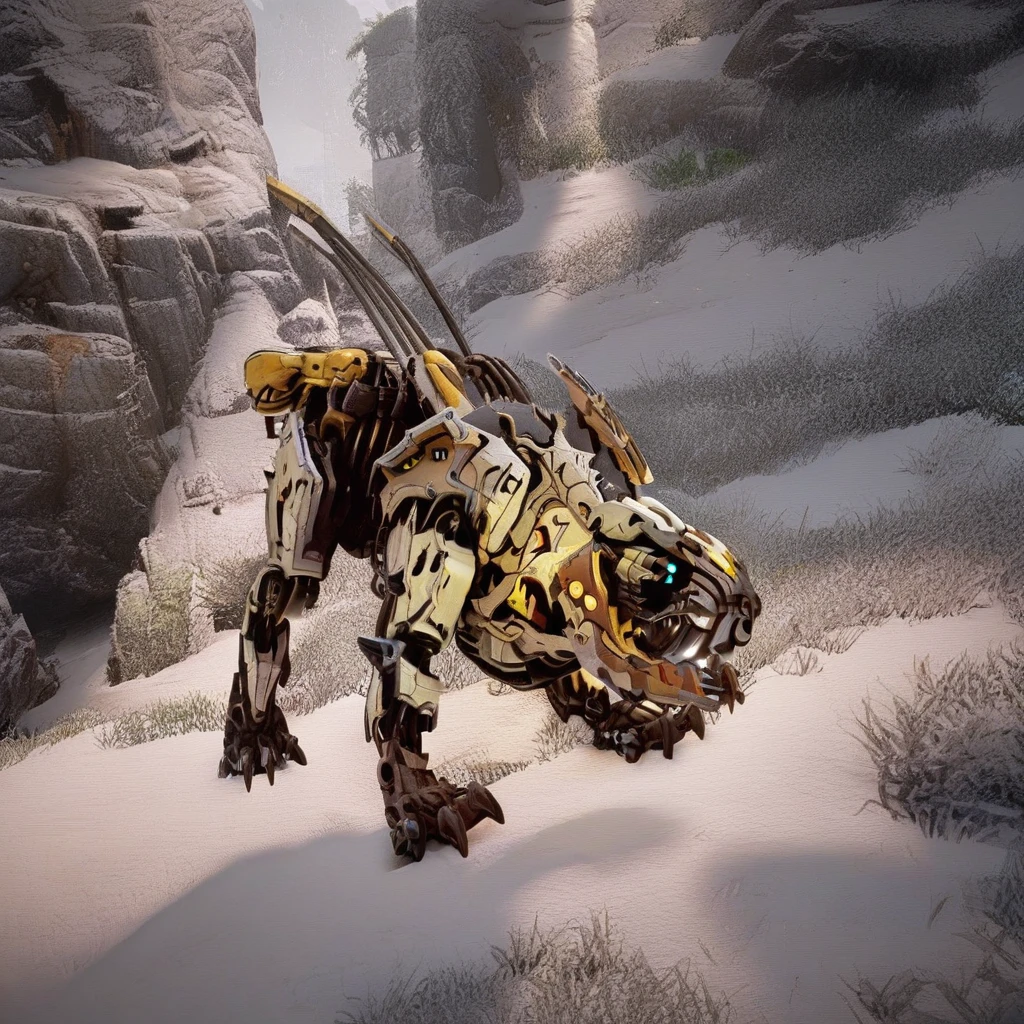 sawtooth, robot saber-toothed tiger, white body, claws, big teeth, four blue glowing eyes, four cat leg