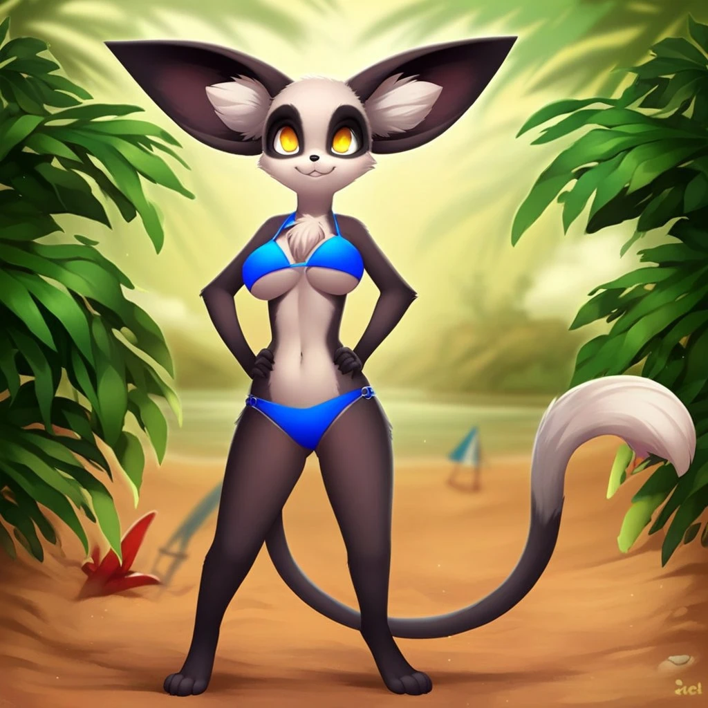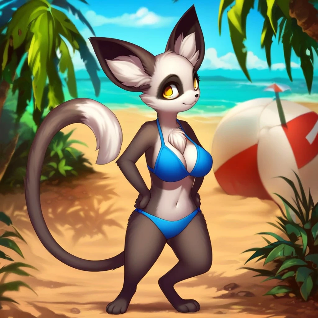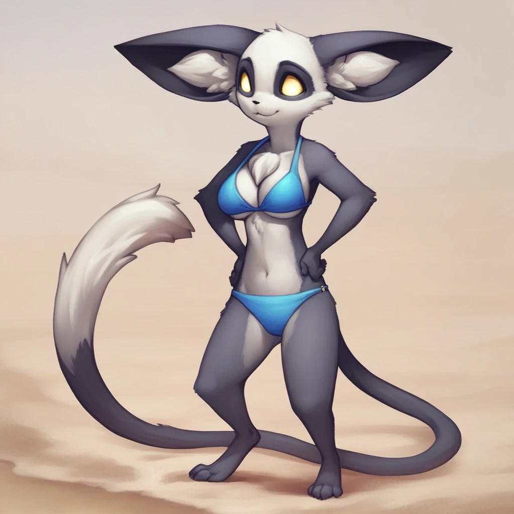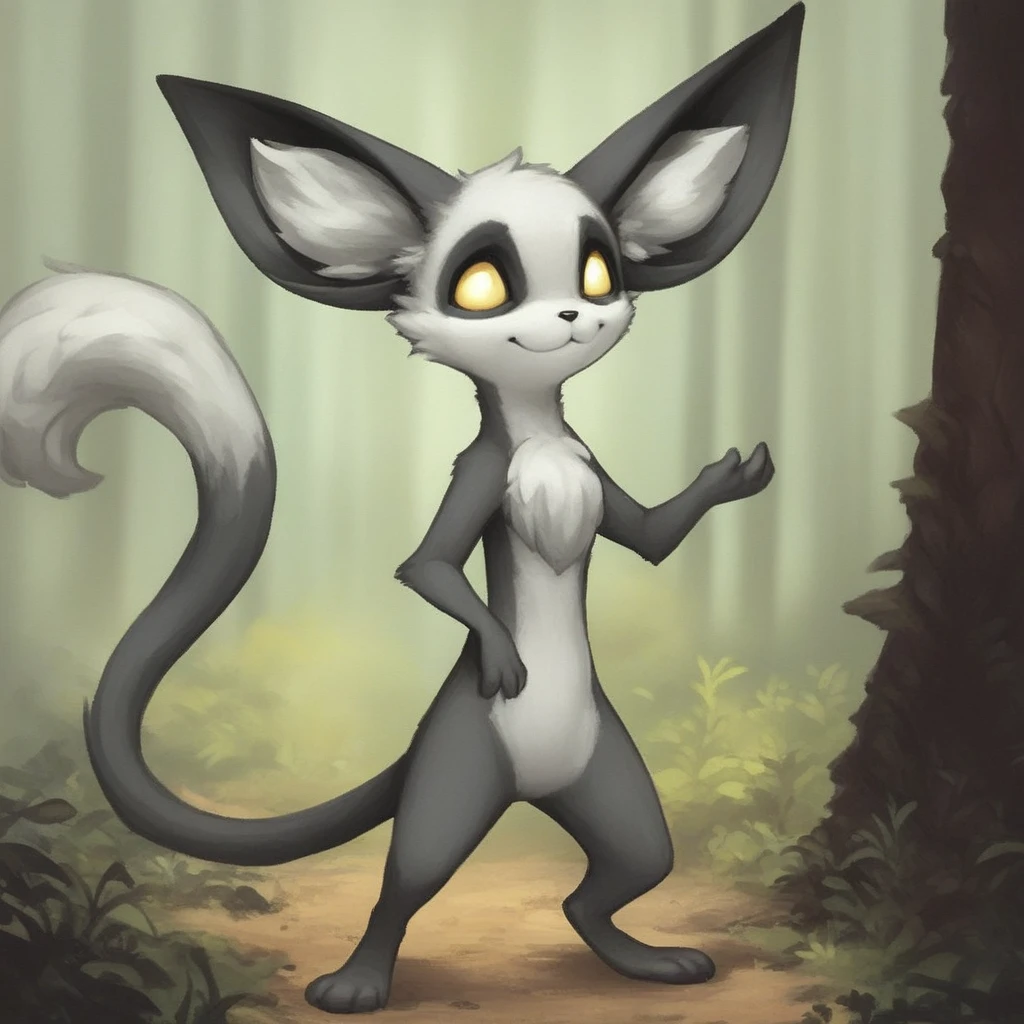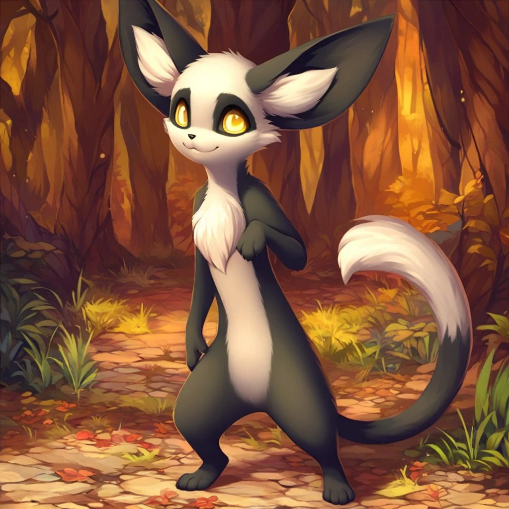meerkat, weasel, black and white fur, yellow eyes, large ears, black nose, chest tuft, long tail, white tail tip,
