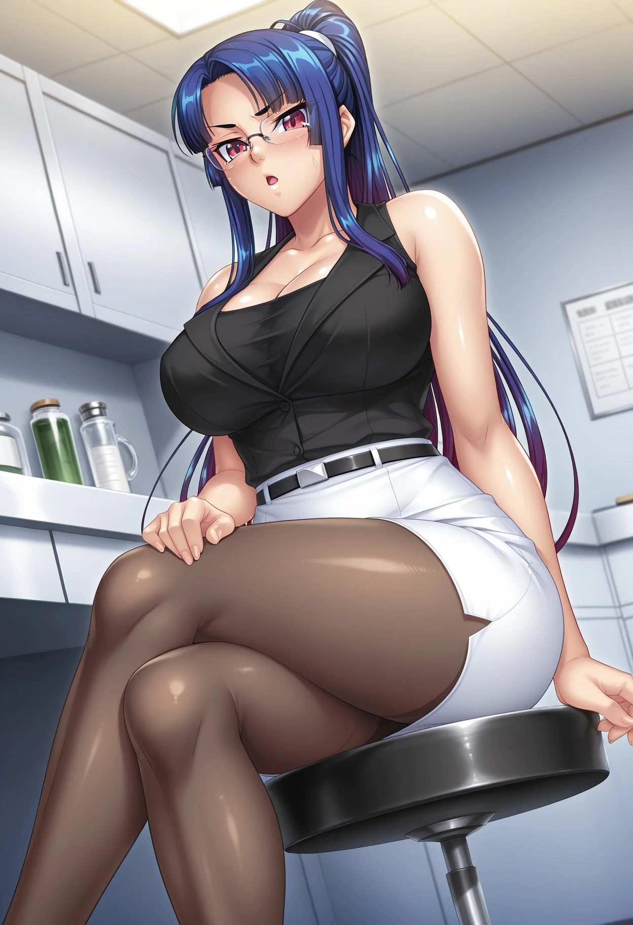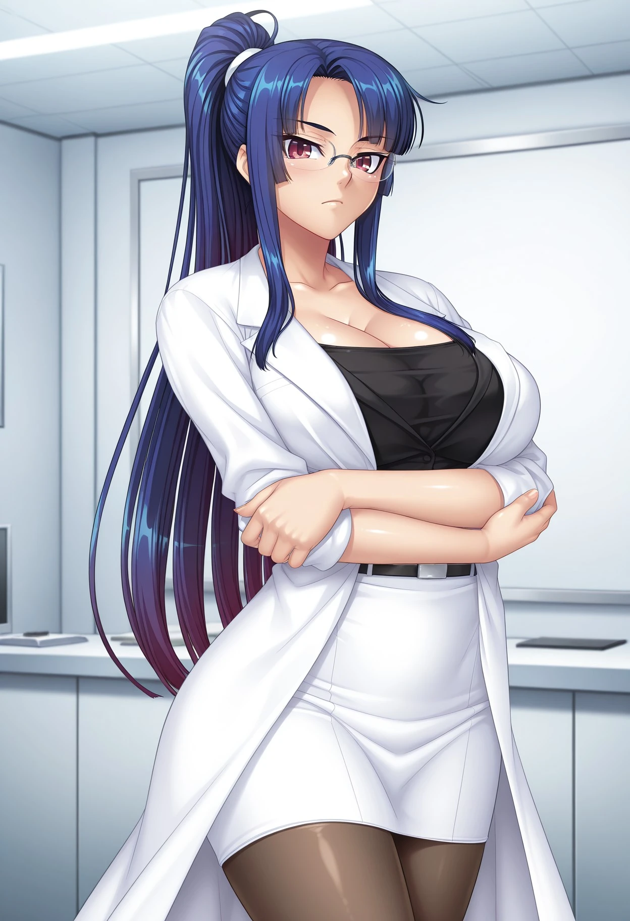(TA3) 5th outfit: high ponytail, glasses, dress shirt, black blouse, long sleeves, lab coat, black shirt, collarbone, , white skirt, pencil skirt, black pantyhose