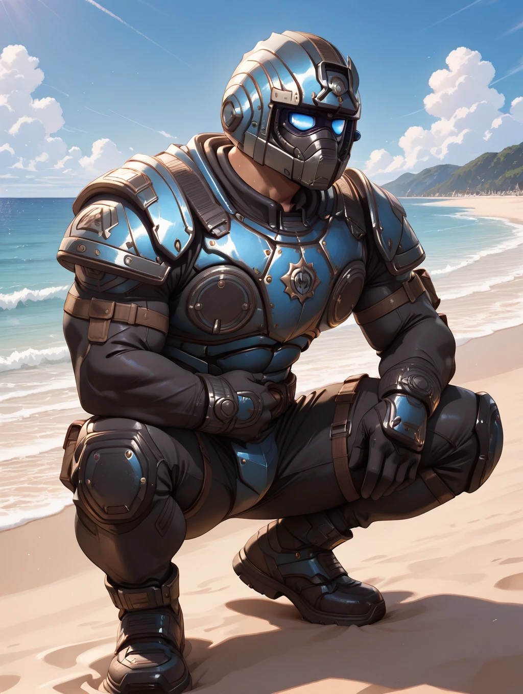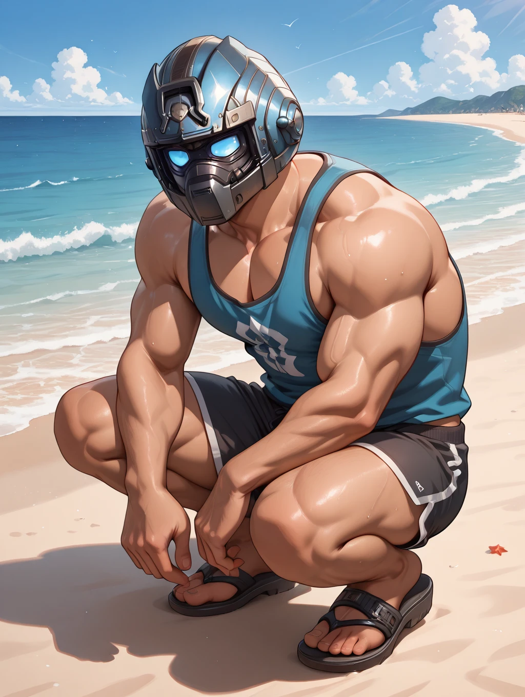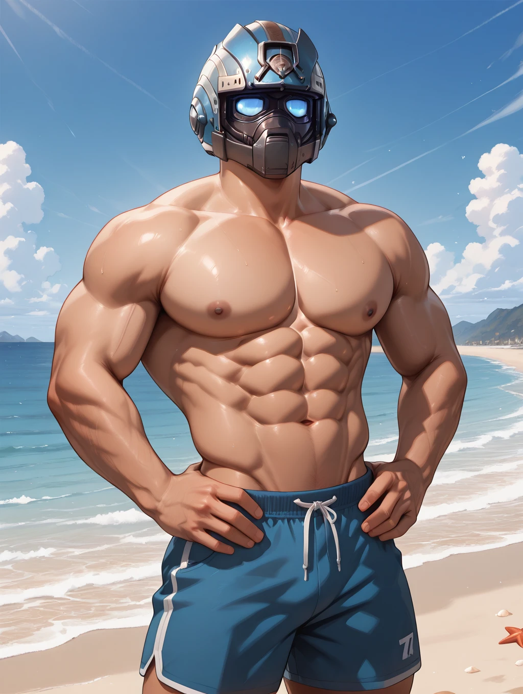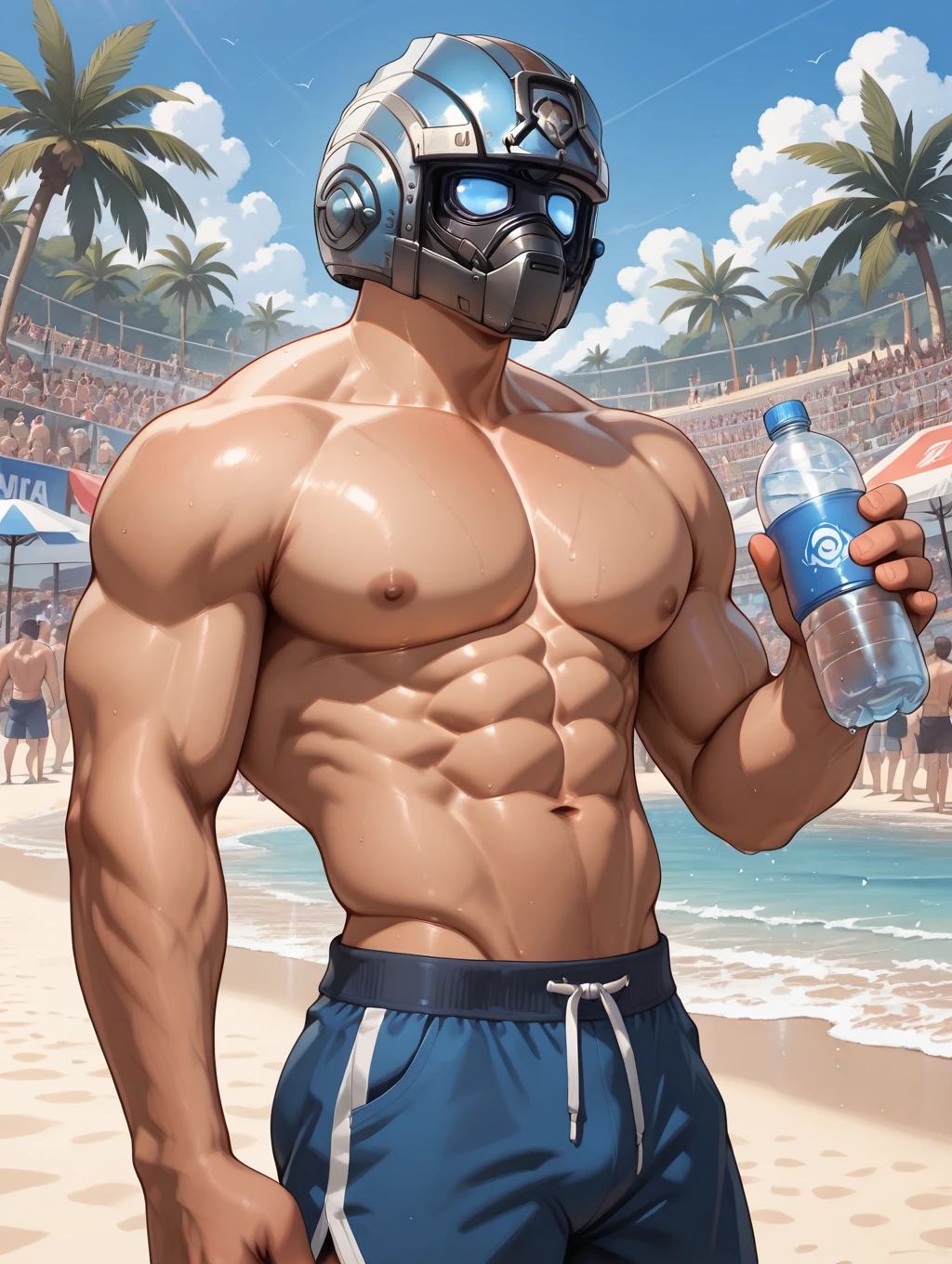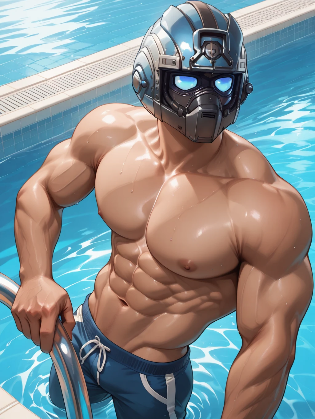 1boy, helmet, topless, top less, towel, sauna, indoor, winter, male focus, cowboy shot, solo, muscular, bara, glowing, steam, sitting
