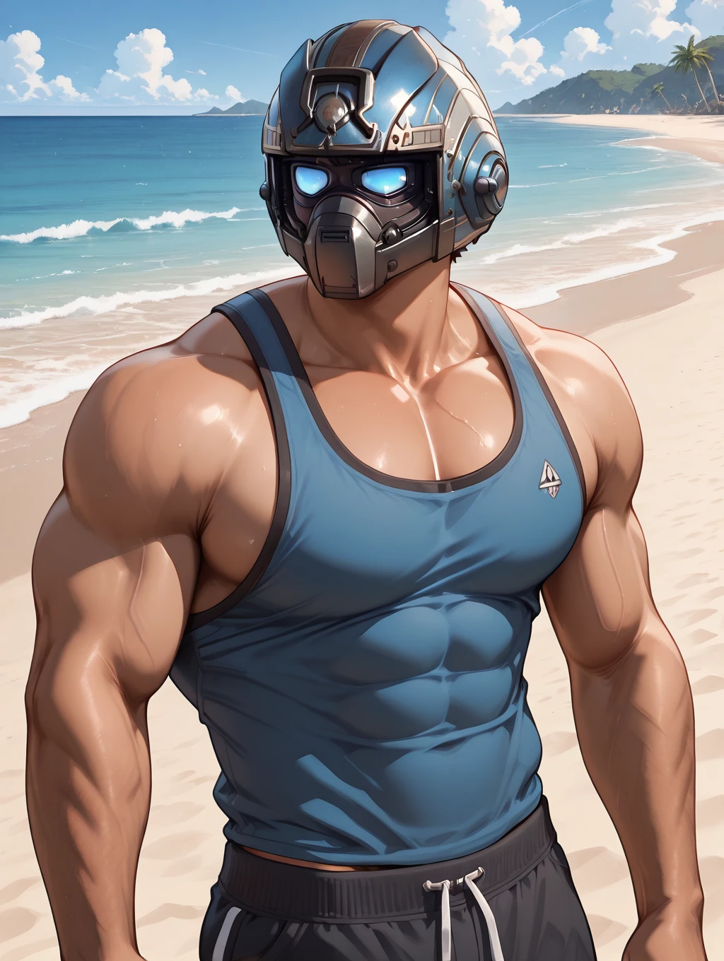 solo, helmet, white sleeveless t-shirt, belt, indoor, muscular, bara, glowing, black jeans, bar, sitting on stool, from side, cocktail