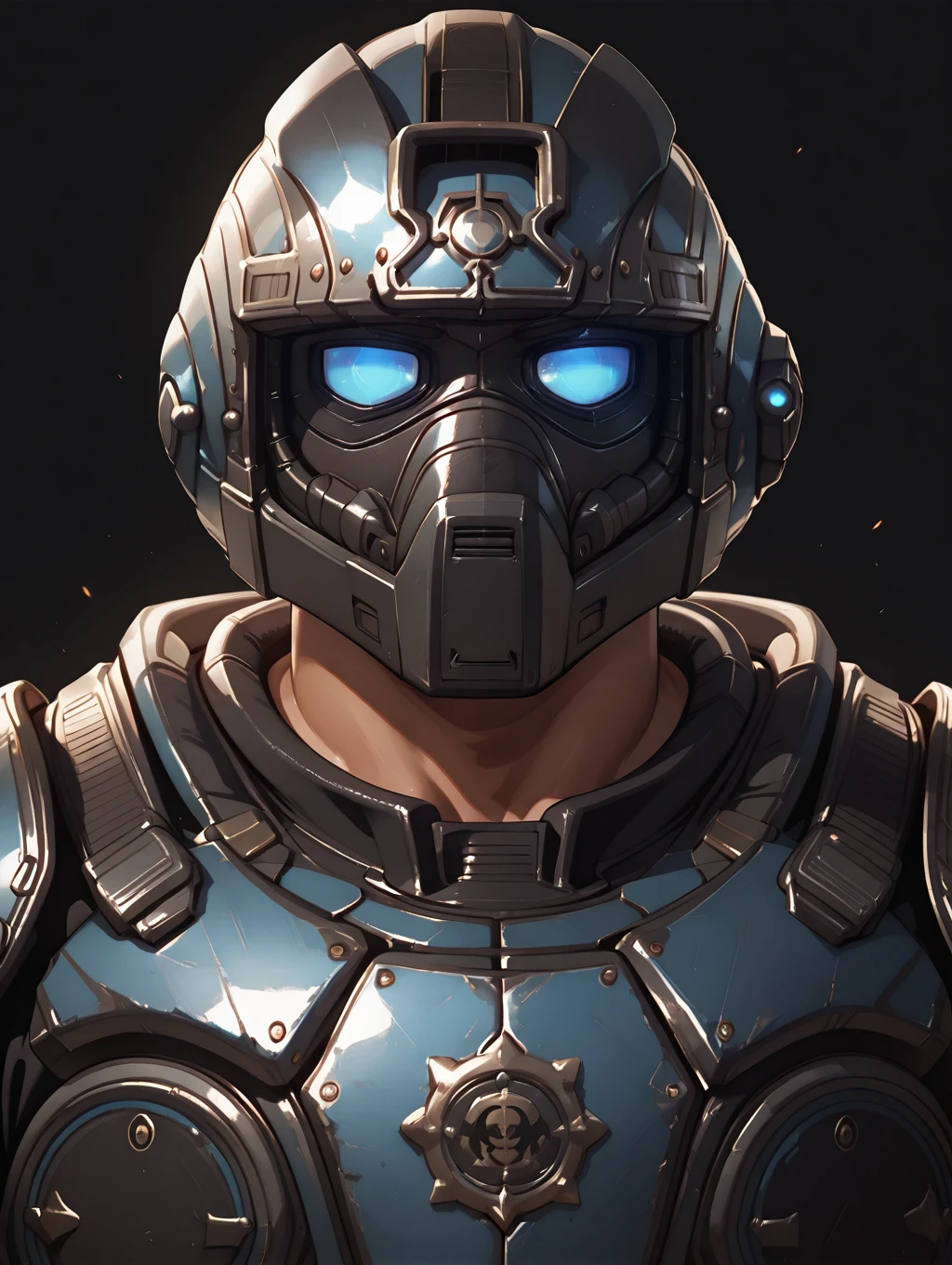 1boy, helmet, upper body, armor, power armor, simple background, male focus, straight-on, black background, portrait, solo, muscular, bara, glowing