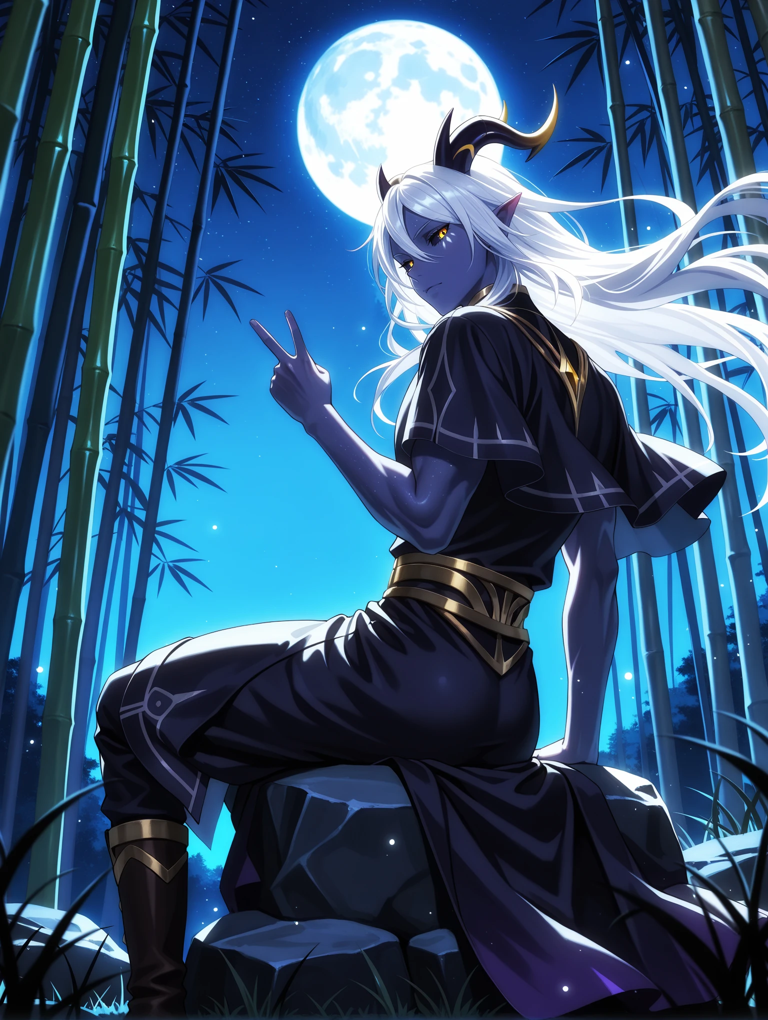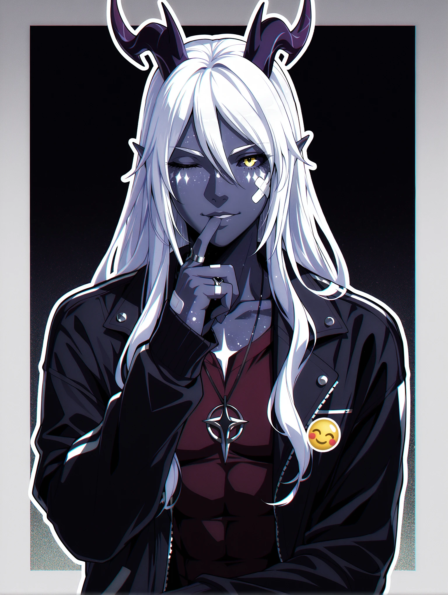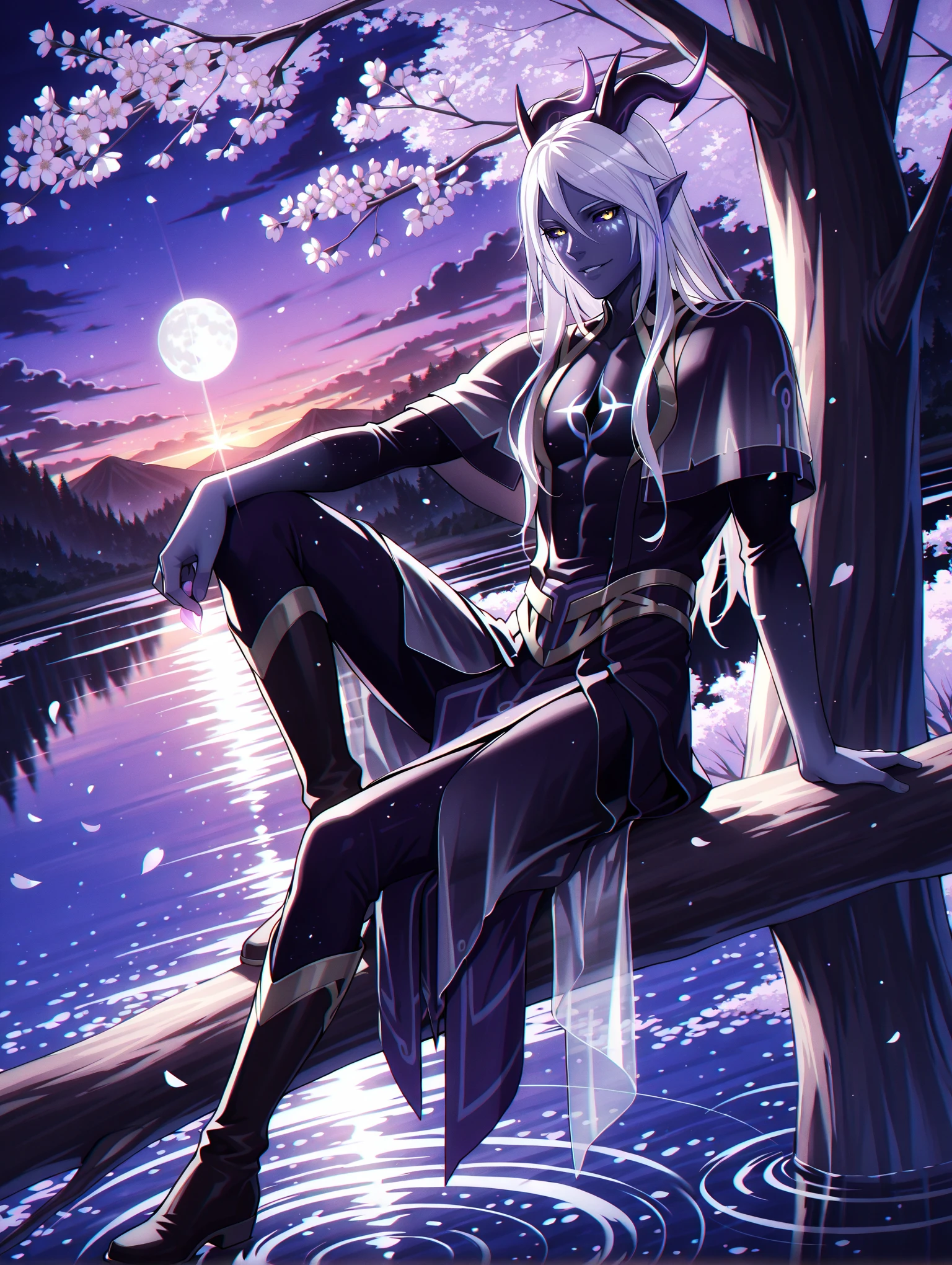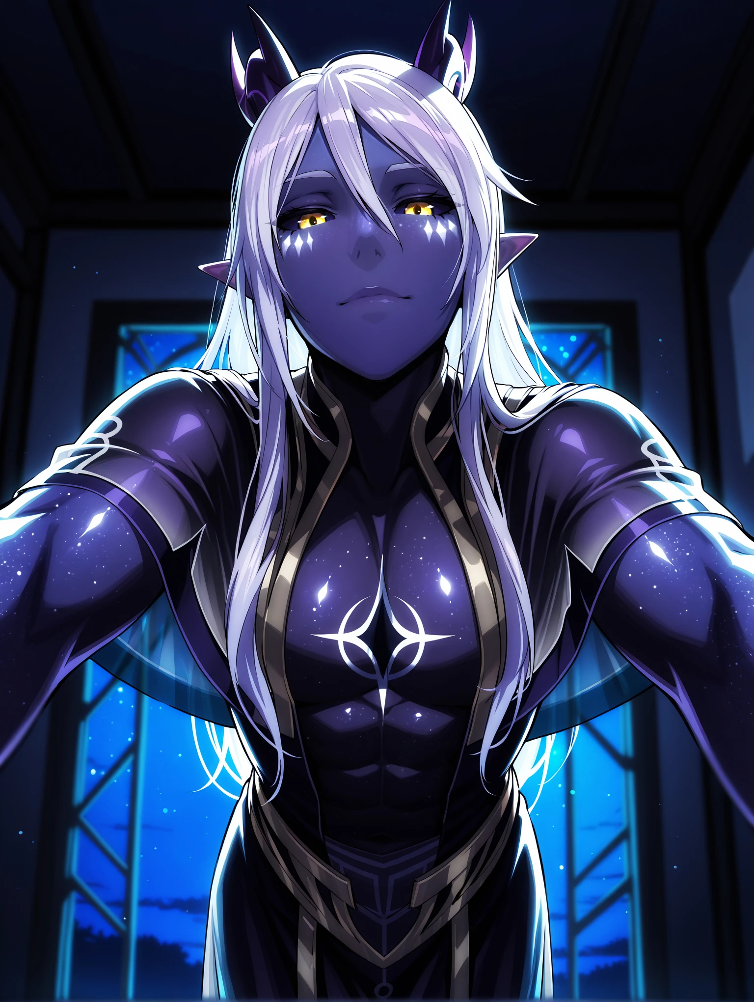 Aaravos Prompts : 1boy, male, fit body, toned, colored skin, long hair, horns, pointy ears, white hair, colored sclera, black sclera, yellow eyes, tattoo, face marks, bangs, hair between eyes, blue skin, purple skin, grey skin