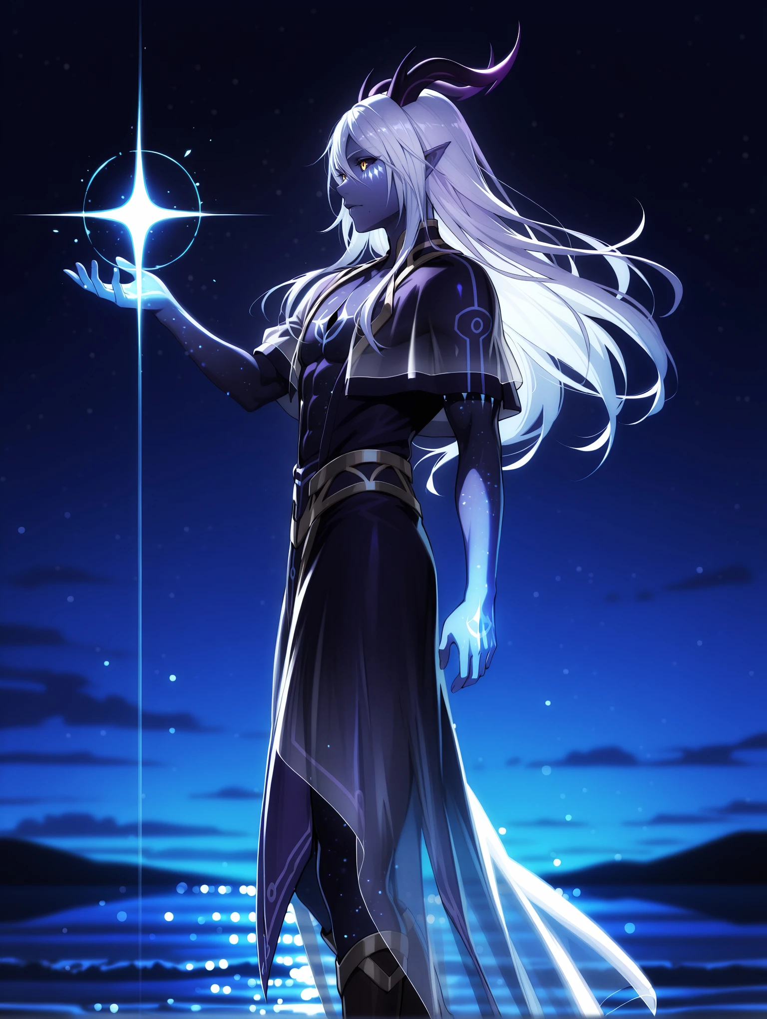 imtdaaravosnocape, 1boy, male, fit body, toned, colored skin, long hair, horns, pointy ears, white hair, colored sclera, black sclera, yellow eyes, tattoo, face marks, bangs, hair between eyes, blue skin, purple skin, grey skin, tunic, large tunic, capelet, see-through, golden belt, boots