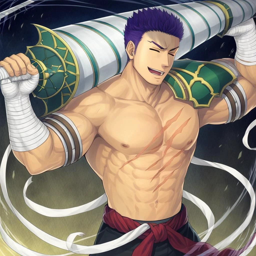 1male.fergus mac roich,muscule,purple hair,short hair,bandaged wrist,bandaged ankle,pants,loincloth,holding weapon