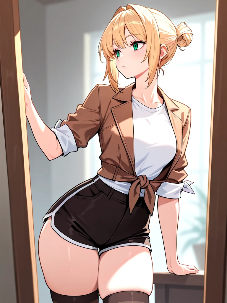 Atzbel, 1girl, blonde hair, hair bun, green eyes,