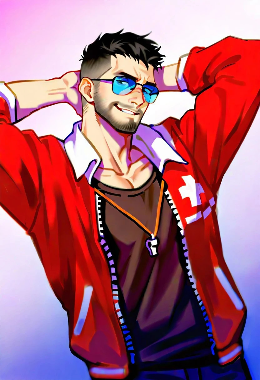 - DBDDavid_face02, black hair, short hair, crewcut, facial hair, thick stubble, aviator sunglasses,