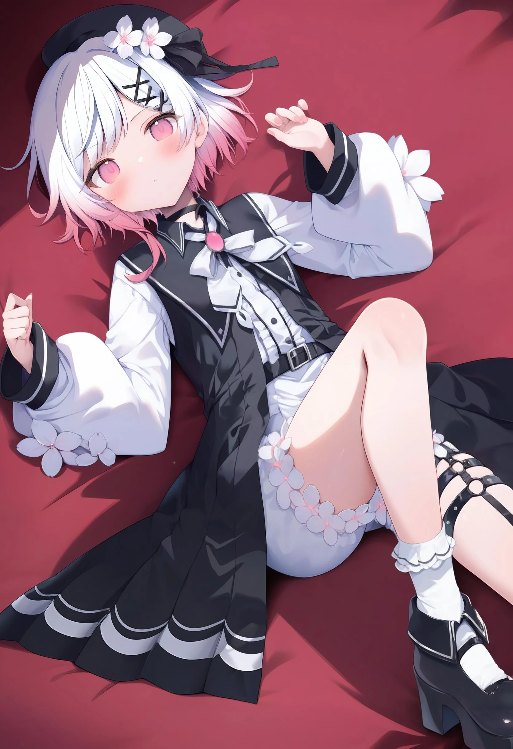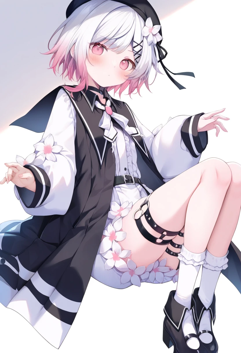 sakuraba ema, 1girl, short hair, long sleeves, hair ornament, white shirt, white hair, pink hair, multicolored hair, sidelocks, frills, open clothes, socks, puffy sleeves, hairclip, belt, hair flower, pink eyes, white dress, two-tone hair, streaked hair, sleeves past wrists, black headwear, thigh strap, neck ribbon, black ribbon, gradient hair, black choker, buttons, swept bangs, beret, black beret, white socks, white bow, x hair ornament, brooch, white ribbon, puffy long sleeves, buckle, o-ring, black belt, black coat, open coat, sleeveless coat, belt buckle, collared coat, hat flower, platform footwear, platform shoes, colored tips, bobby socks, legwear garter, o-ring thigh strap, frilled socks, single garter strap, o-ring belt, single sidelock, center frills,