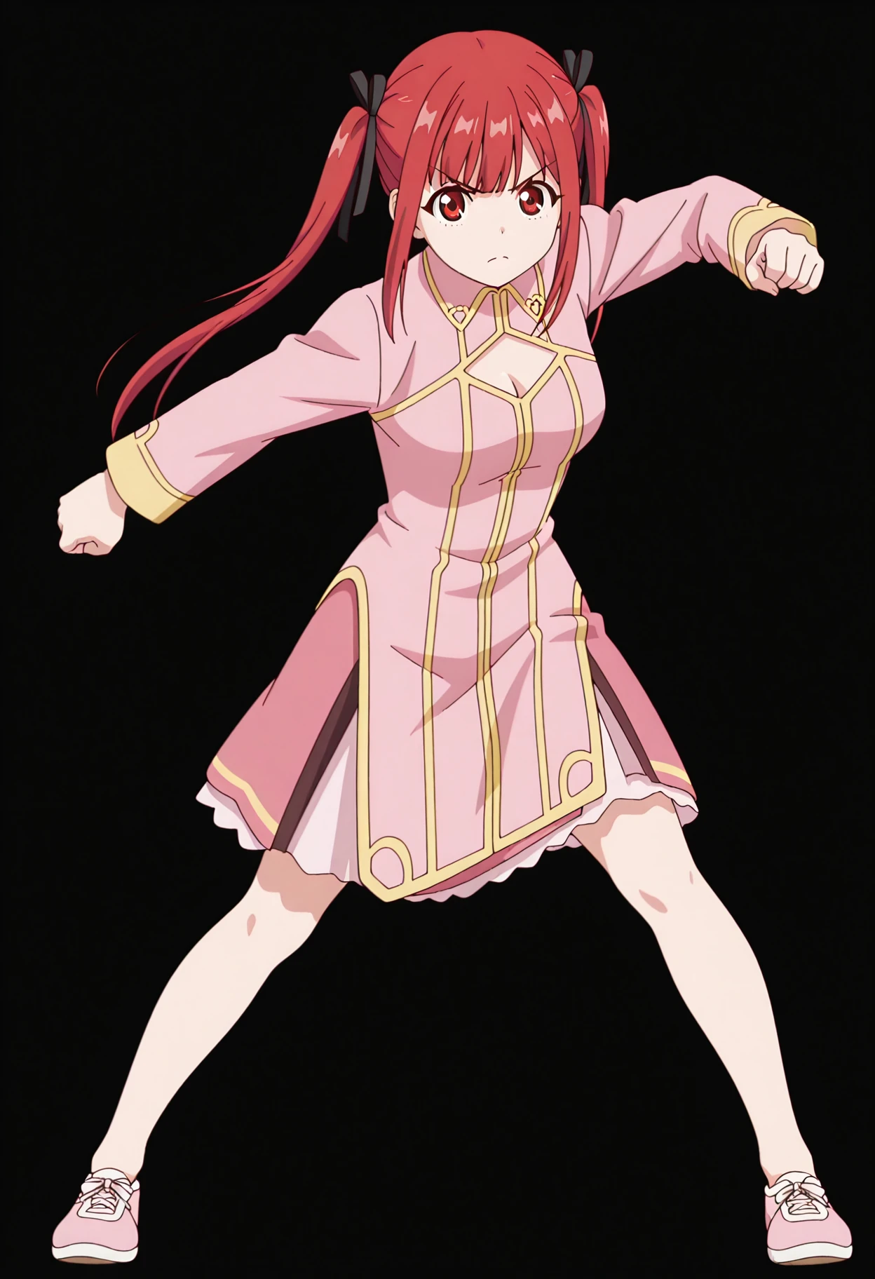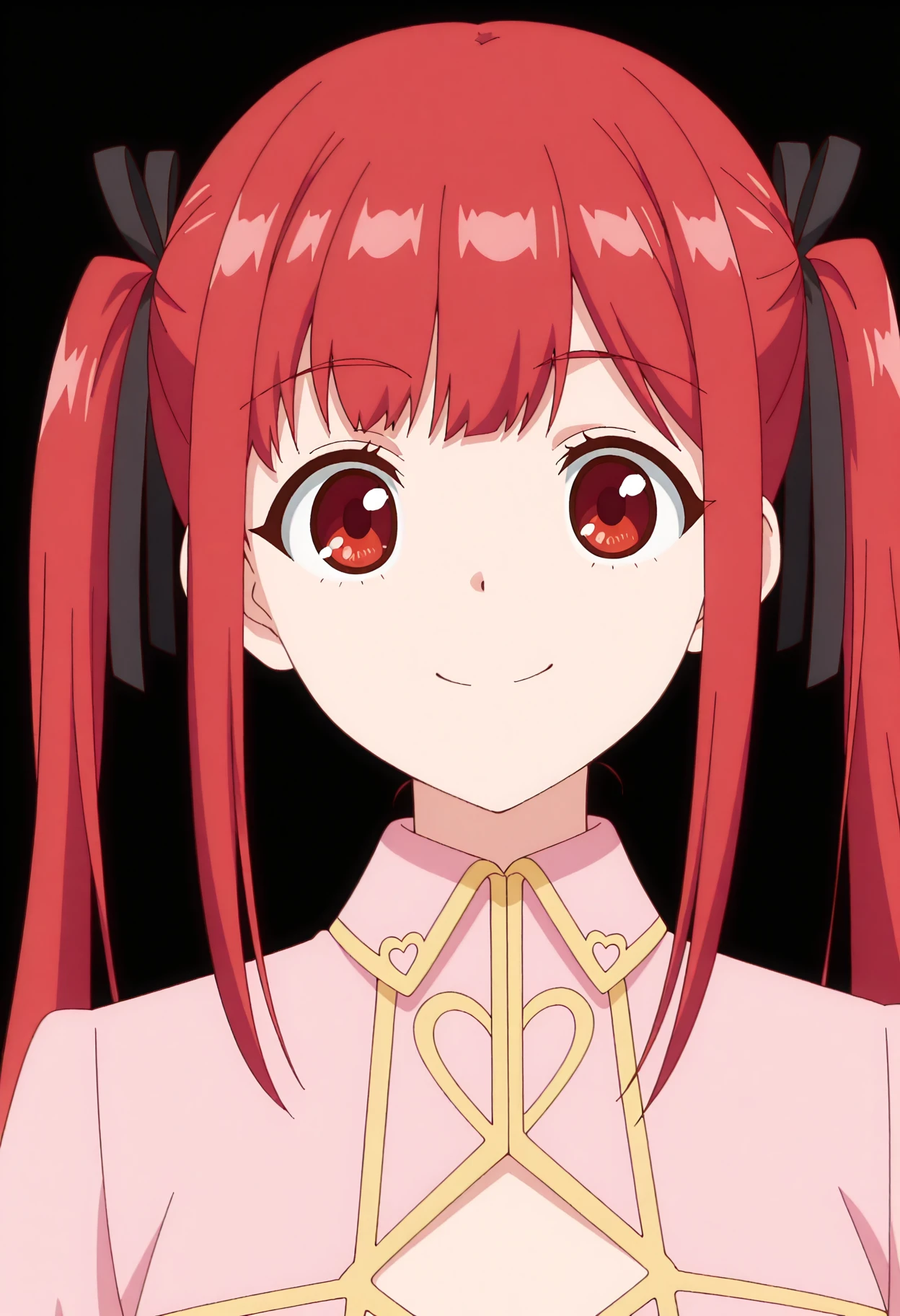1girl, solo, muria, long hair, red hair, hair ribbon, red eyes, bangs, black ribbon, sidelocks