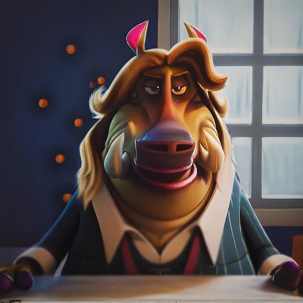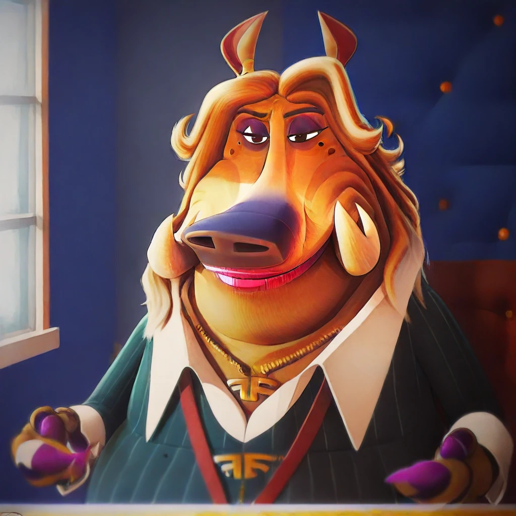 Flo(character), female, warthog, tusks, chubby, furry, anthro, blonde hair,