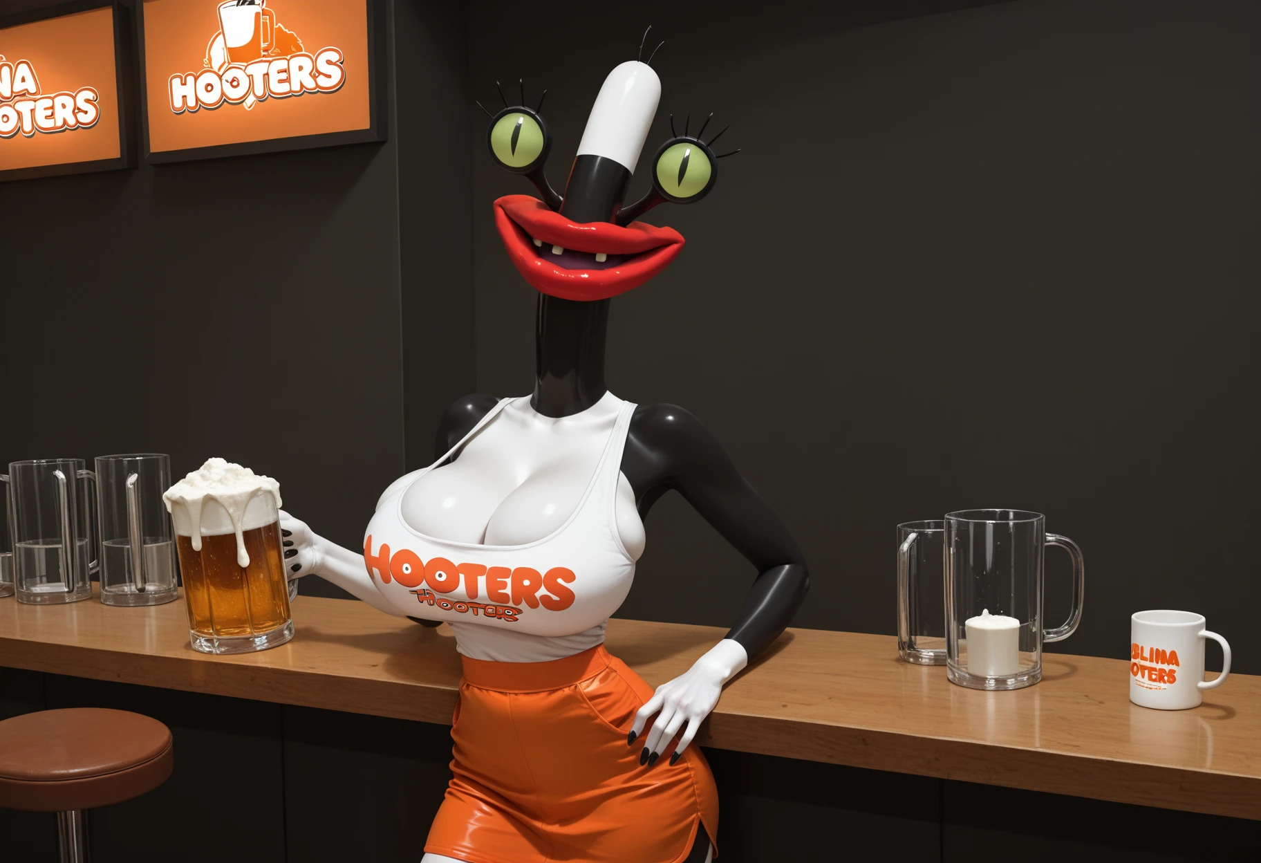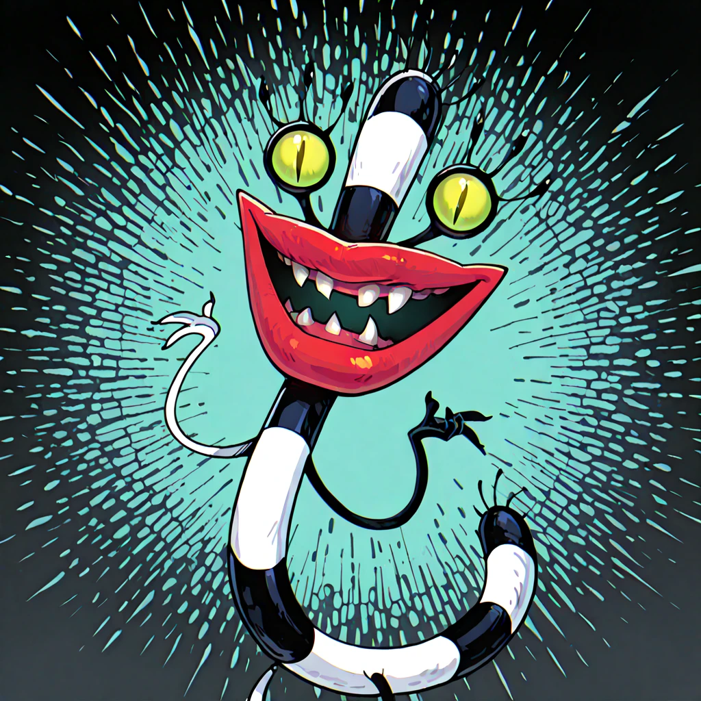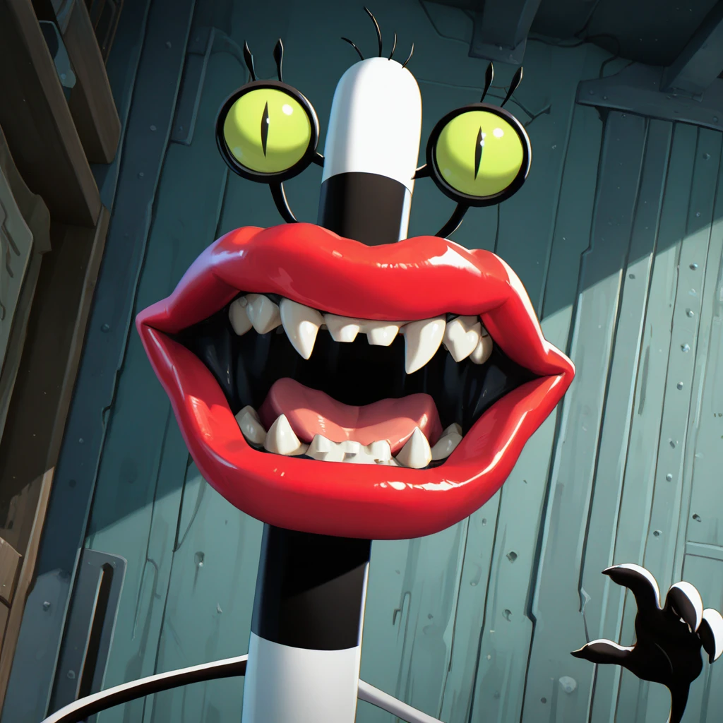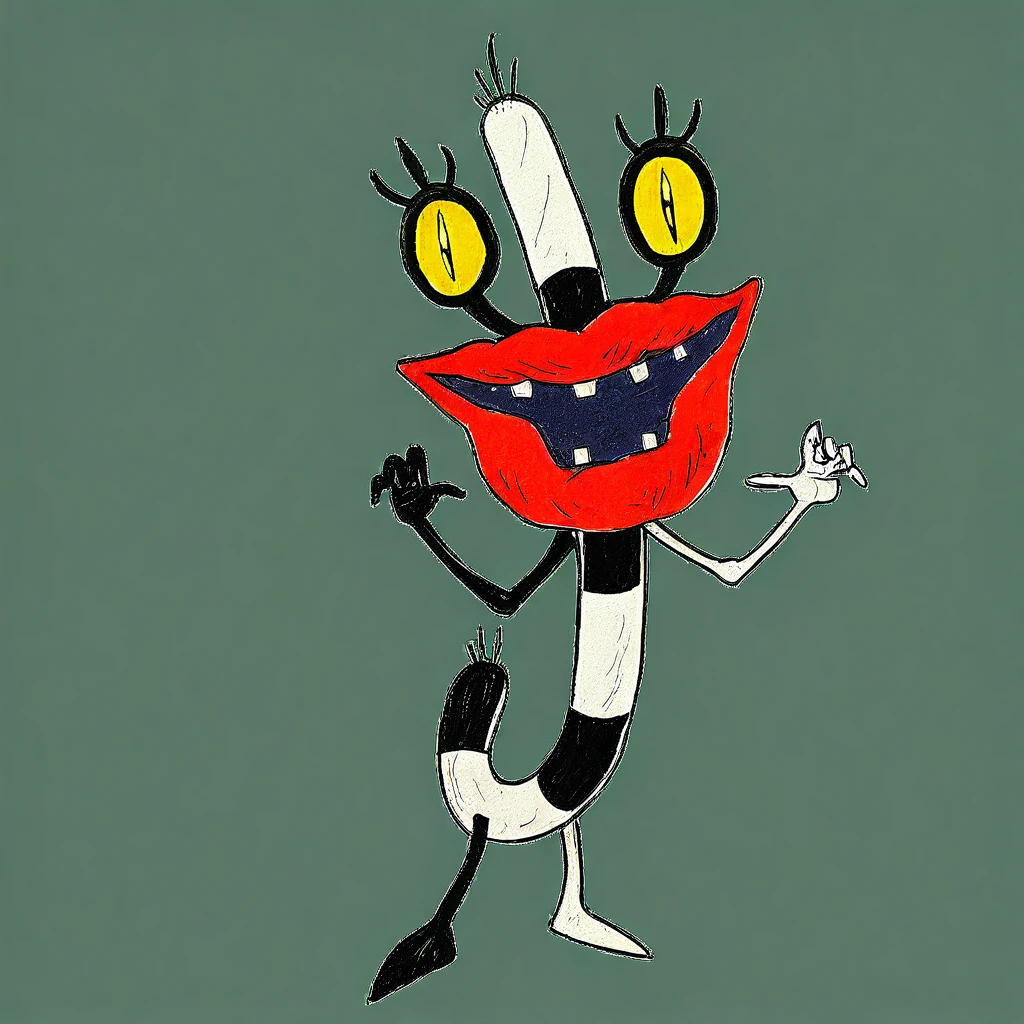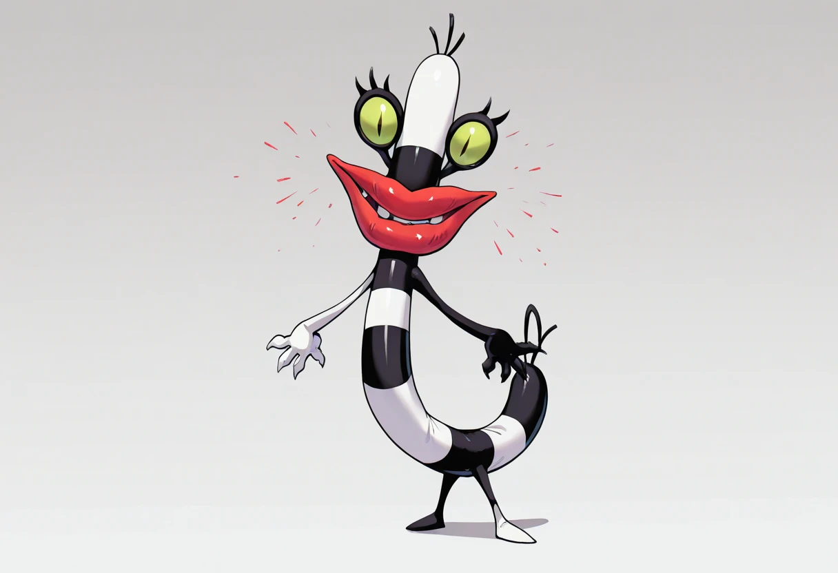 Tags: black-white skin, big red lips, eyelashes, green eyes, slit pupils, crooked teeth, no humans, legs [needed sometimes]