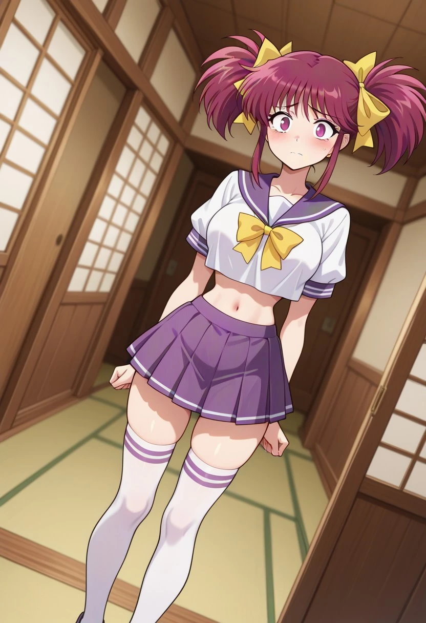 Xentarg1rl, 1girl, slender body, thin build, narrow waist, long legs, reddish large expressive eyes, muted light red hair, twin side ponytails, long face-framing sidelocks, yellow bows tied to the ponytails, ,purple inner collar, , short cropped sailor-style top, sailor collar top with attached yellow bow, near-white lavender and purple cropped top exposing midriff, visible stomach, pleated purple skirt, white thigh-high socks with purple stripes, purple low shoes,