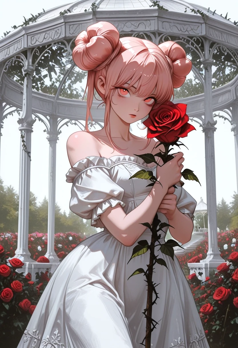 lunarose, double bun, long sleeved crop top, pink skirt,