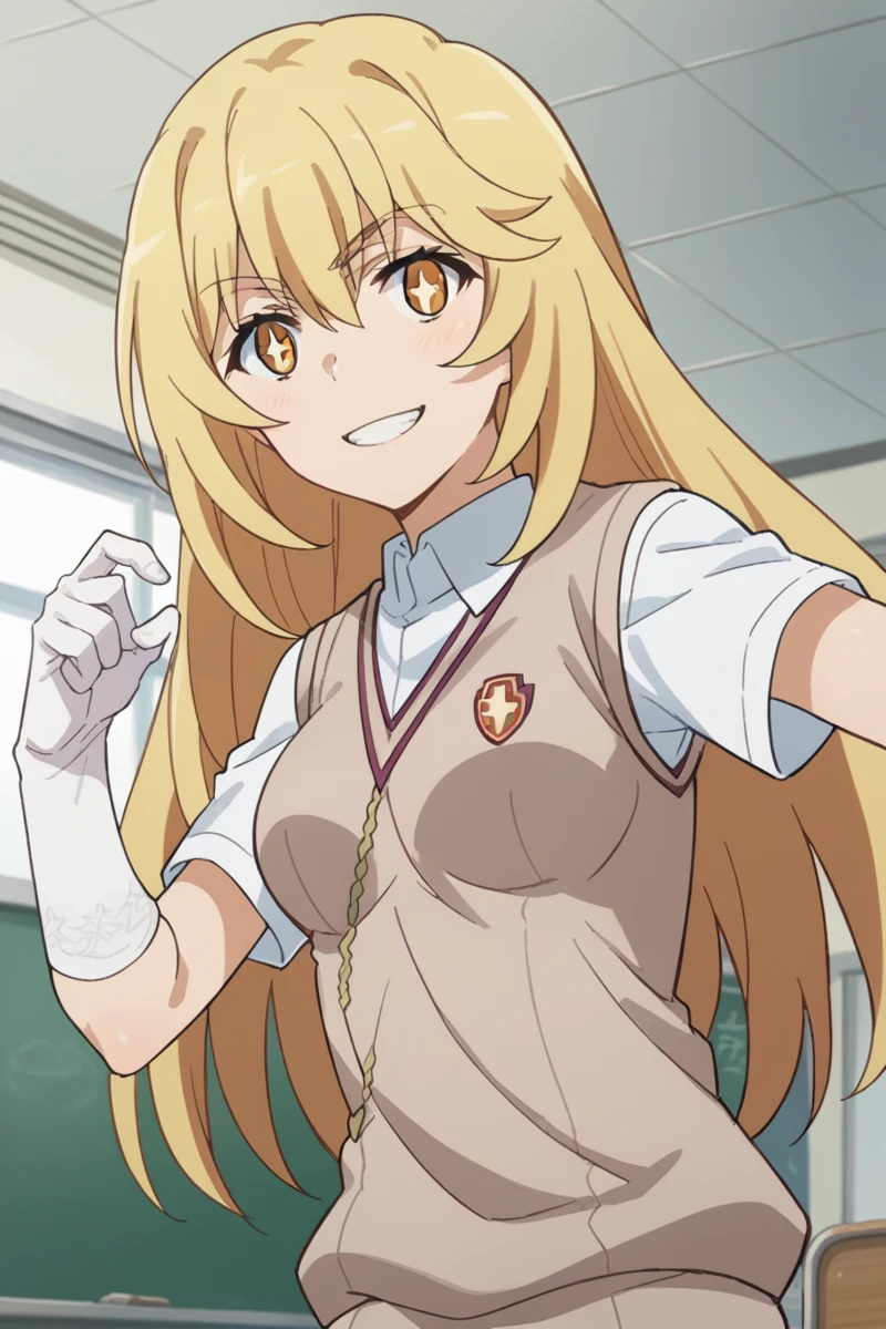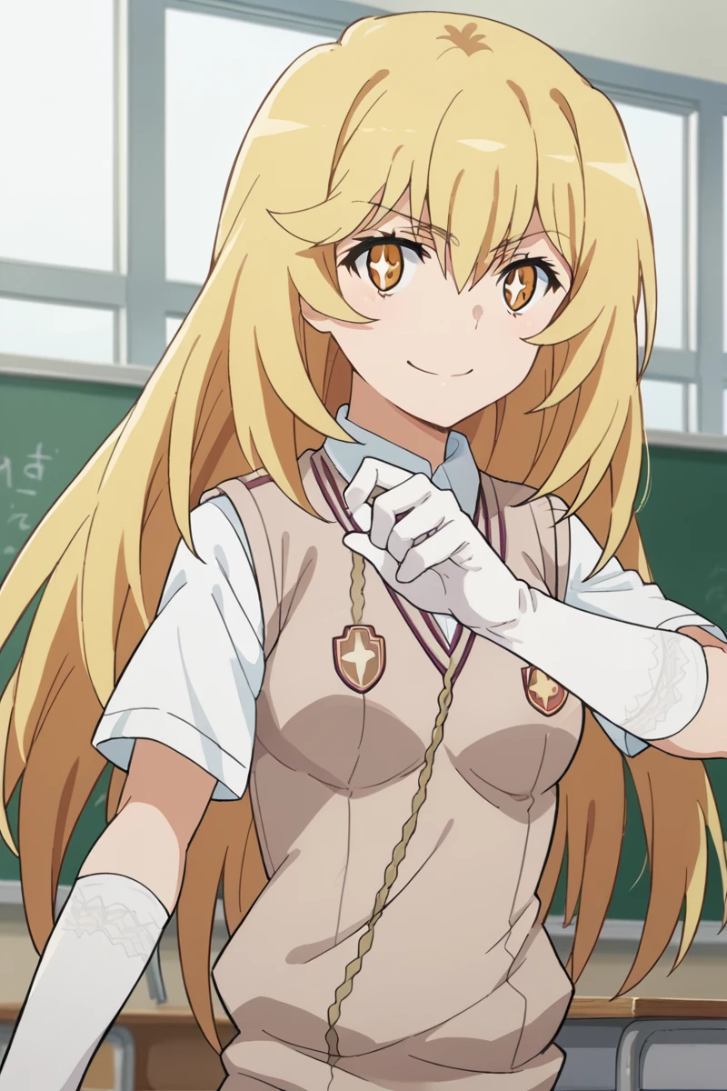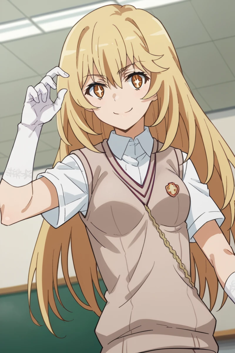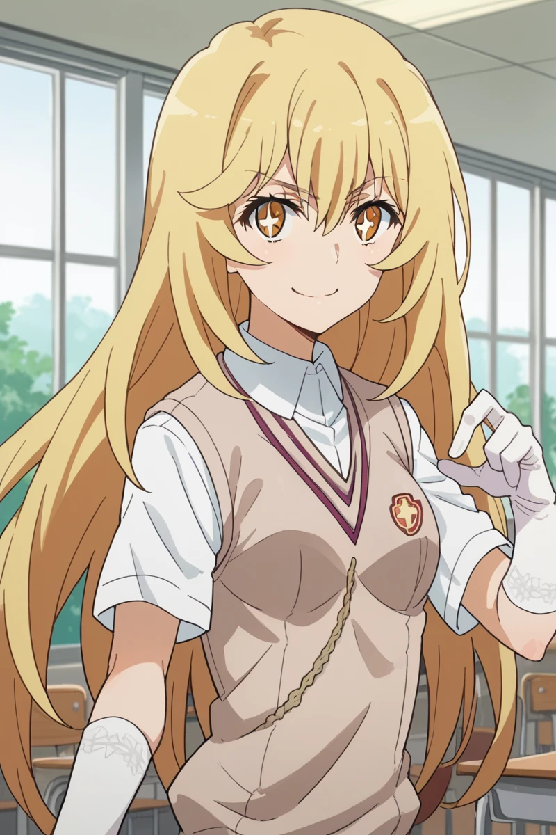 elbow gloves, gloves, school uniform, short sleeves, summer uniform, sweater vest, tokiwadai school uniform, white gloves, light brown sweater vest,