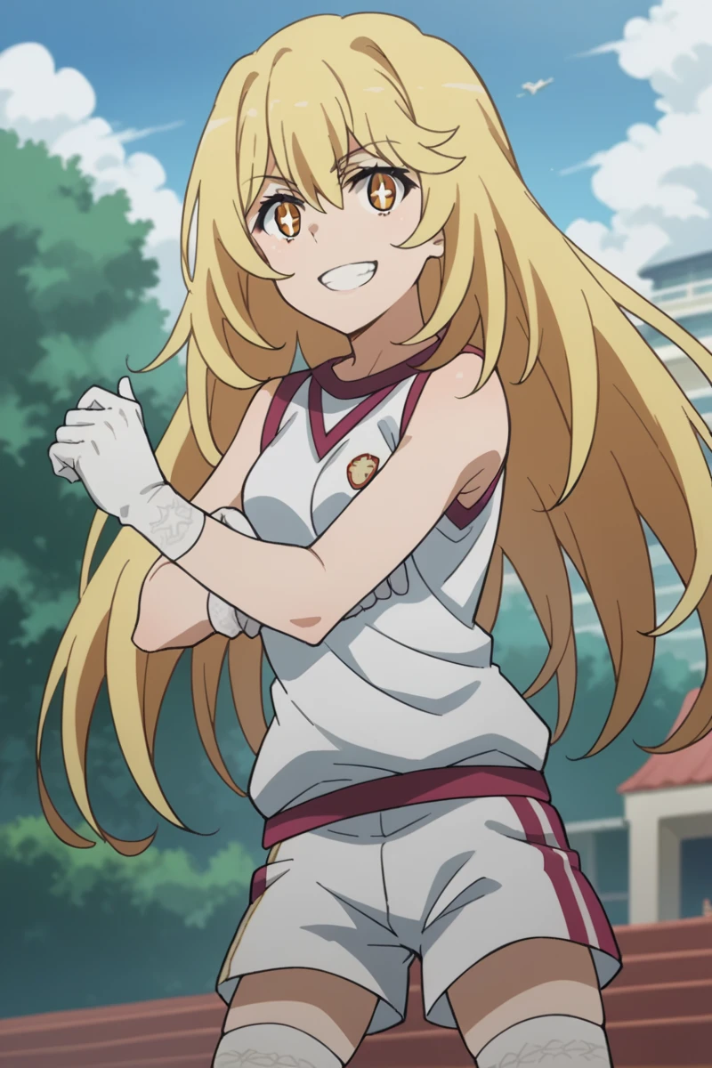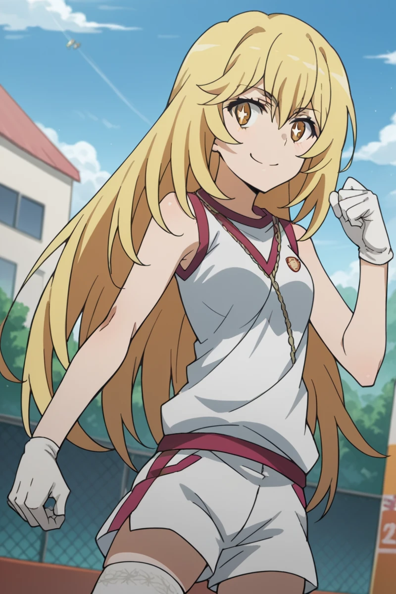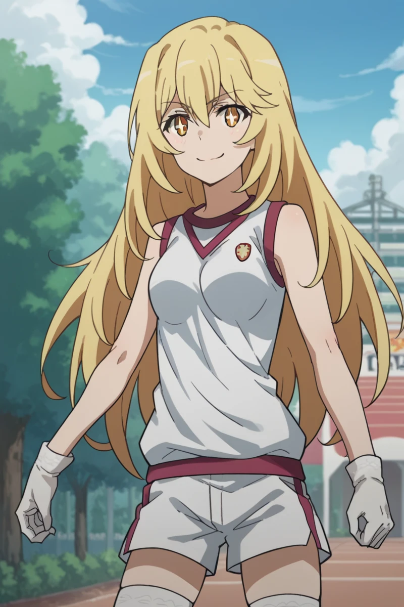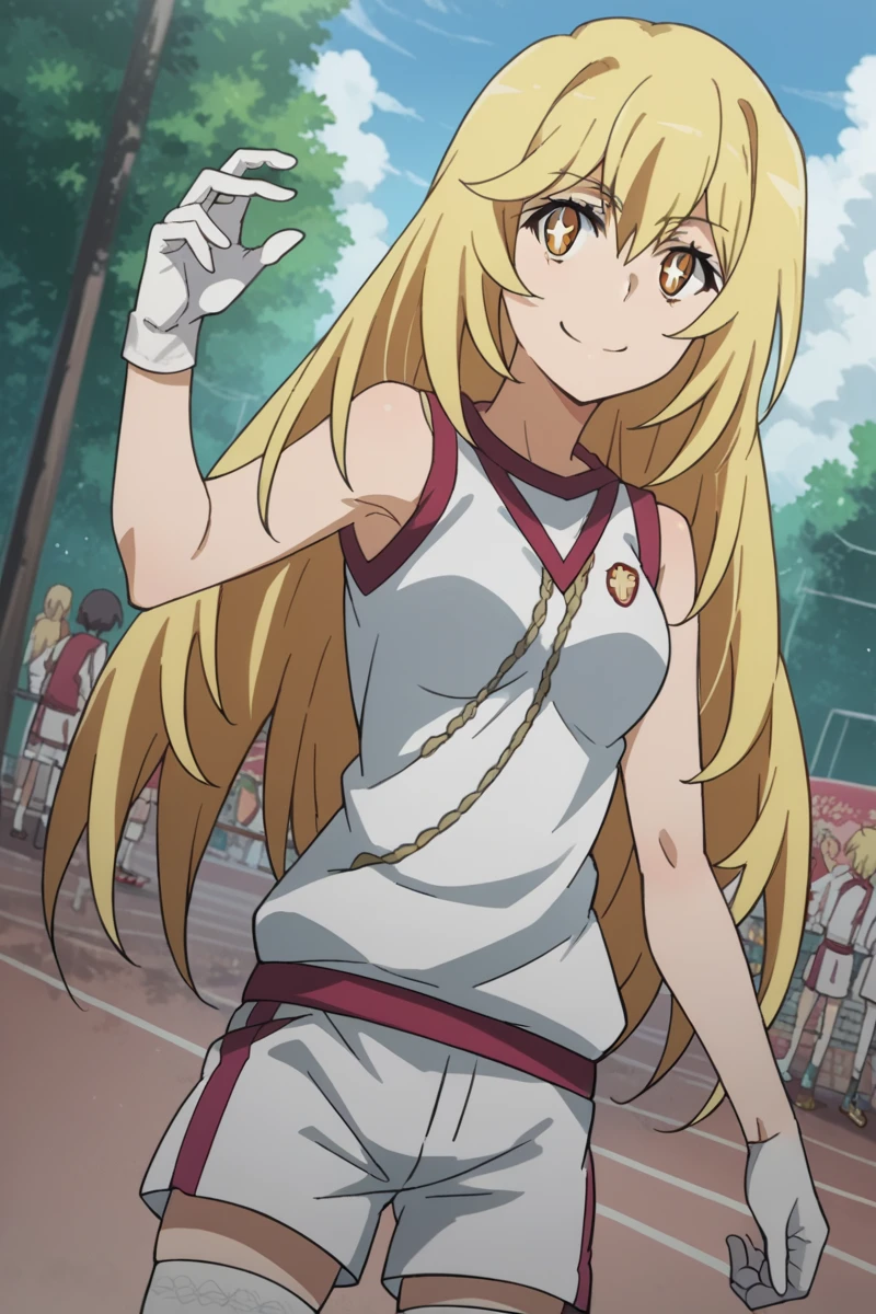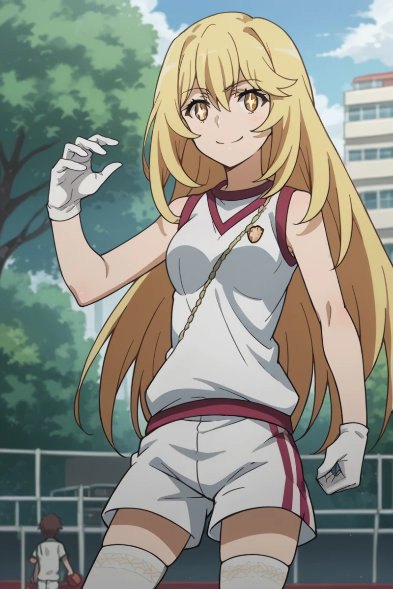 bare shoulders, gloves, gym shirt, gym shorts, gym uniform, shirt, short shorts, shorts, sleeveless, sleeveless shirt, thighhighs, tokiwadai school gym uniform, white gloves, white shirt, white shorts, white thighhighs,