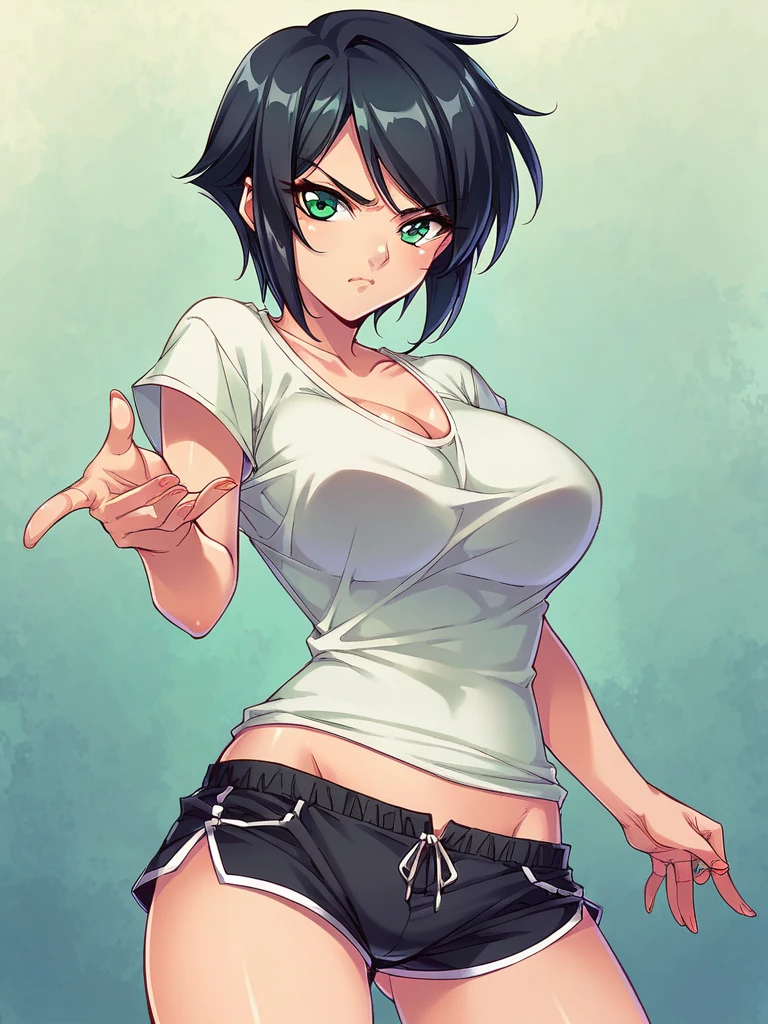 naomi evans, black hair, medium hair, bangs, red eyes,