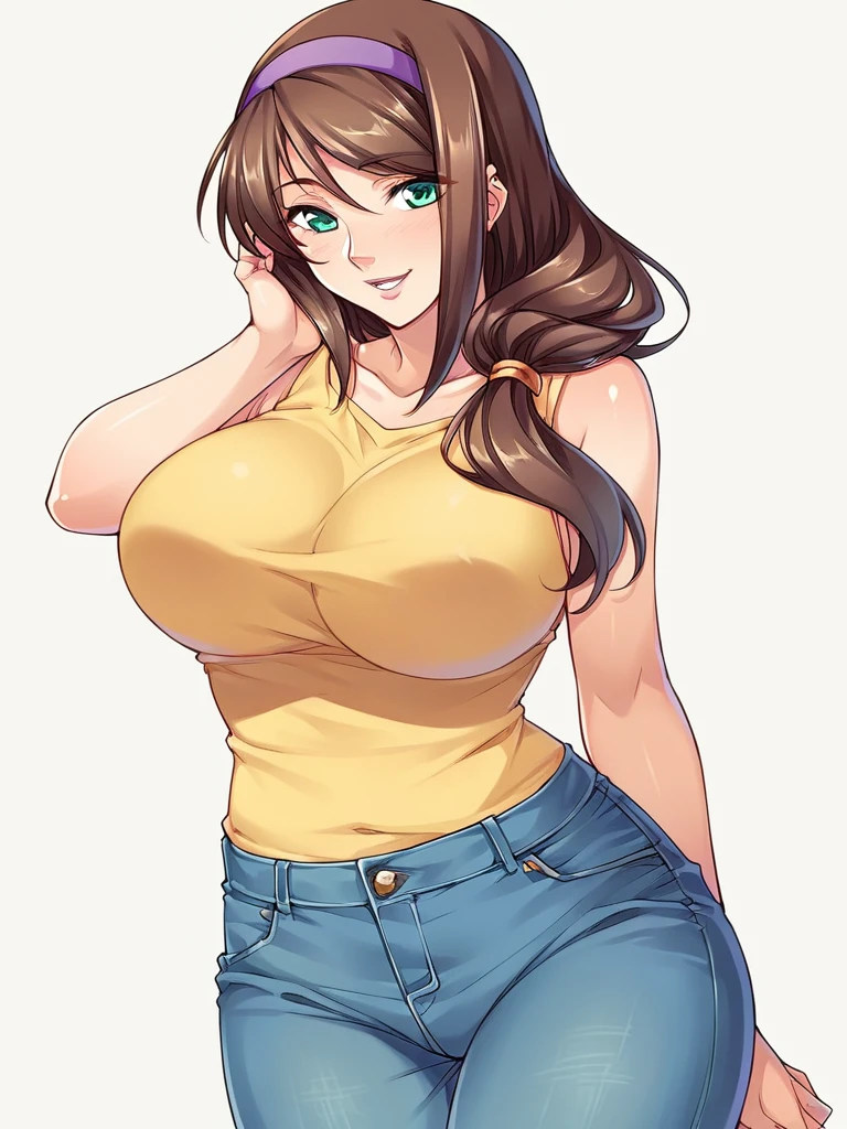 natsume sayoko, green eyes, brown hair, long hair, low-tied long hair, hairband, mature female,