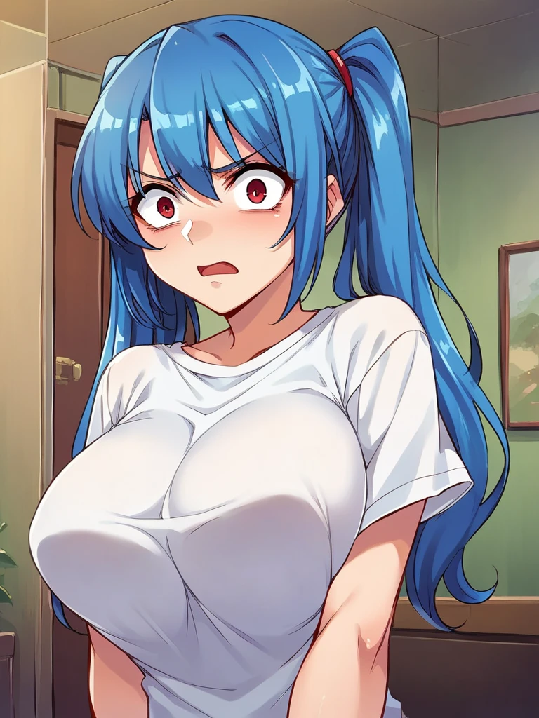 alicia viewstream, blond hair, long hair, wavy hair, parted bangs, red eyes,