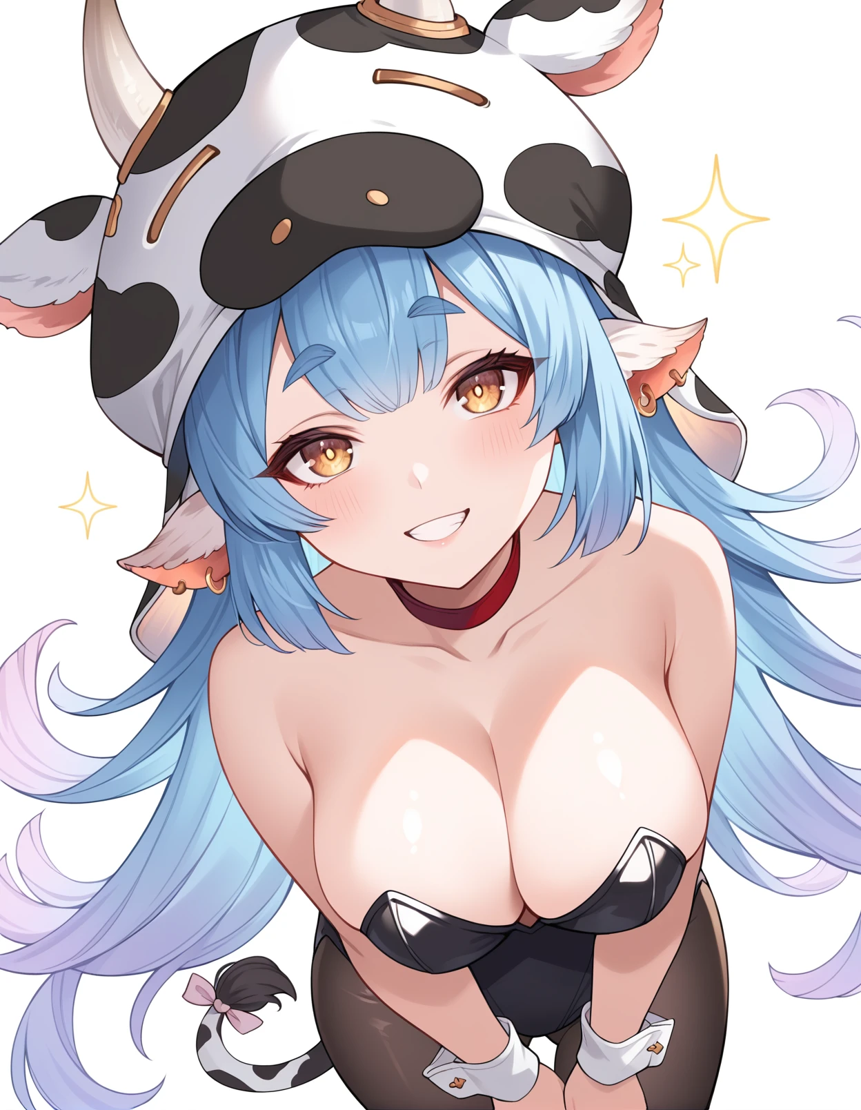 Trigger Words: catura \(granblue fantasy\), 1girl, draph, cow ears, cow horns, cow tail, long hair, blue hair, yellow eyes